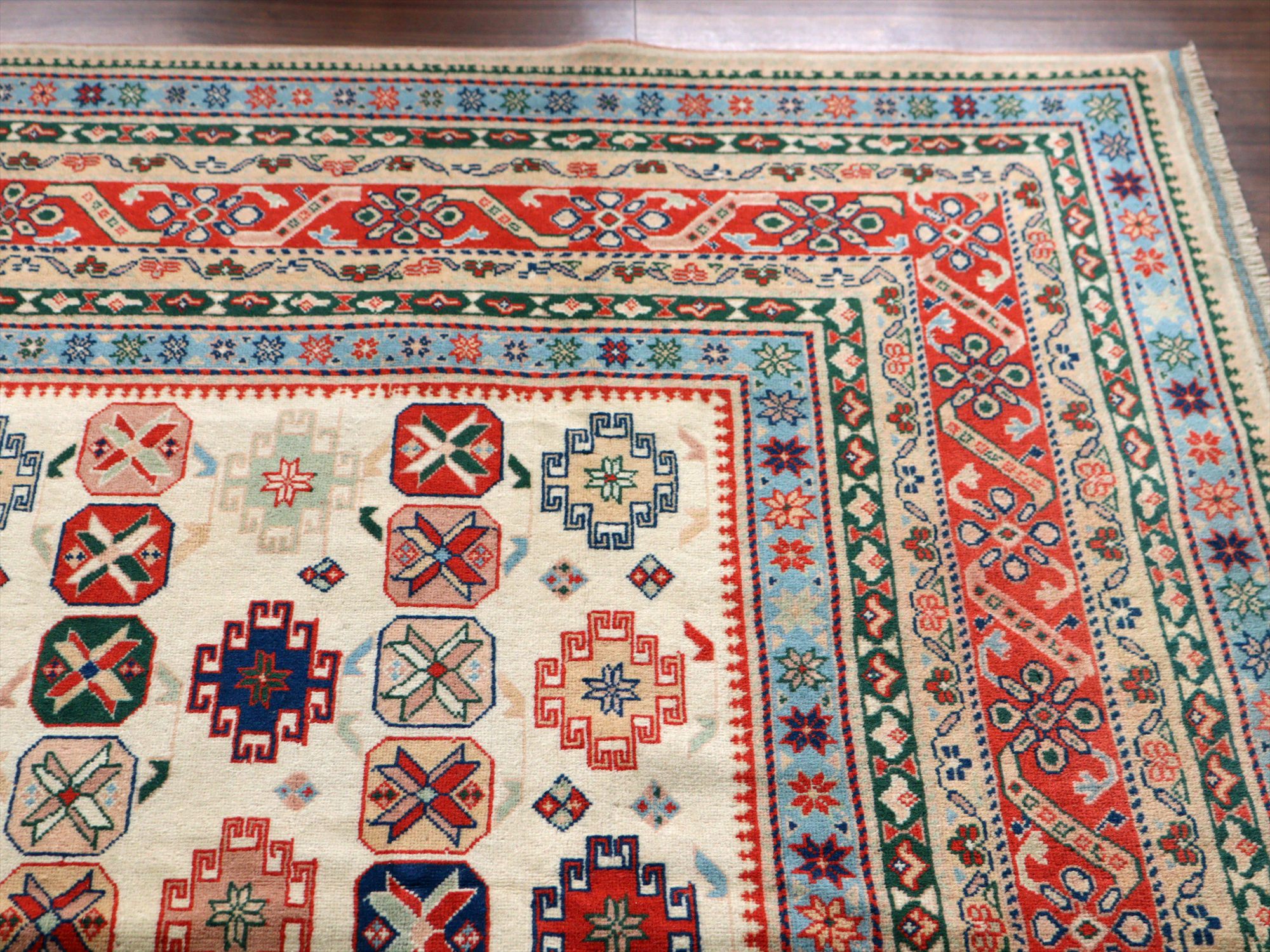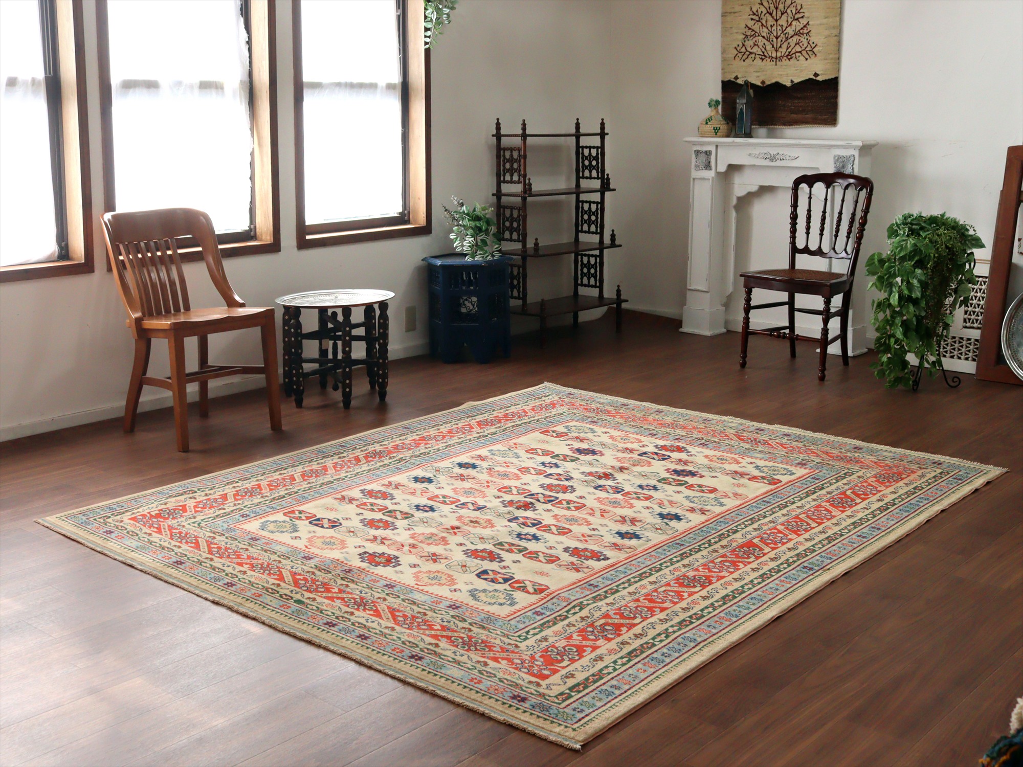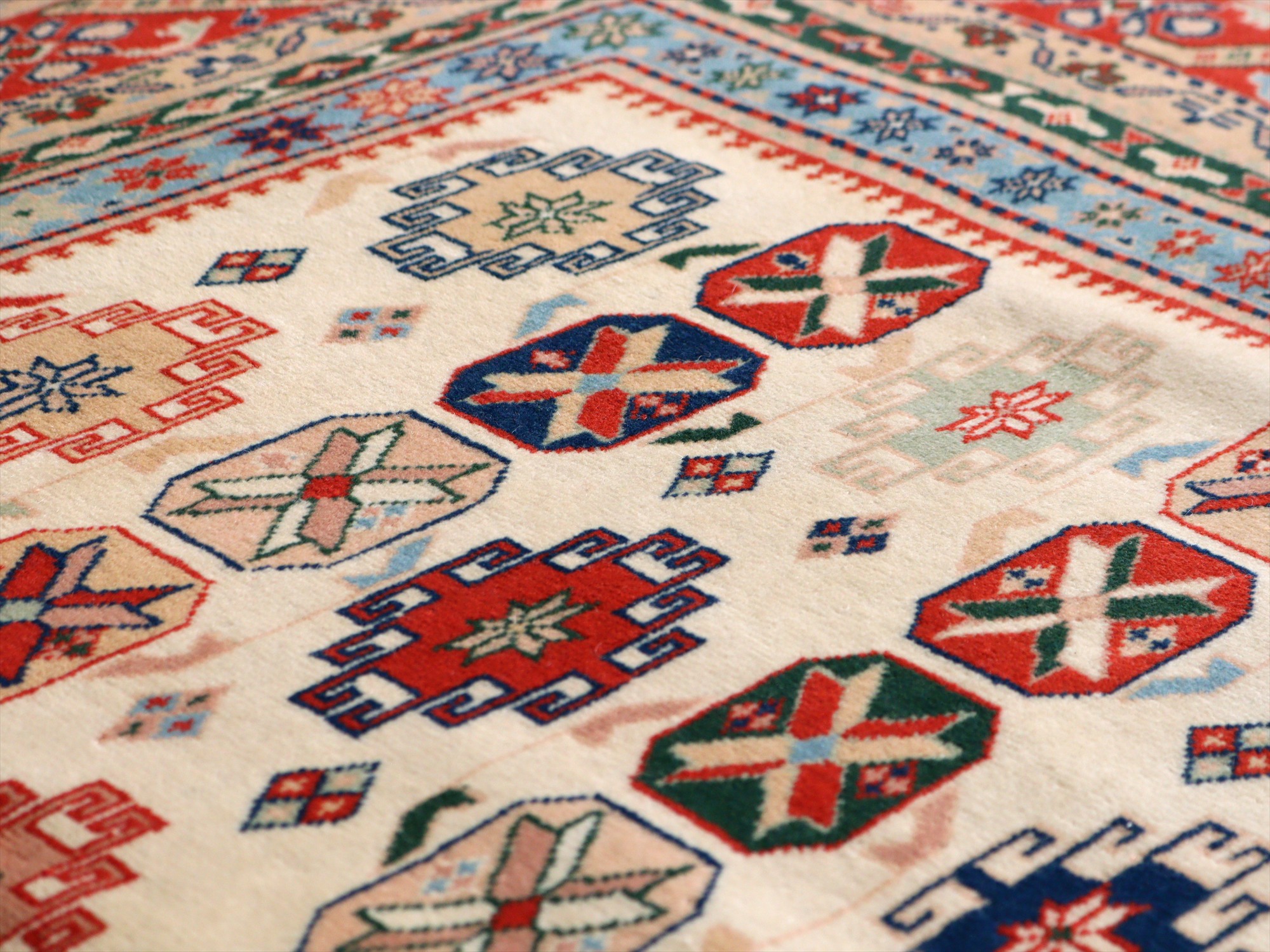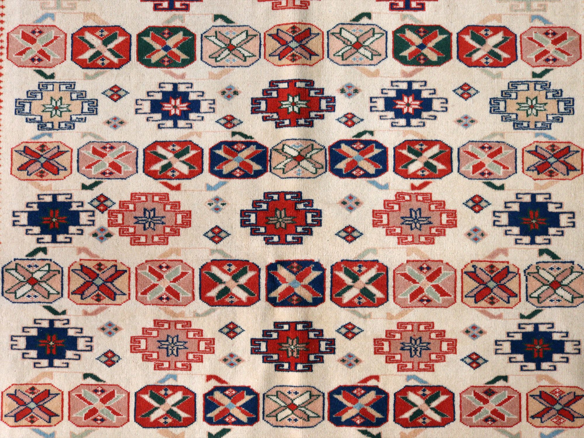 縦糸にはコットンが使われています。また、パイルの長さが比較的均一で整っていることから、もともと輸出向けに工房で織られたものと思われます。