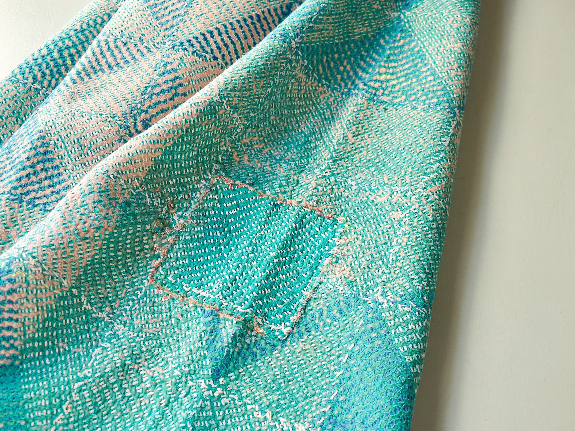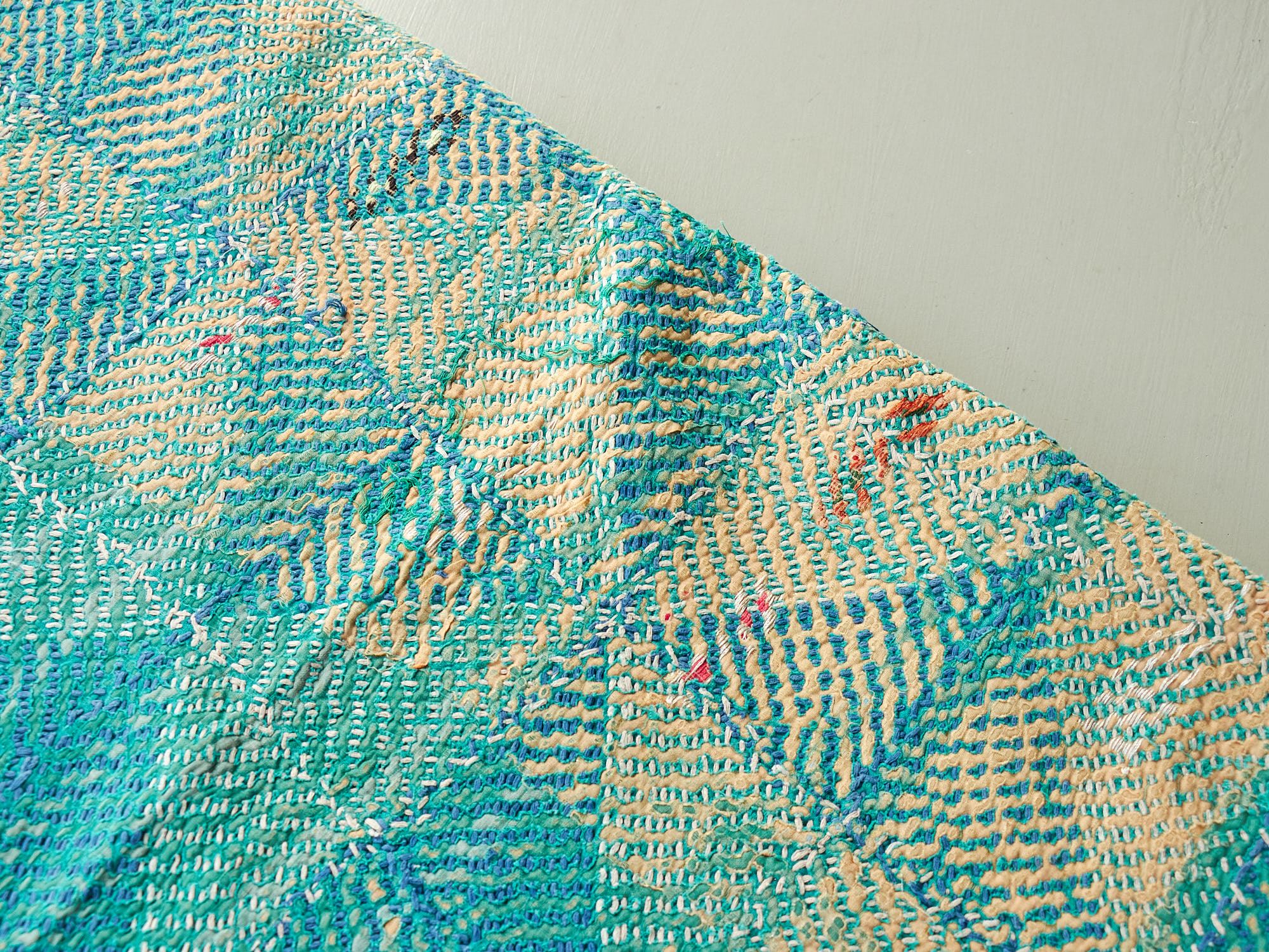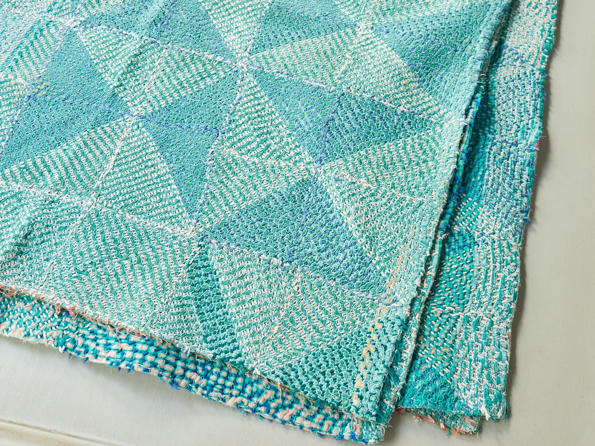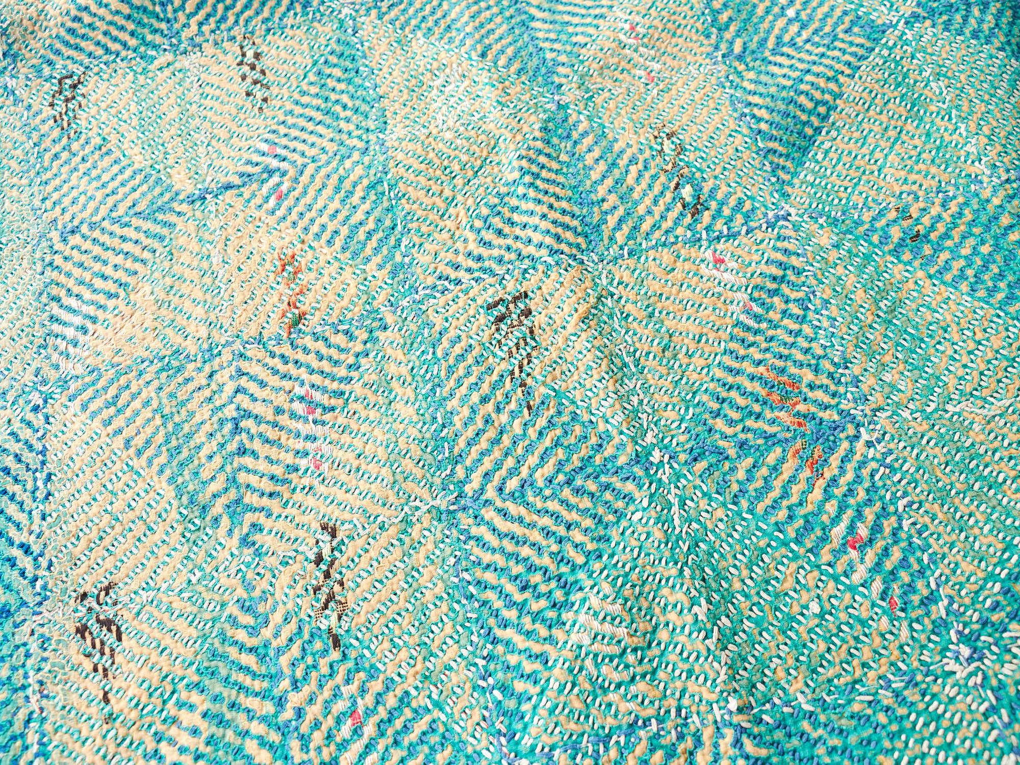 インド カンタ刺繍 パッチワーク ラリーキルト ヴィンテージ174×145cm Kantha embroidery India グリーン タイル
