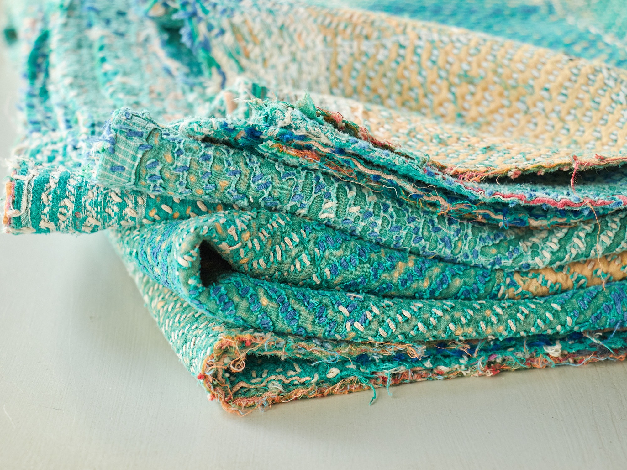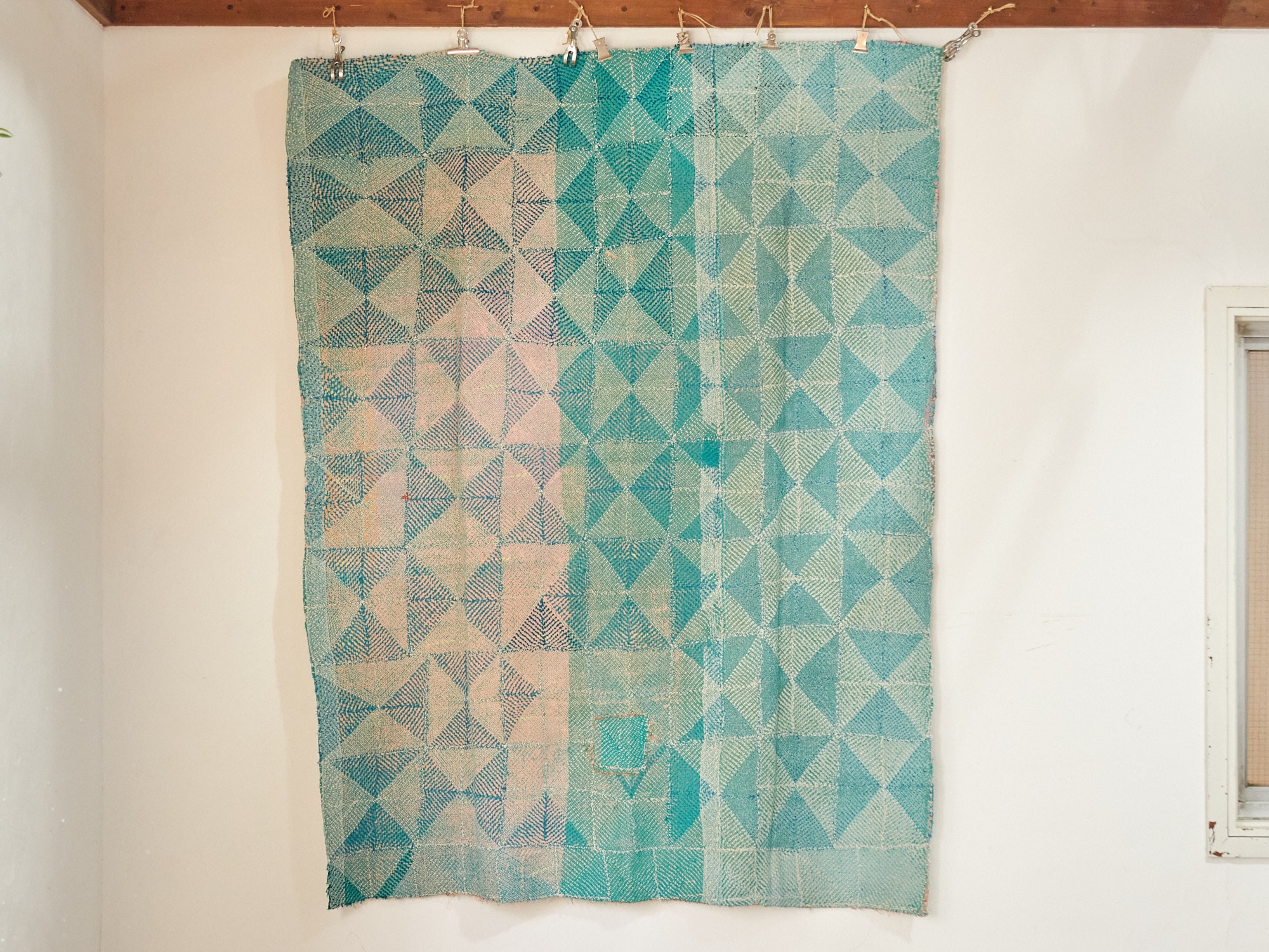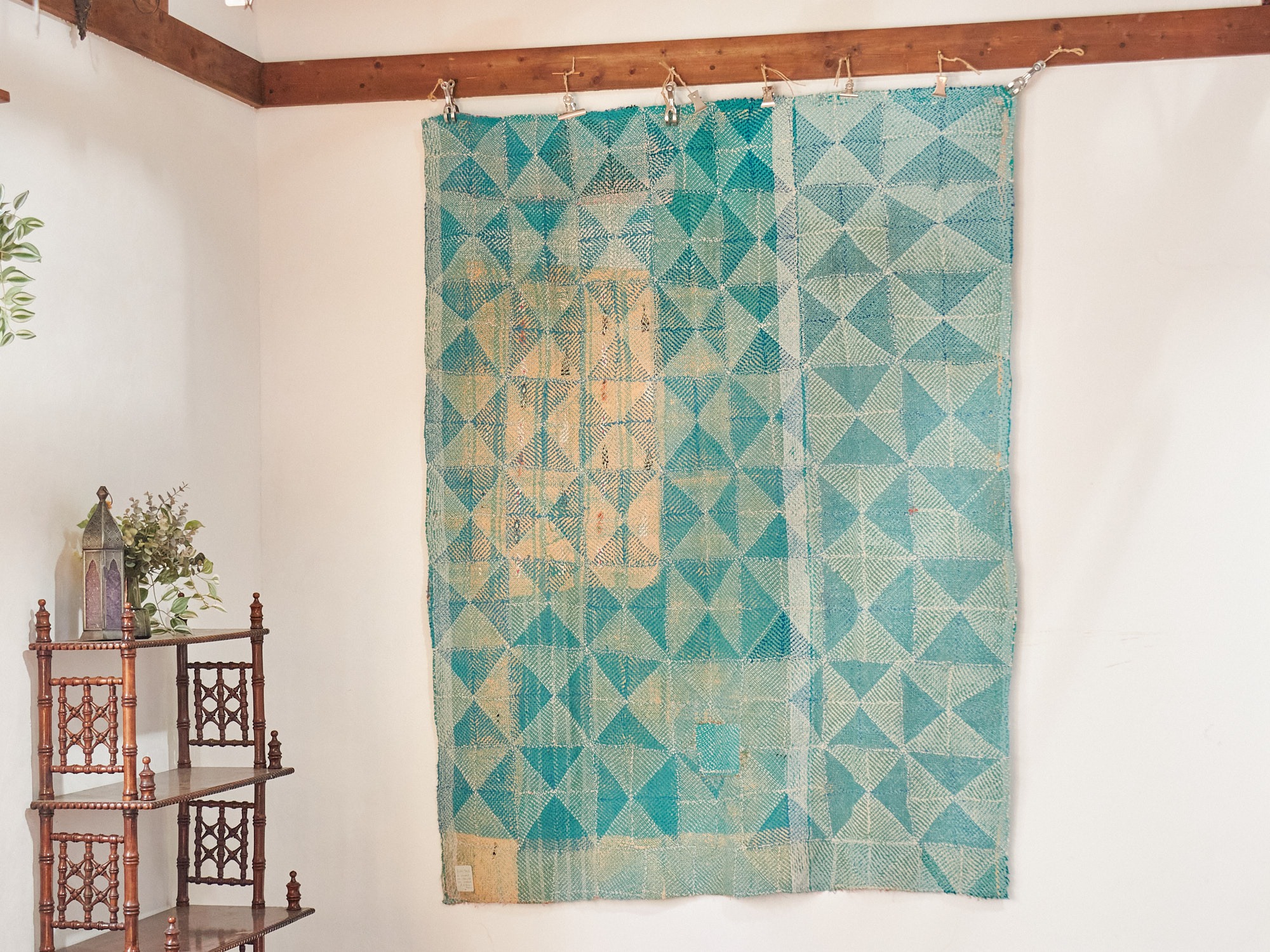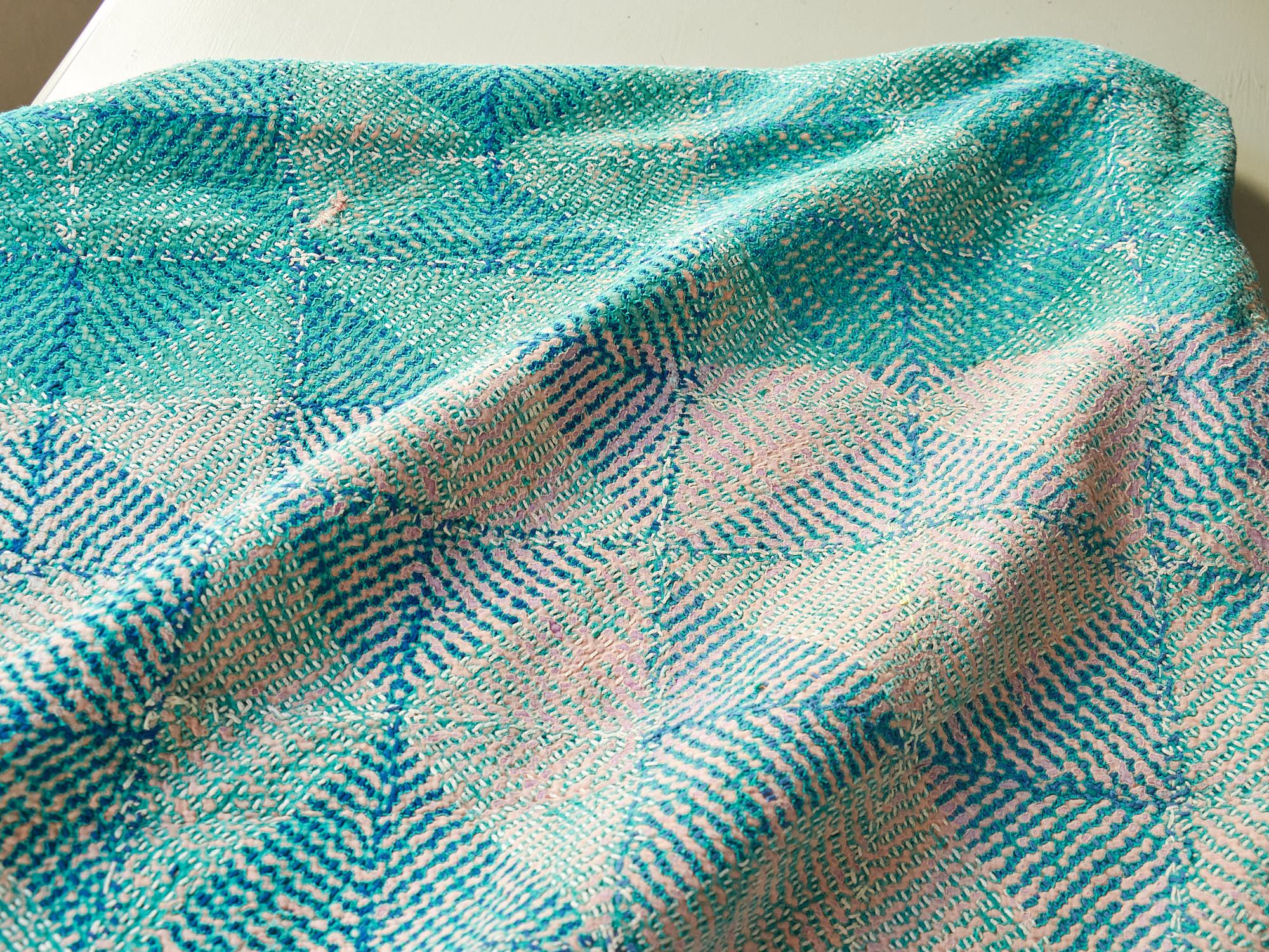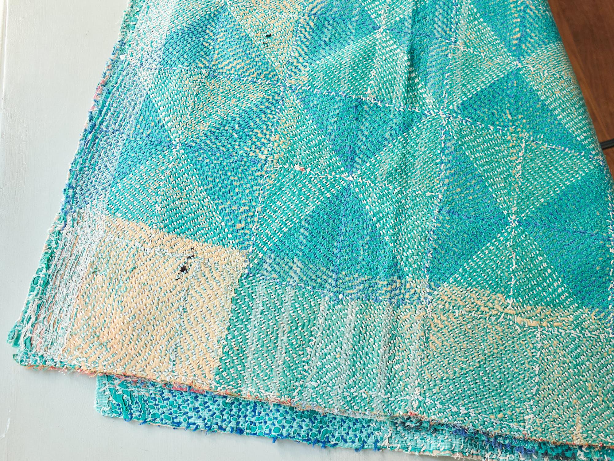 インド カンタ刺繍 パッチワーク ラリーキルト ヴィンテージ174×145cm Kantha embroidery India グリーン タイル