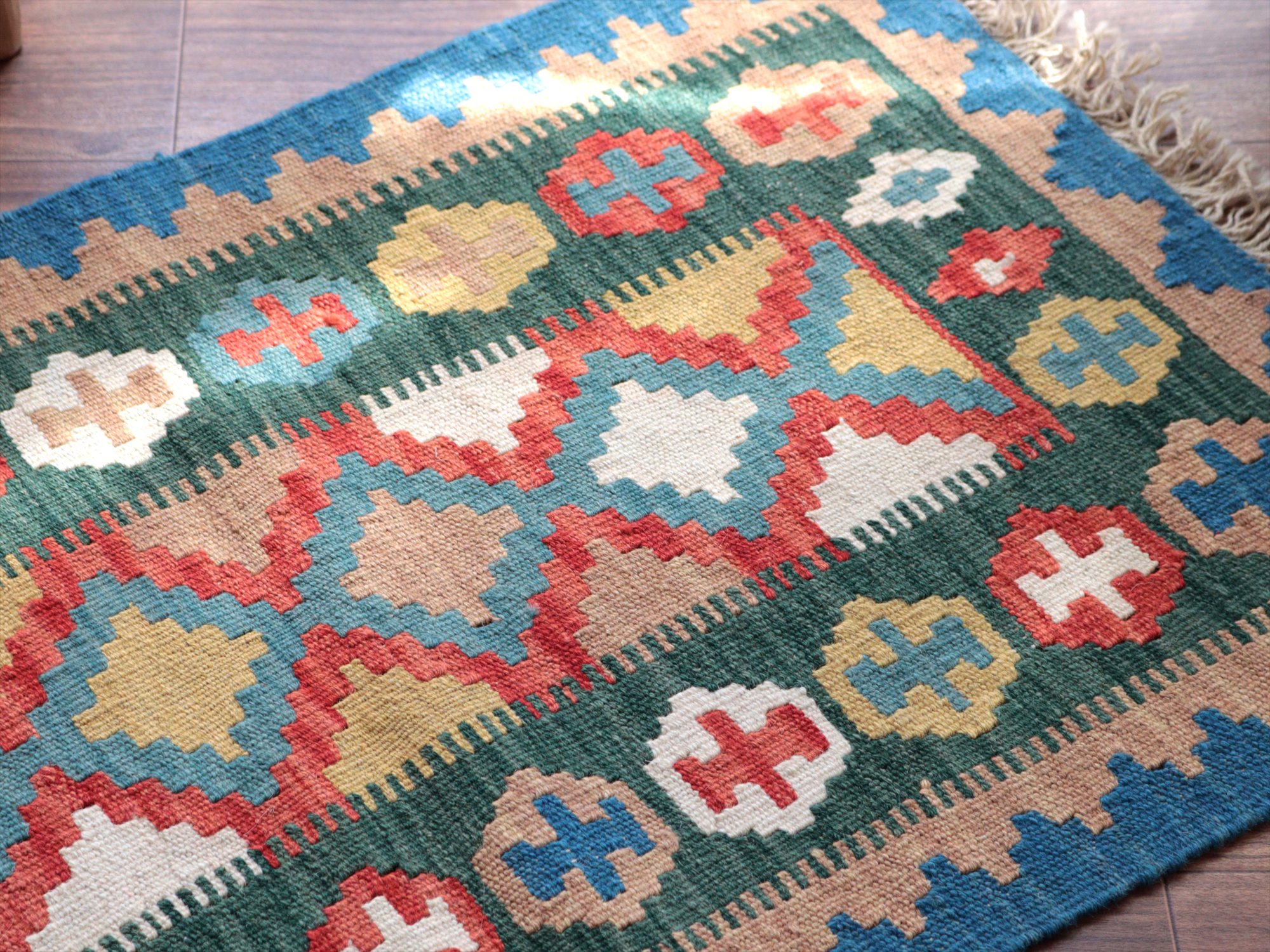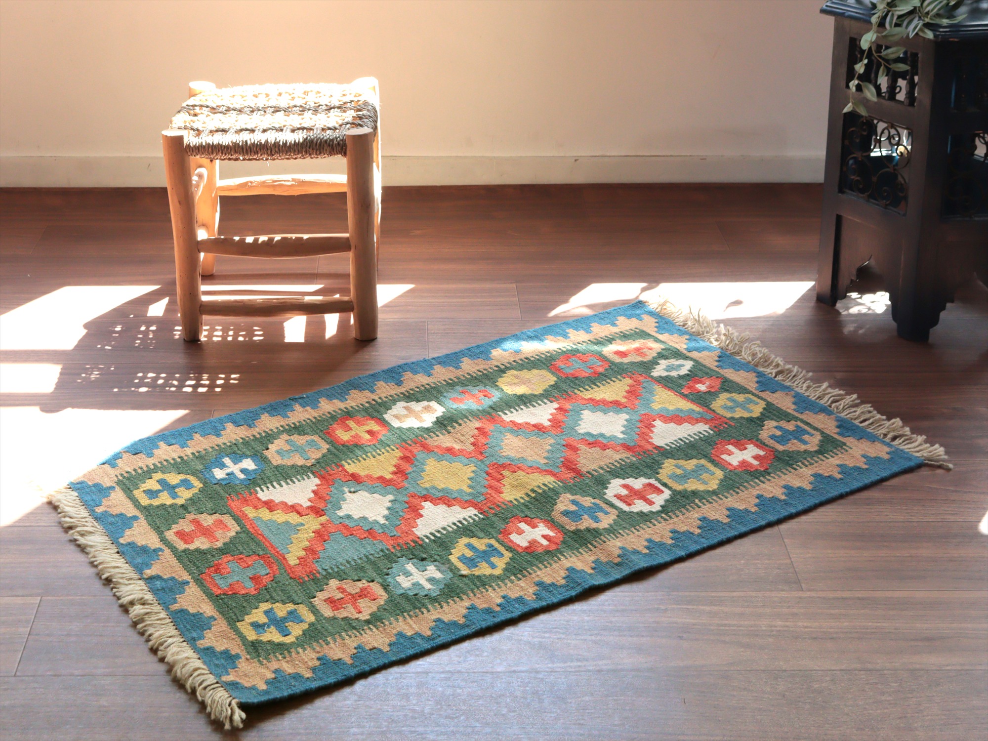 6-7mm程度の厚みがあり、パイル(毛足)がない平織りの敷物で表面は少しザラっとした肌ざわりです。織り手の自由なアイデアでデザインされていますので、左右対象でなかったり、モチーフが少しずれていたりということもありますが、世界で一枚だけの作品ですからその点はご了承ください。