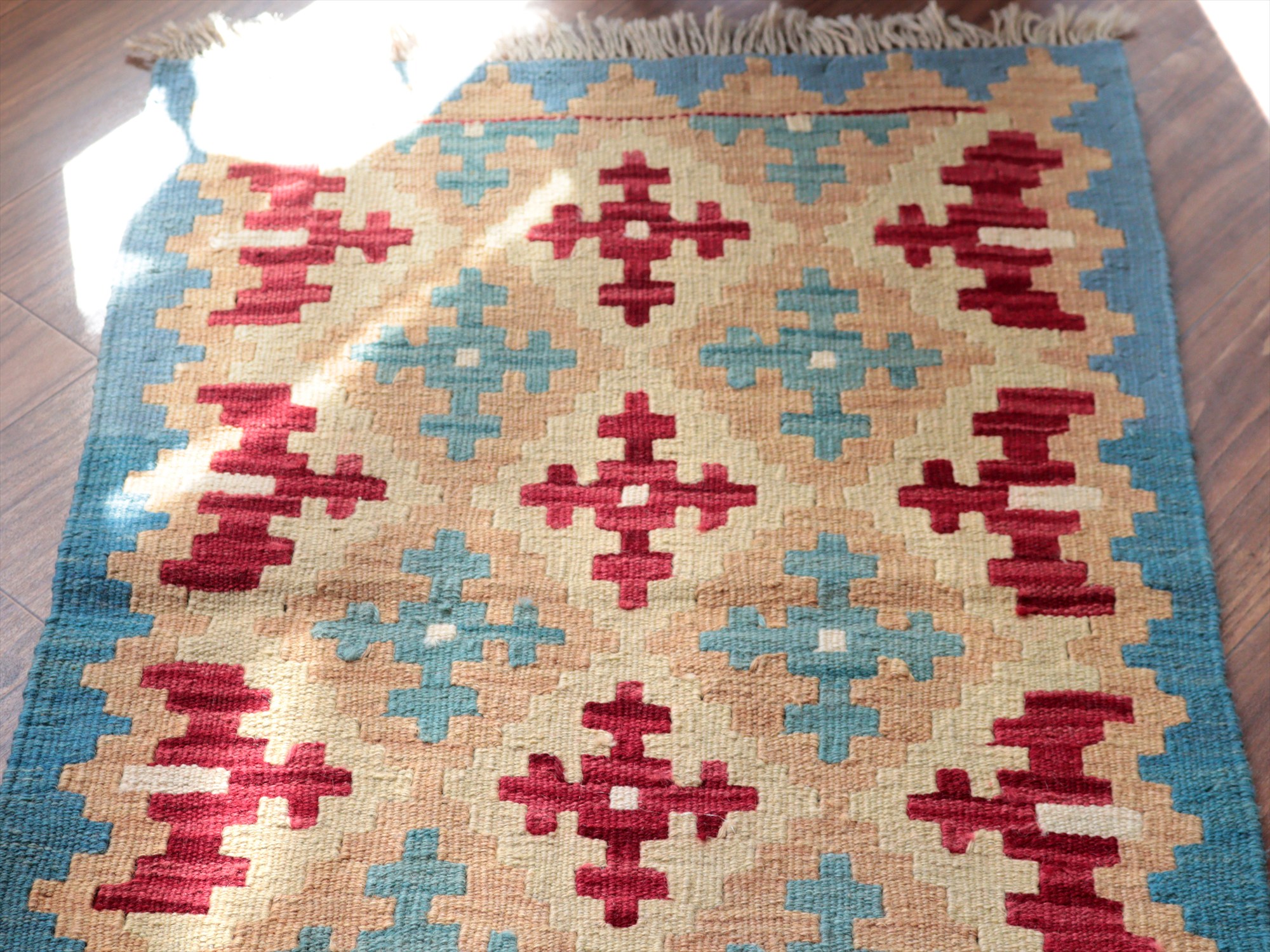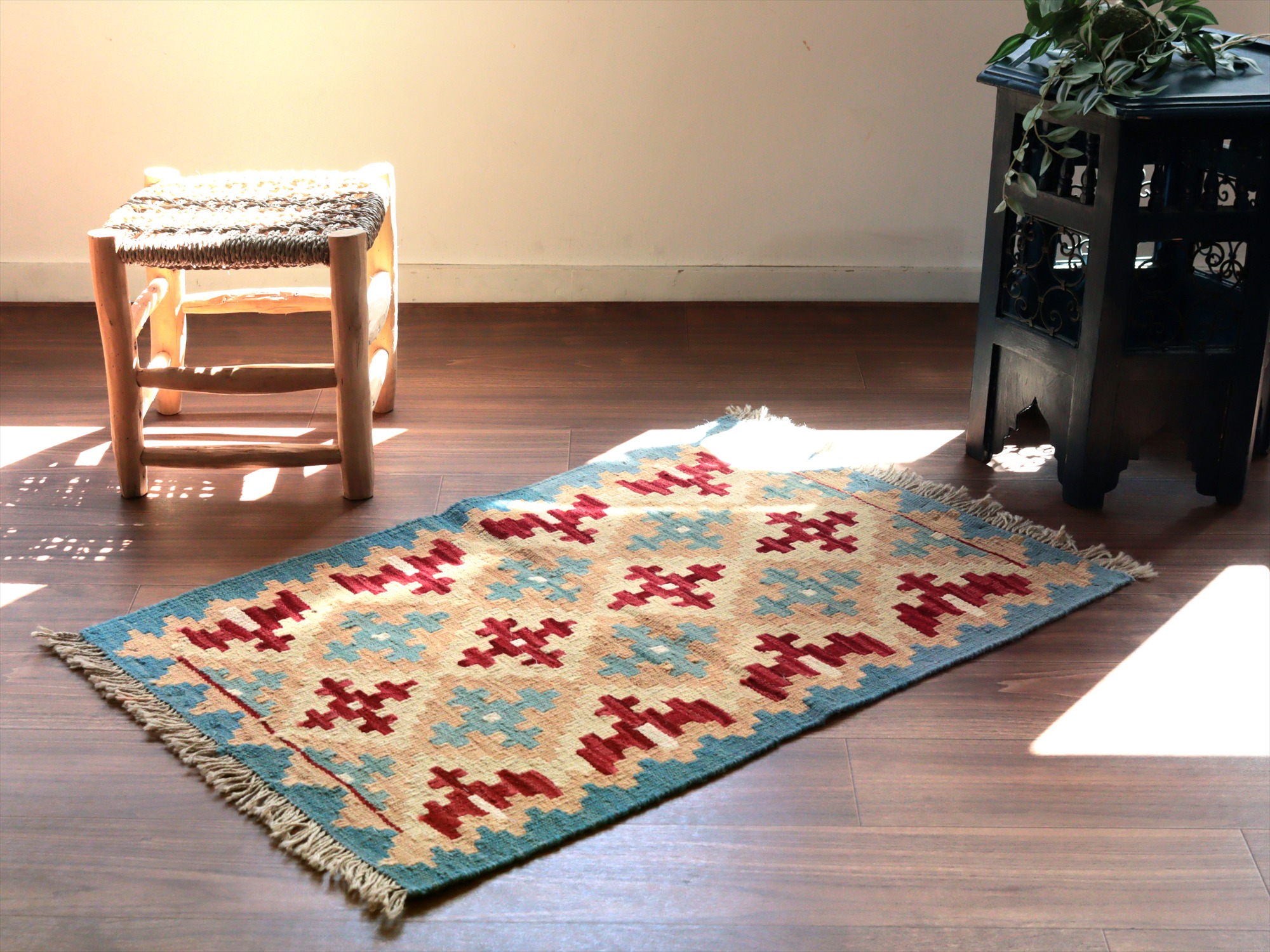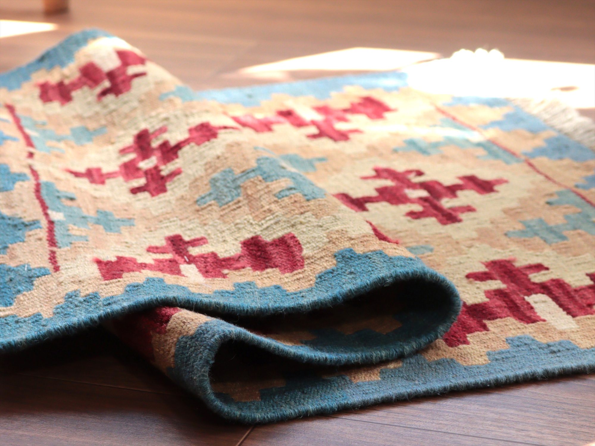 6-7mm程度の厚みがあり、パイル(毛足)がない平織りの敷物で表面は少しザラっとした肌ざわりです。織り手の自由なアイデアでデザインされていますので、左右対象でなかったり、モチーフが少しずれていたりということもありますが、世界で一枚だけの作品ですからその点はご了承ください。