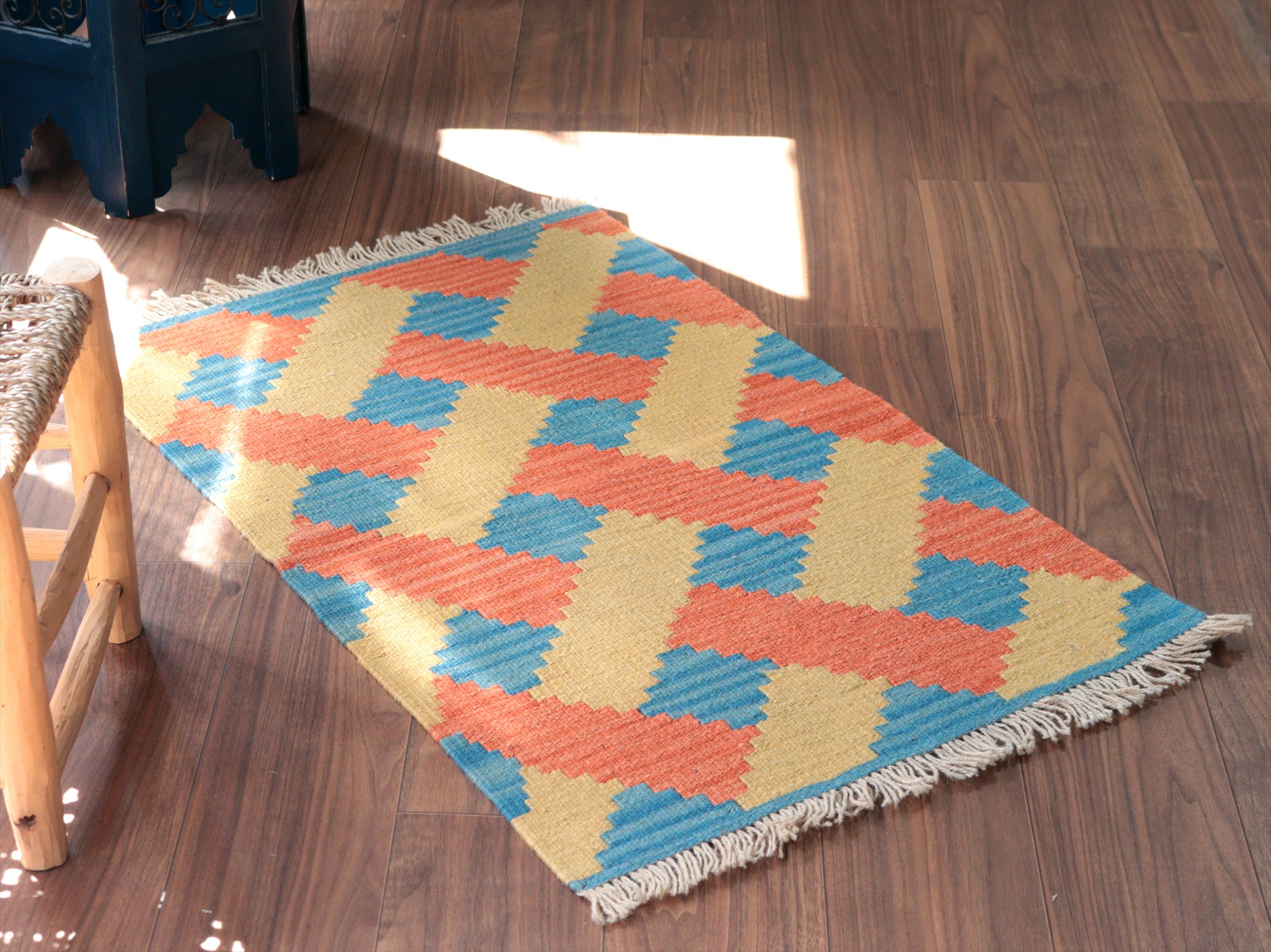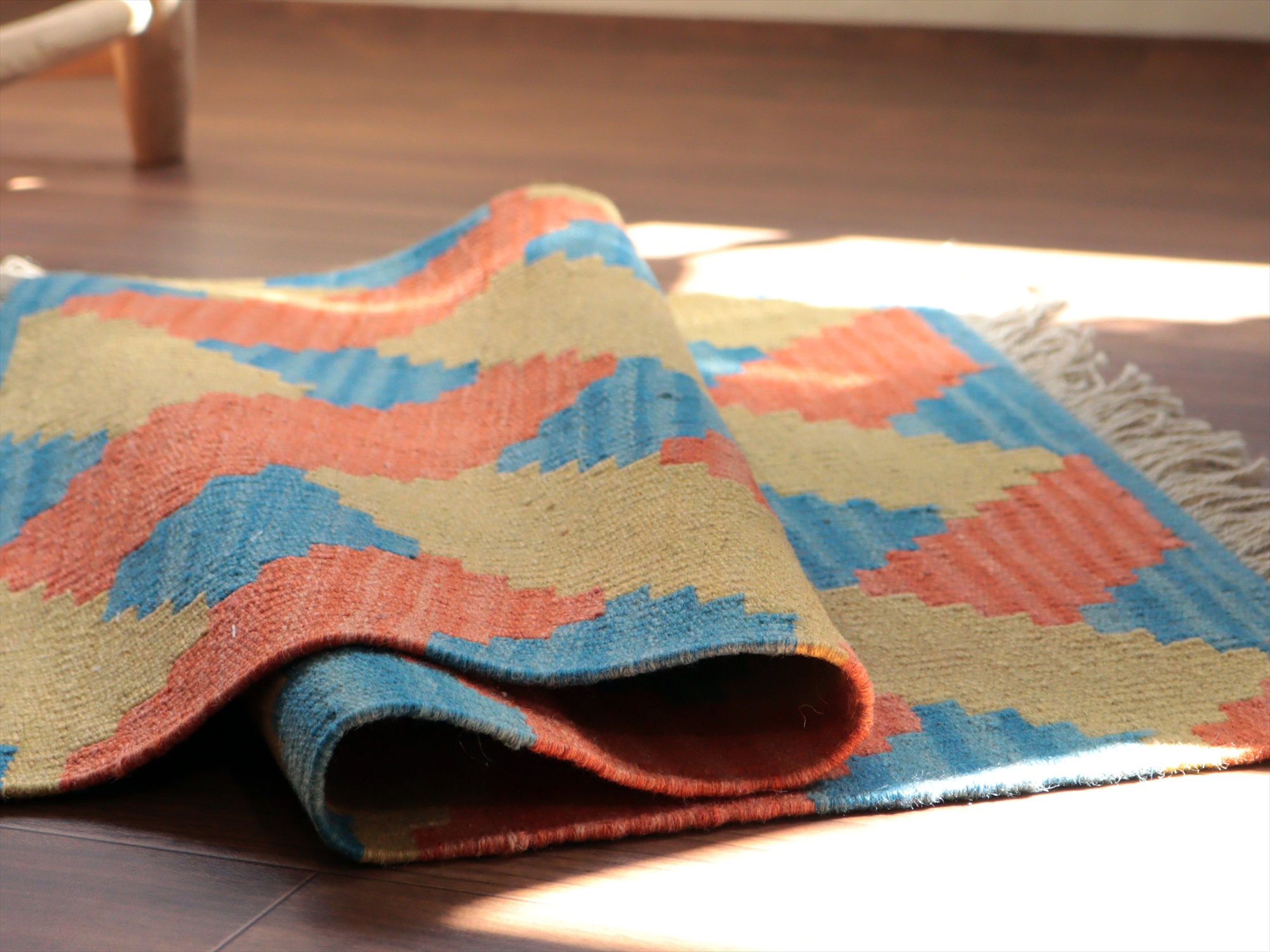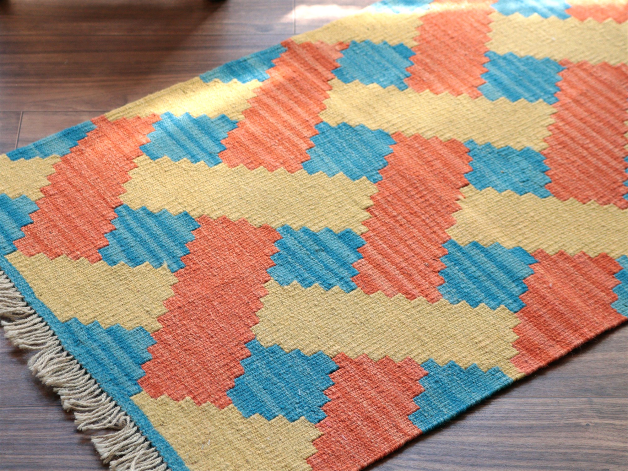 6-7mm程度の厚みがあり、パイル(毛足)がない平織りの敷物で表面は少しザラっとした肌ざわりです。織り手の自由なアイデアでデザインされていますので、左右対象でなかったり、モチーフが少しずれていたりということもありますが、世界で一枚だけの作品ですからその点はご了承ください。