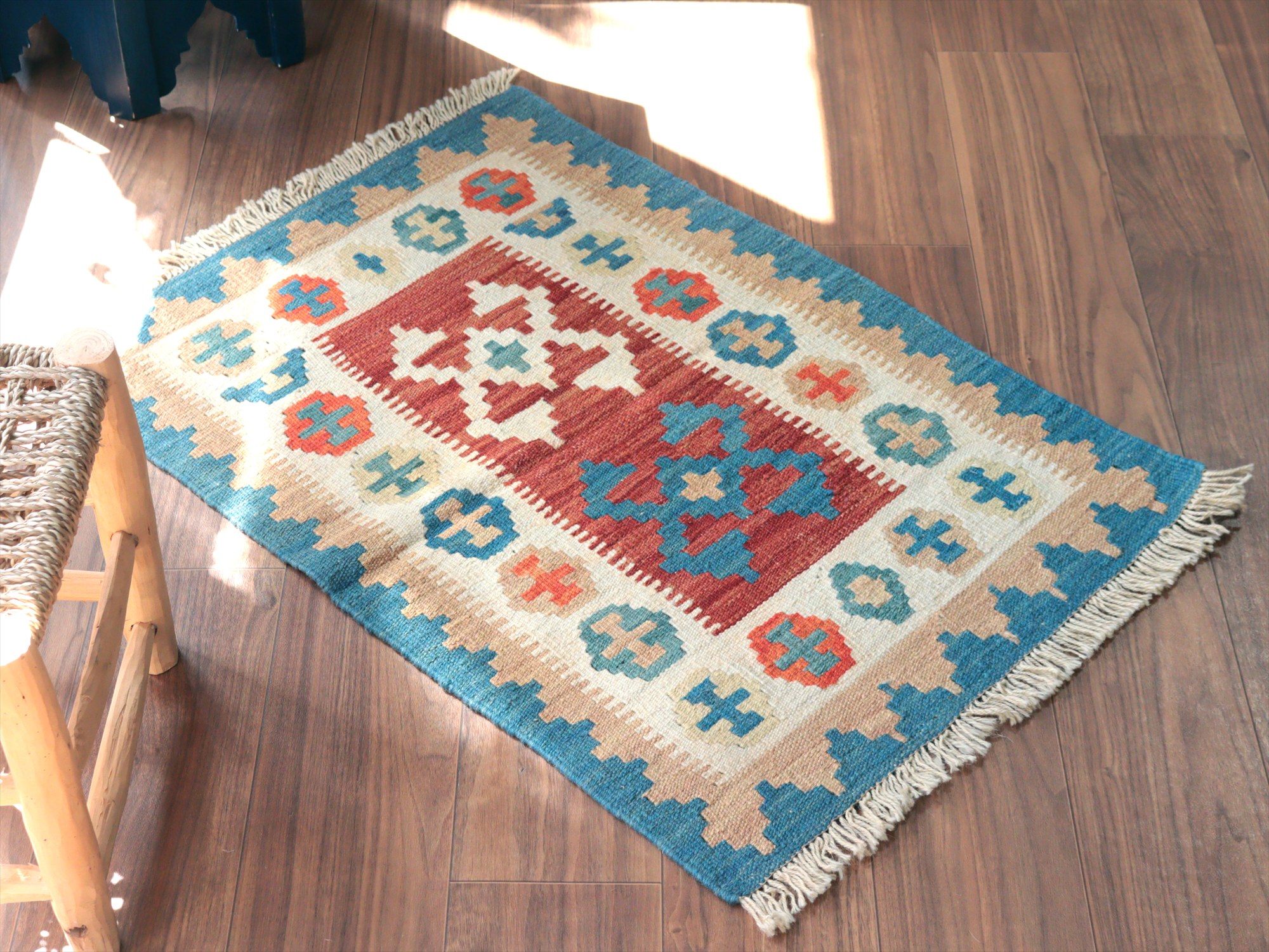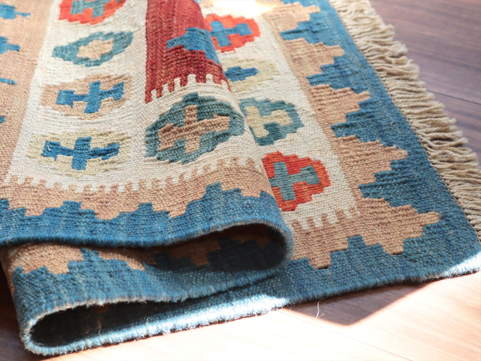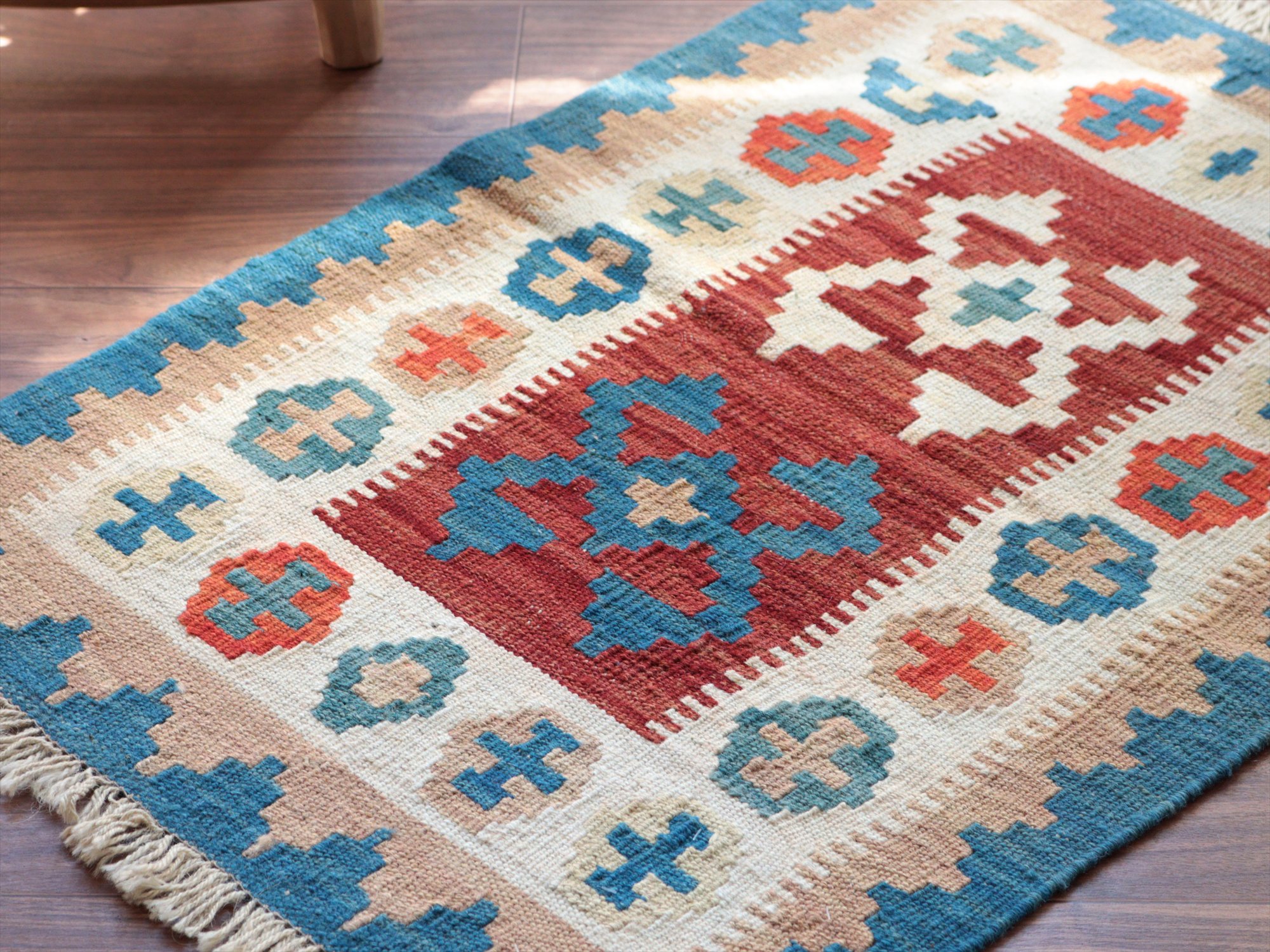 6-7mm程度の厚みがあり、パイル(毛足)がない平織りの敷物で表面は少しザラっとした肌ざわりです。織り手の自由なアイデアでデザインされていますので、左右対象でなかったり、モチーフが少しずれていたりということもありますが、世界で一枚だけの作品ですからその点はご了承ください。