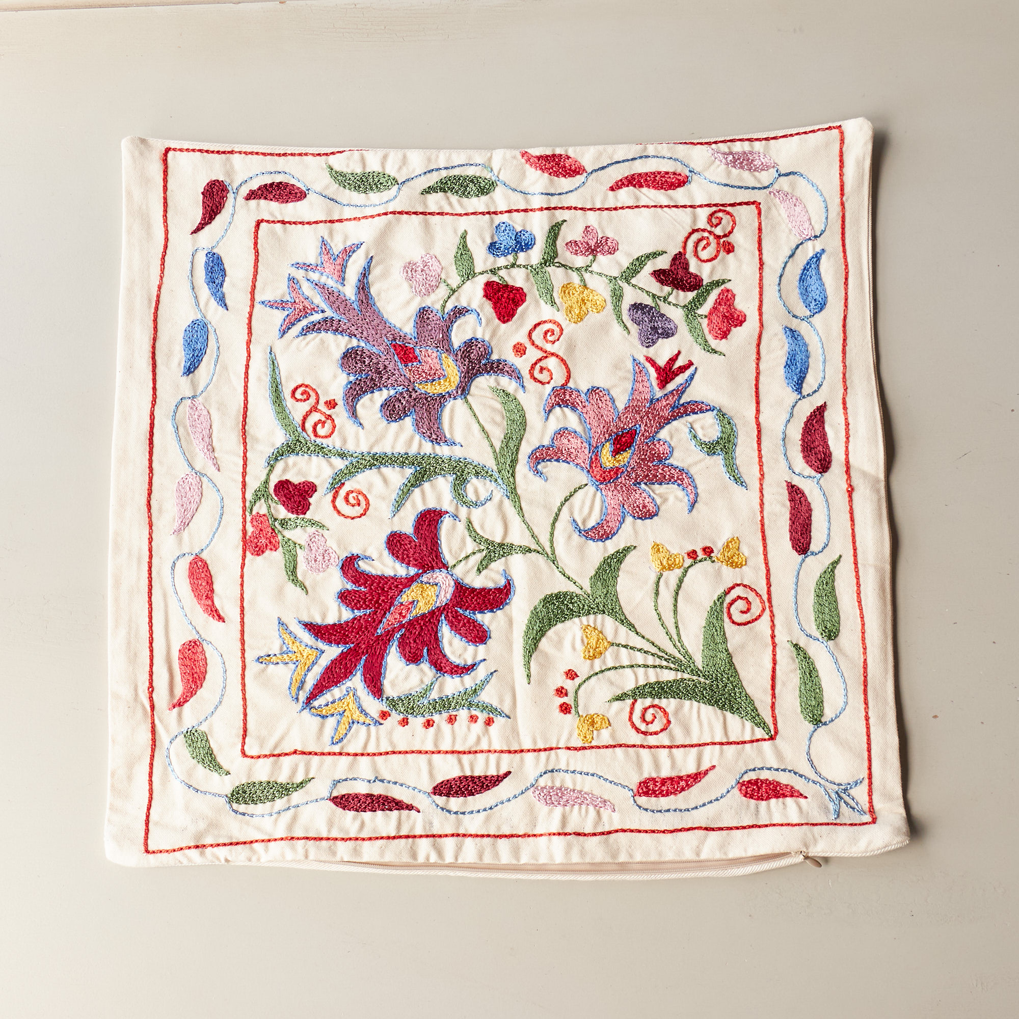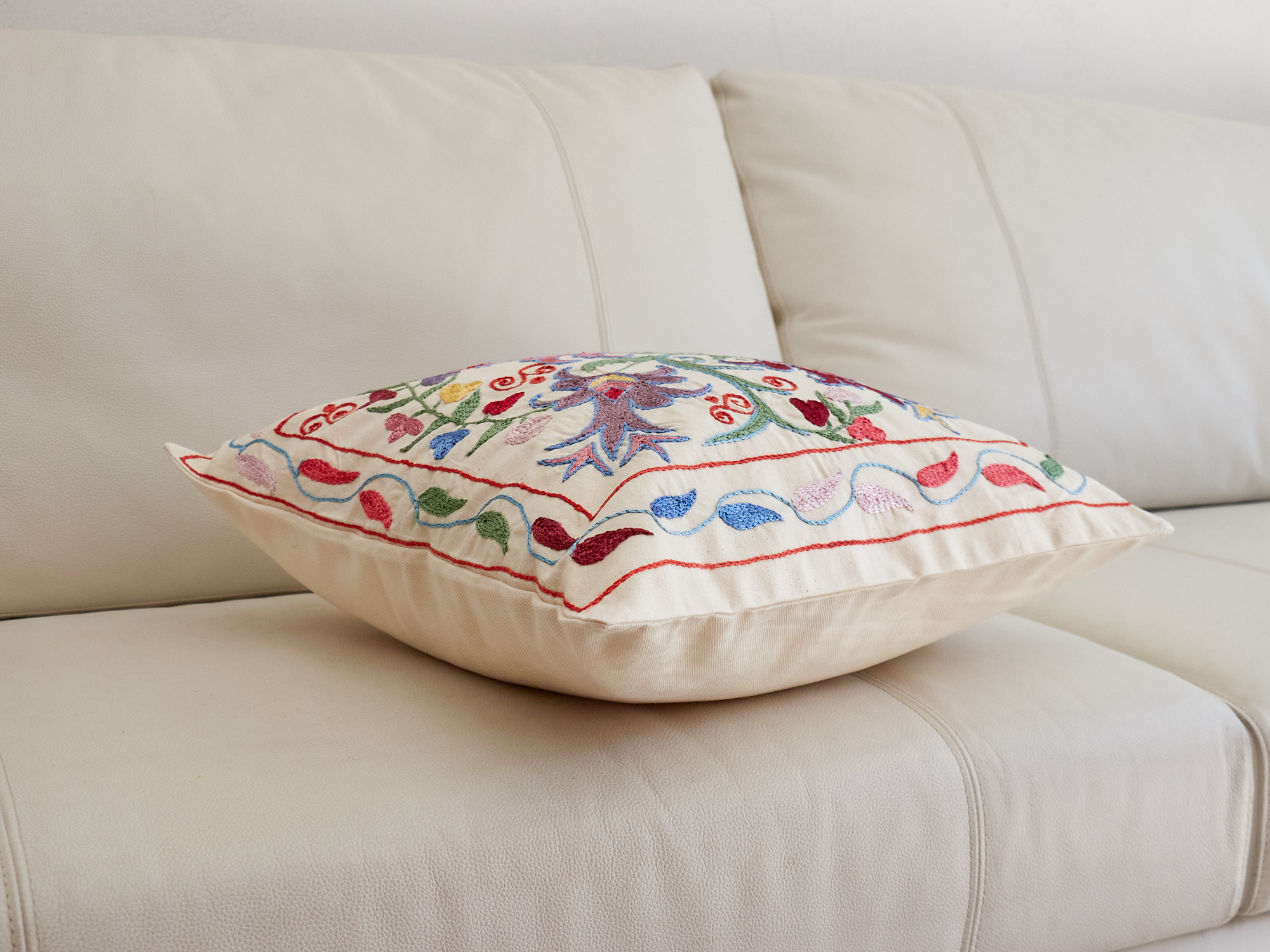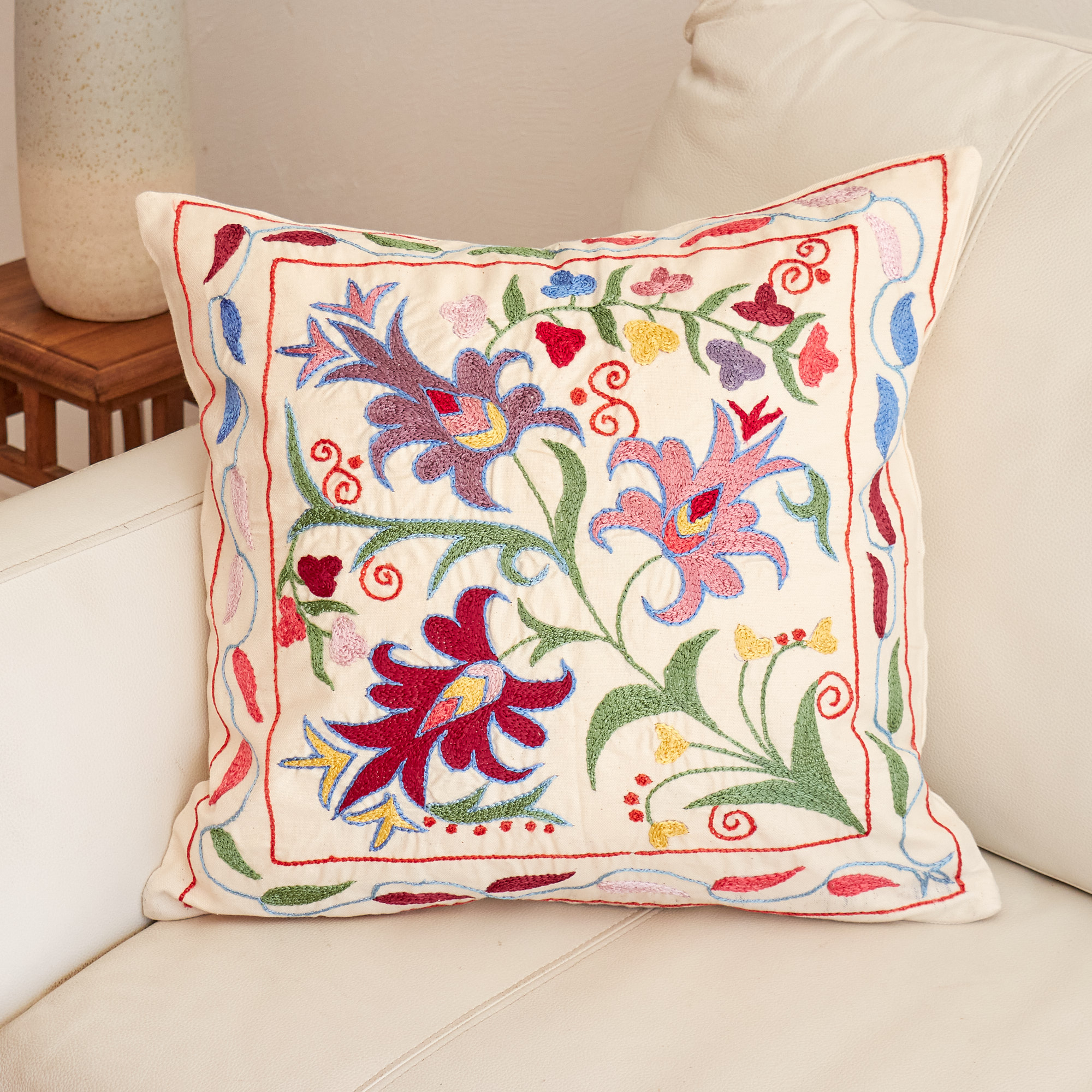 ウズベキスタンの伝統の手刺繍布・スザンニをクッションカバーに仕立てました。緻密なニードルワークによるチェーンステッチの手刺繍が見事。ひとつお部屋にあるだけで、お部屋が華やぐクッションです。
