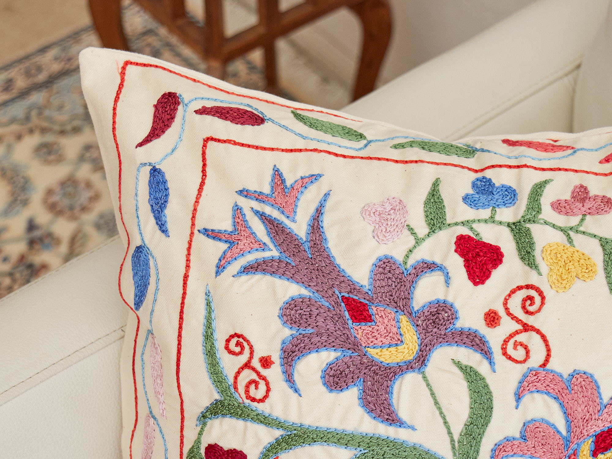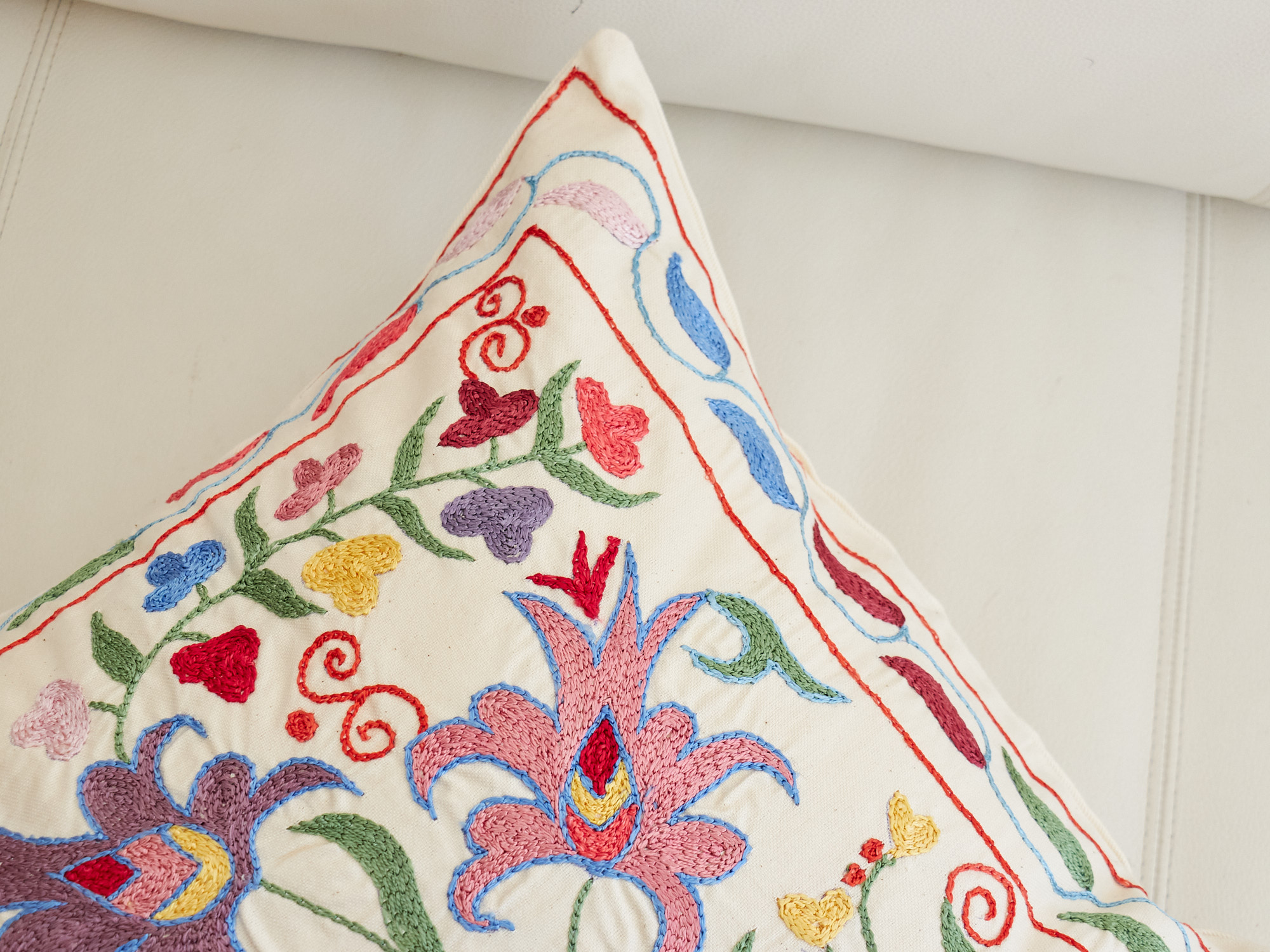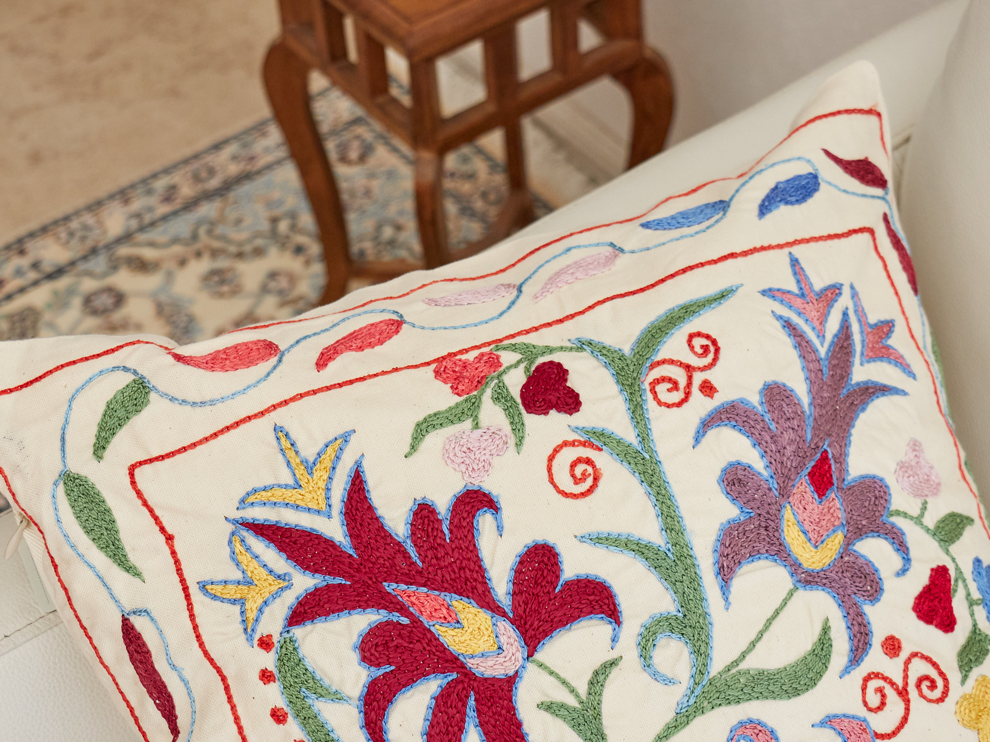ウズベキスタンの伝統の手刺繍布・スザンニをクッションカバーに仕立てました。緻密なニードルワークによるチェーンステッチの手刺繍が見事。ひとつお部屋にあるだけで、お部屋が華やぐクッションです。