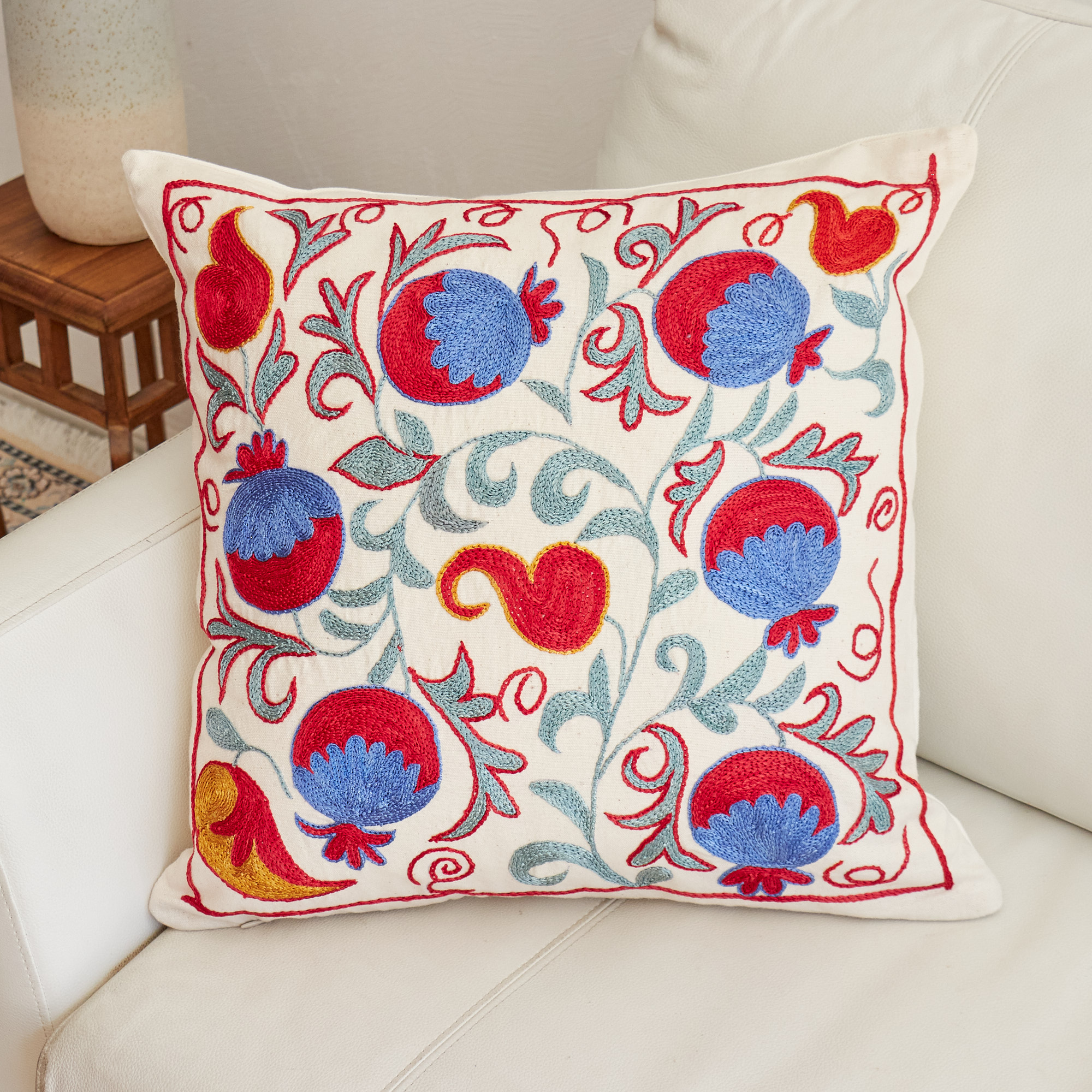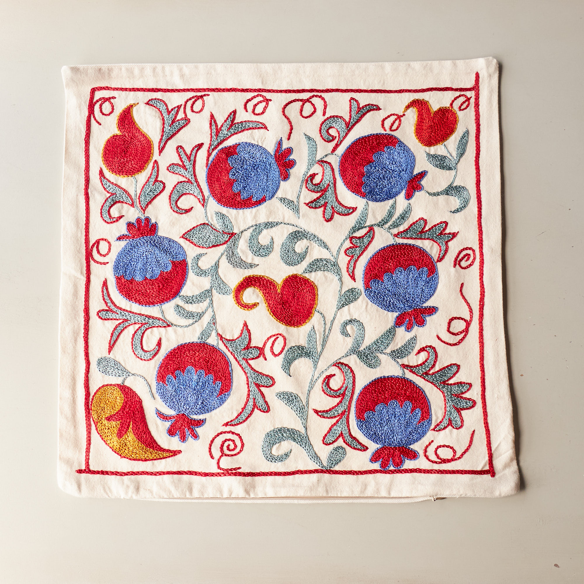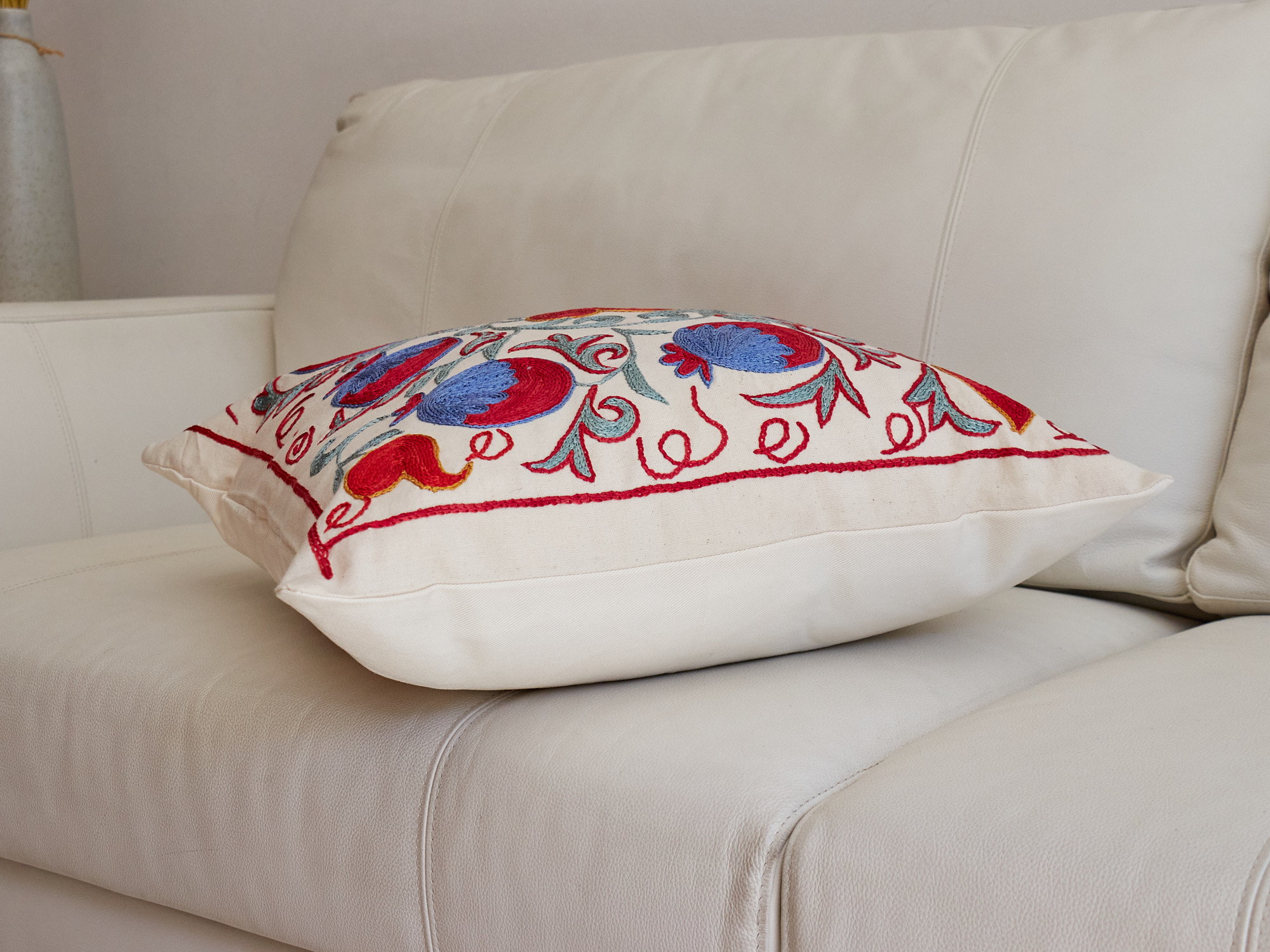 ウズベキスタンの伝統の手刺繍布・スザンニをクッションカバーに仕立てました。緻密なニードルワークによるチェーンステッチの手刺繍が見事。ひとつお部屋にあるだけで、お部屋が華やぐクッションです。