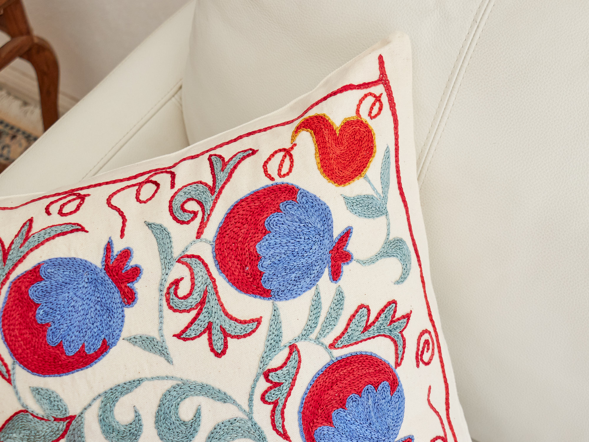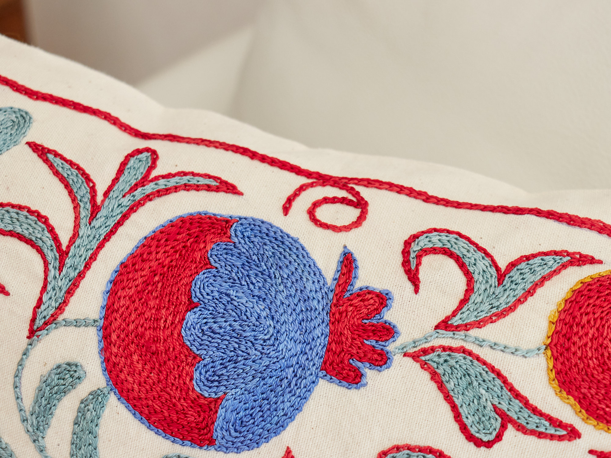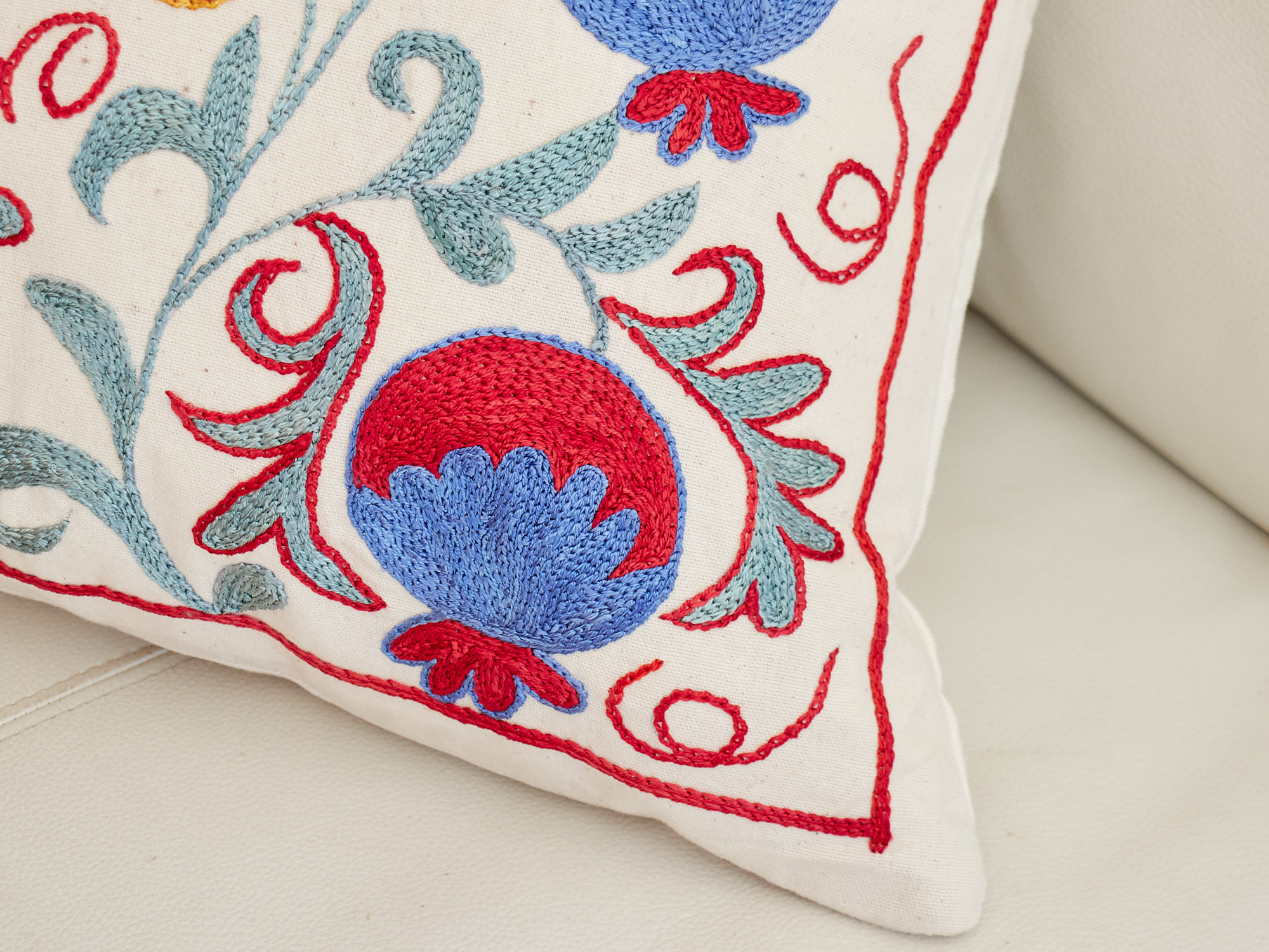 ウズベキスタンの伝統の手刺繍布・スザンニをクッションカバーに仕立てました。緻密なニードルワークによるチェーンステッチの手刺繍が見事。ひとつお部屋にあるだけで、お部屋が華やぐクッションです。
