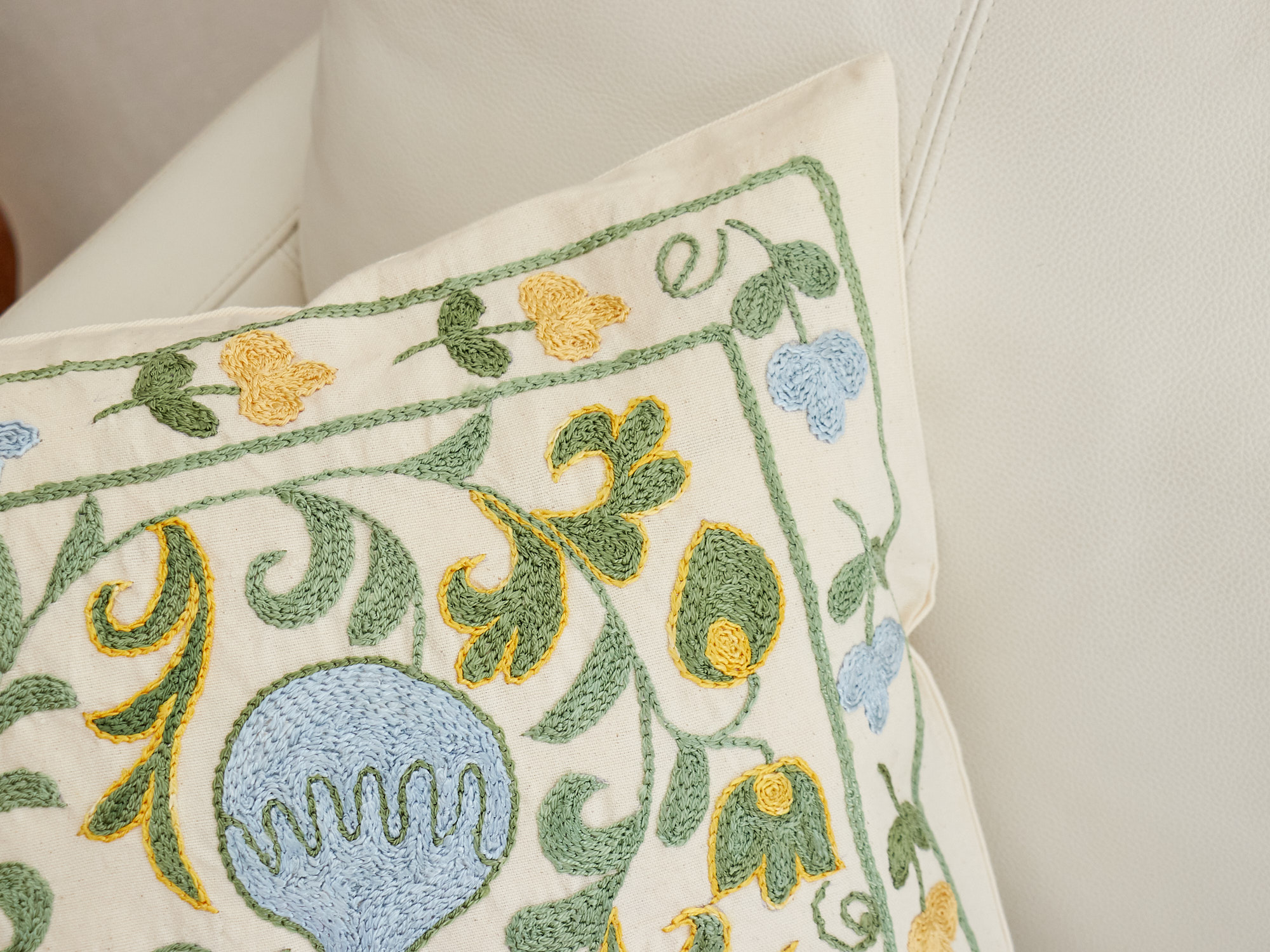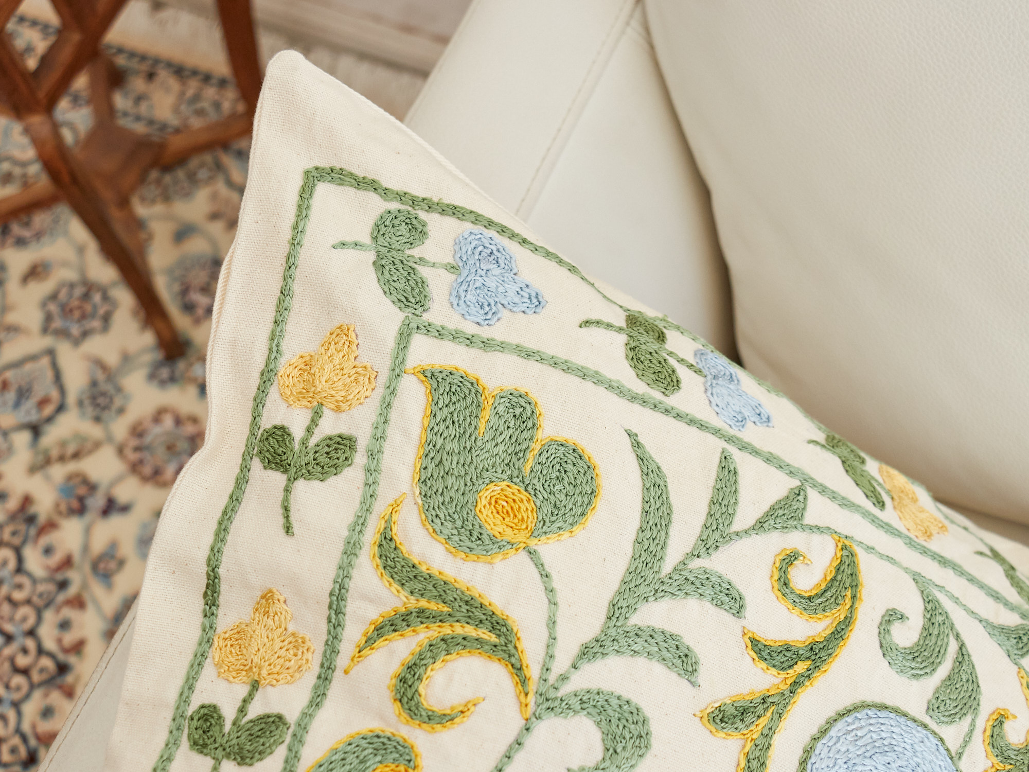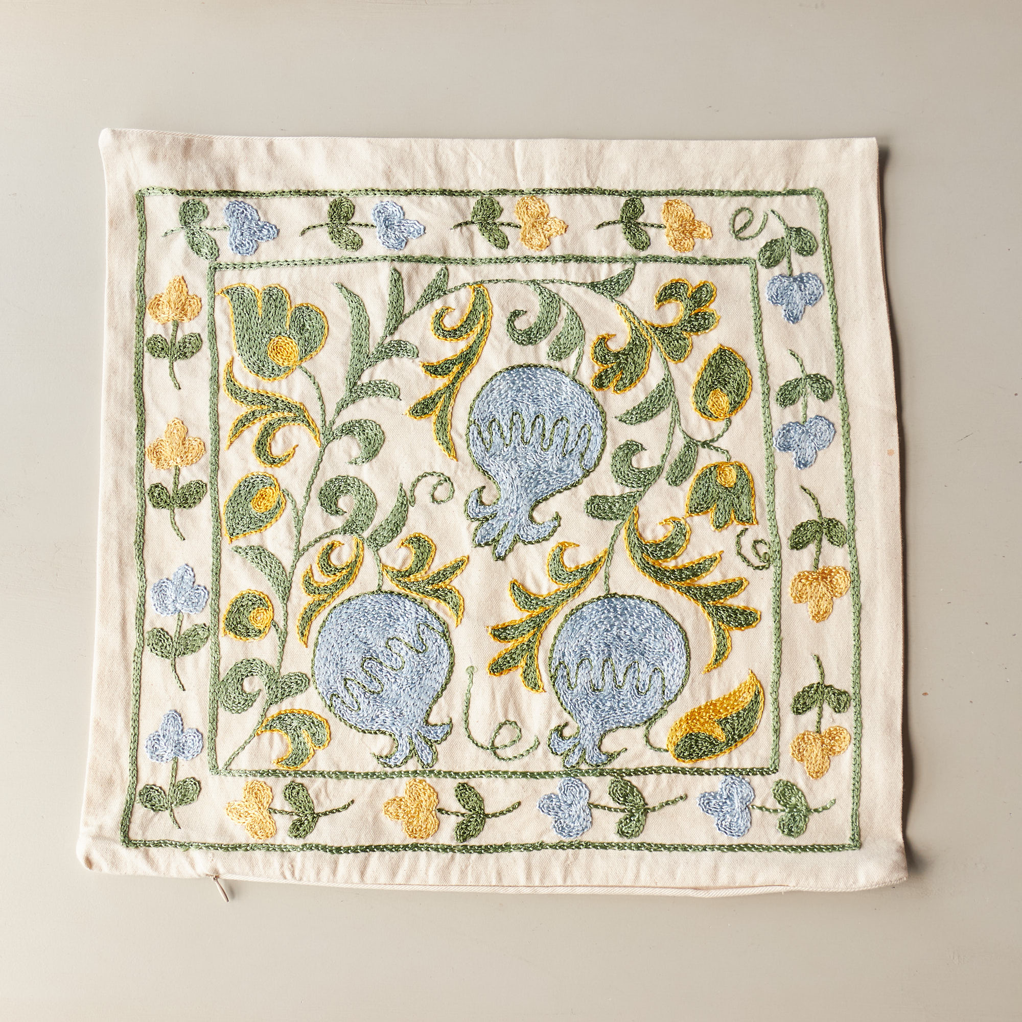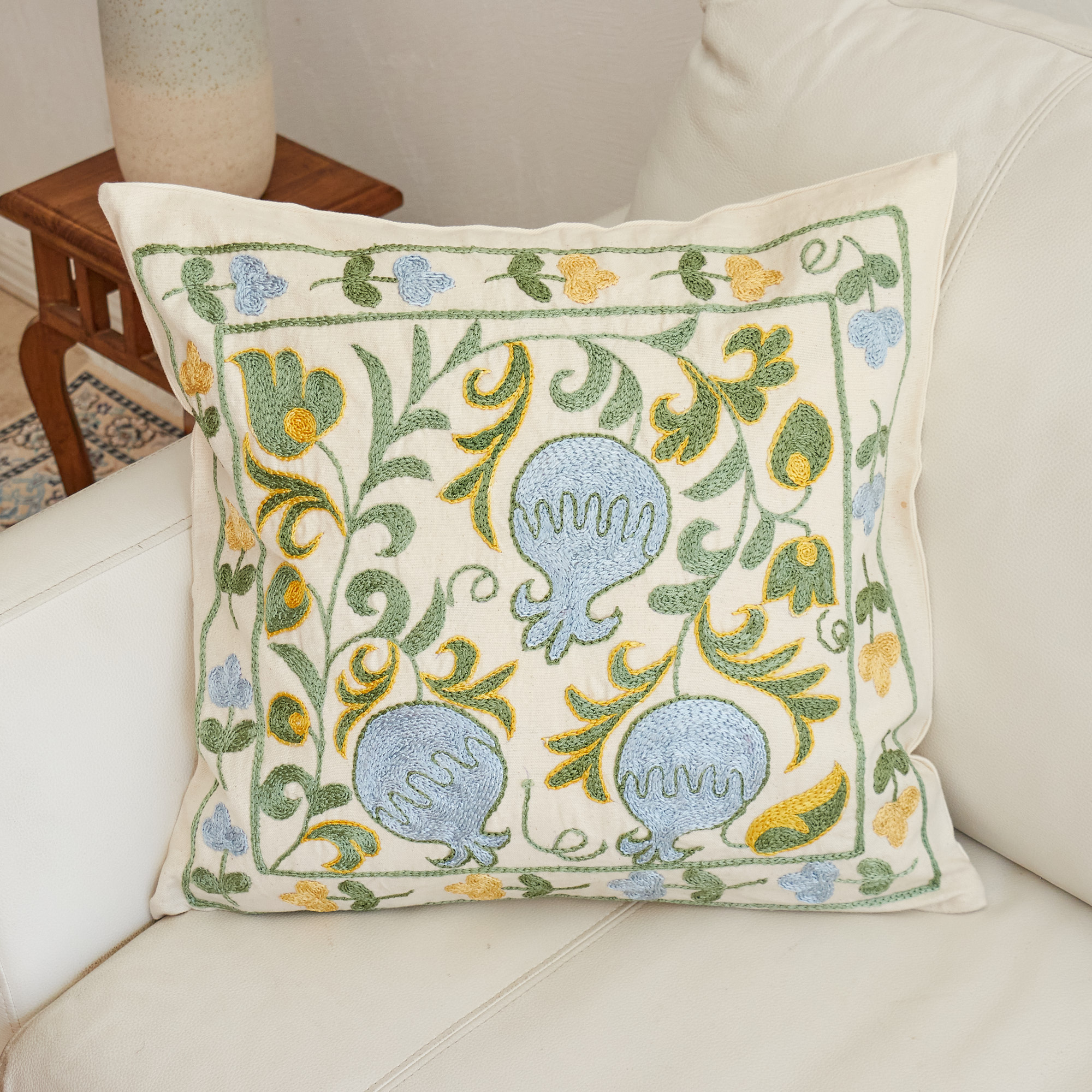 ウズベキスタンの伝統の手刺繍布・スザンニをクッションカバーに仕立てました。緻密なニードルワークによるチェーンステッチの手刺繍が見事。ひとつお部屋にあるだけで、お部屋が華やぐクッションです。