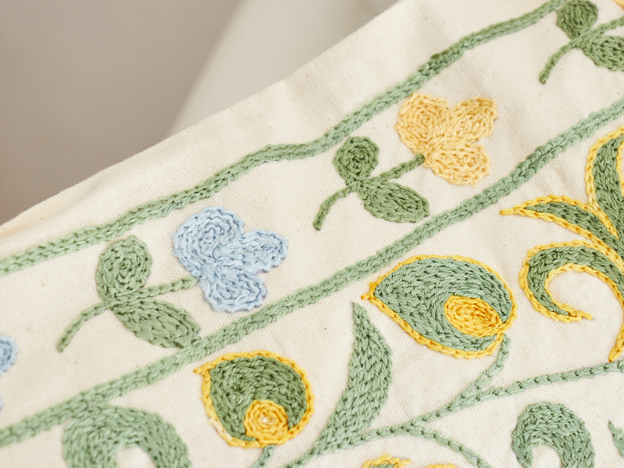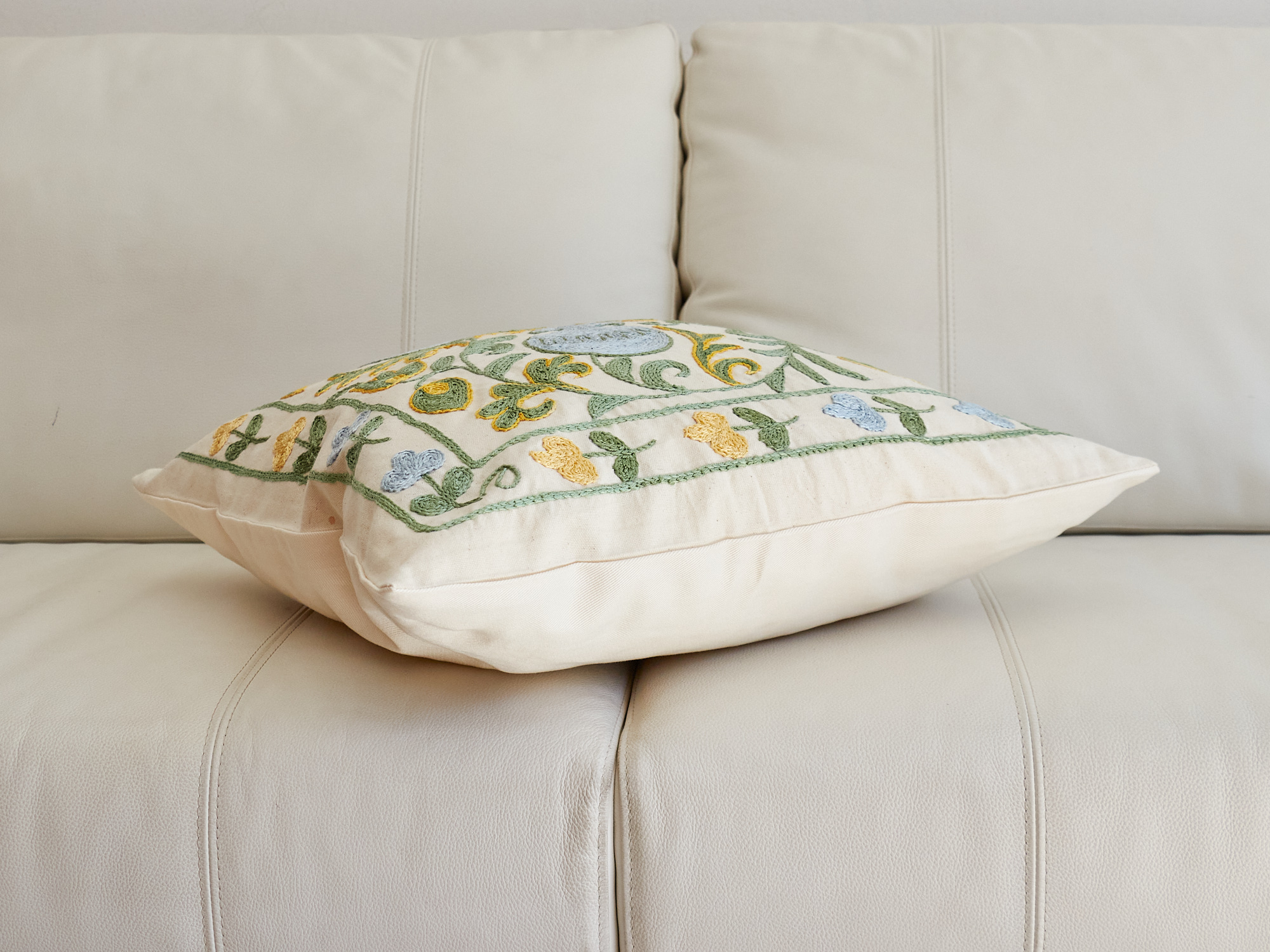 裏面は表と同系色のコットン無地。サイドにファスナーがついています。表面の生地の裏はあて布などありませんので、クッションカバーの内側から刺繍糸の結び目などが見られます。