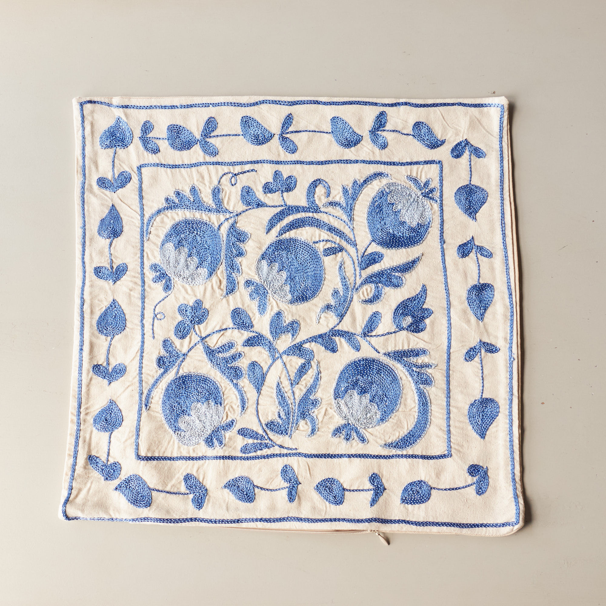 裏面は表と同系色のコットン無地。サイドにファスナーがついています。表面の生地の裏はあて布などありませんので、クッションカバーの内側から刺繍糸の結び目などが見られます。