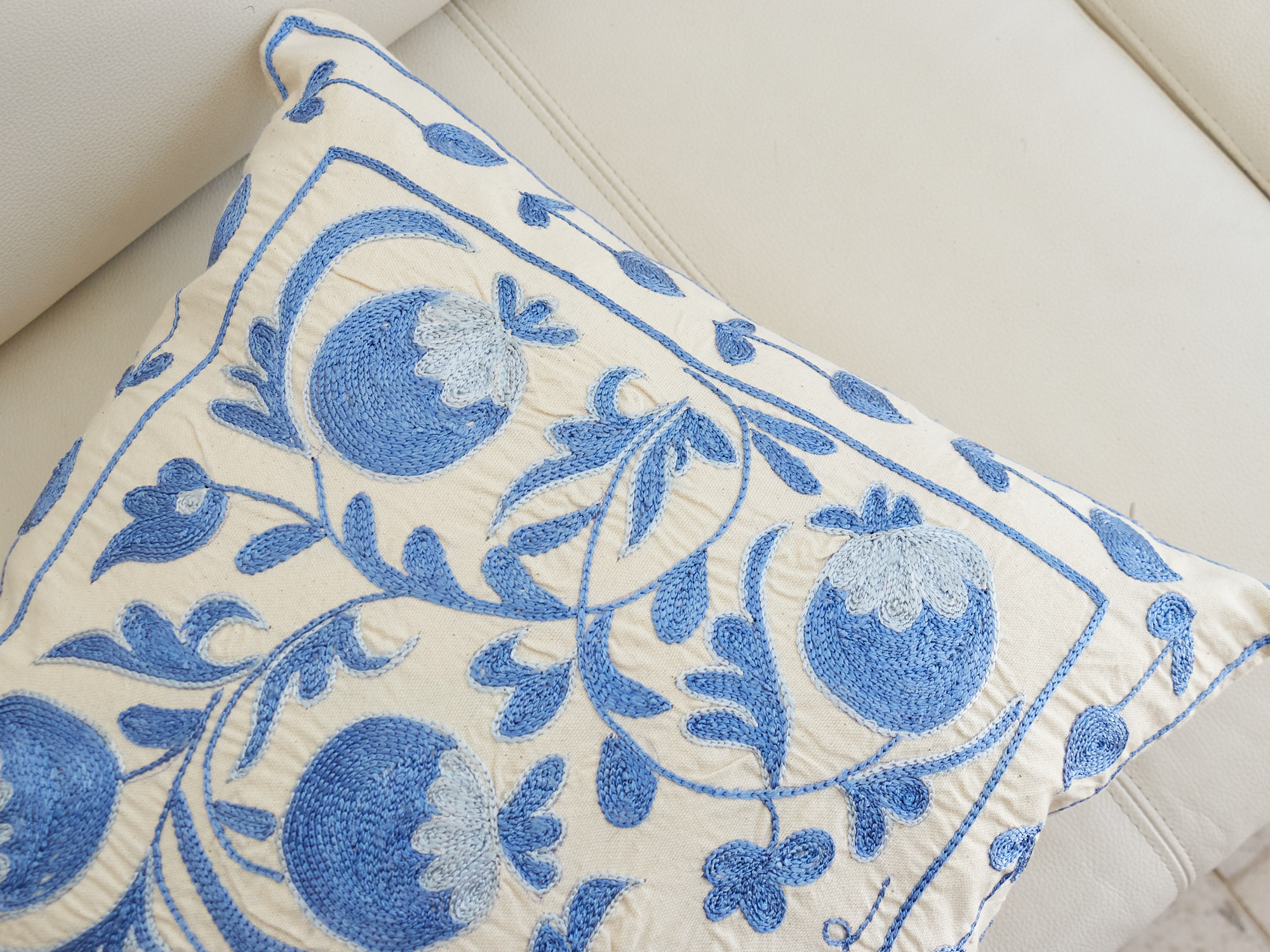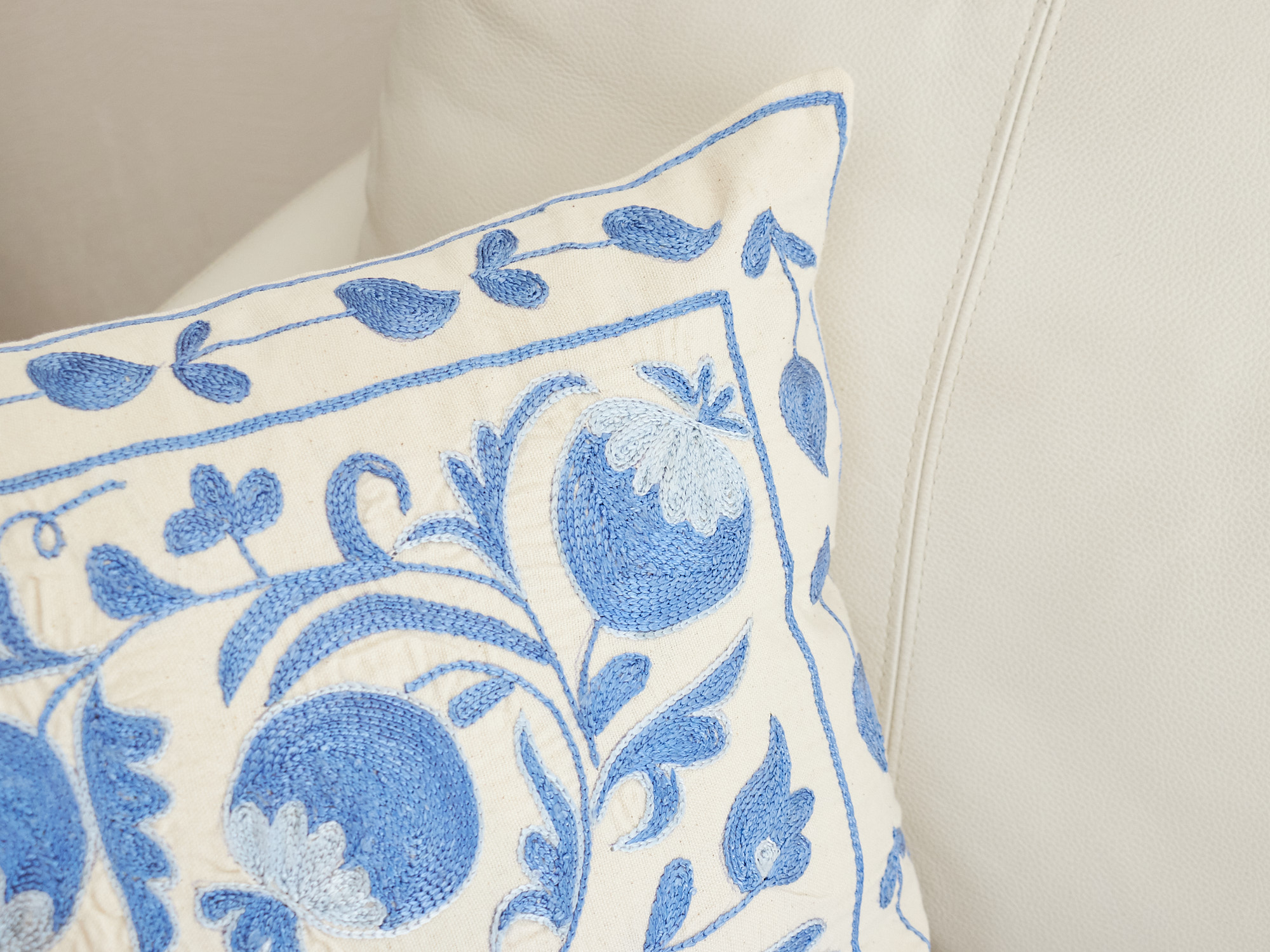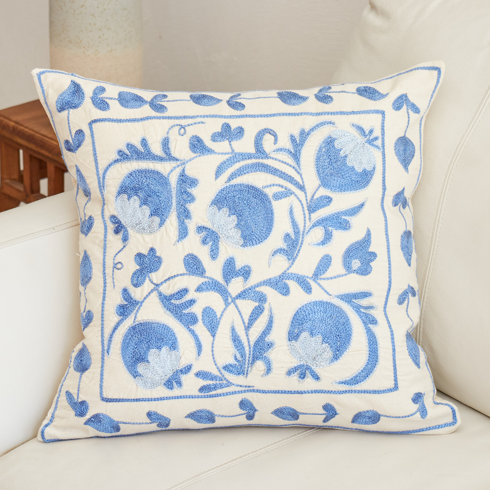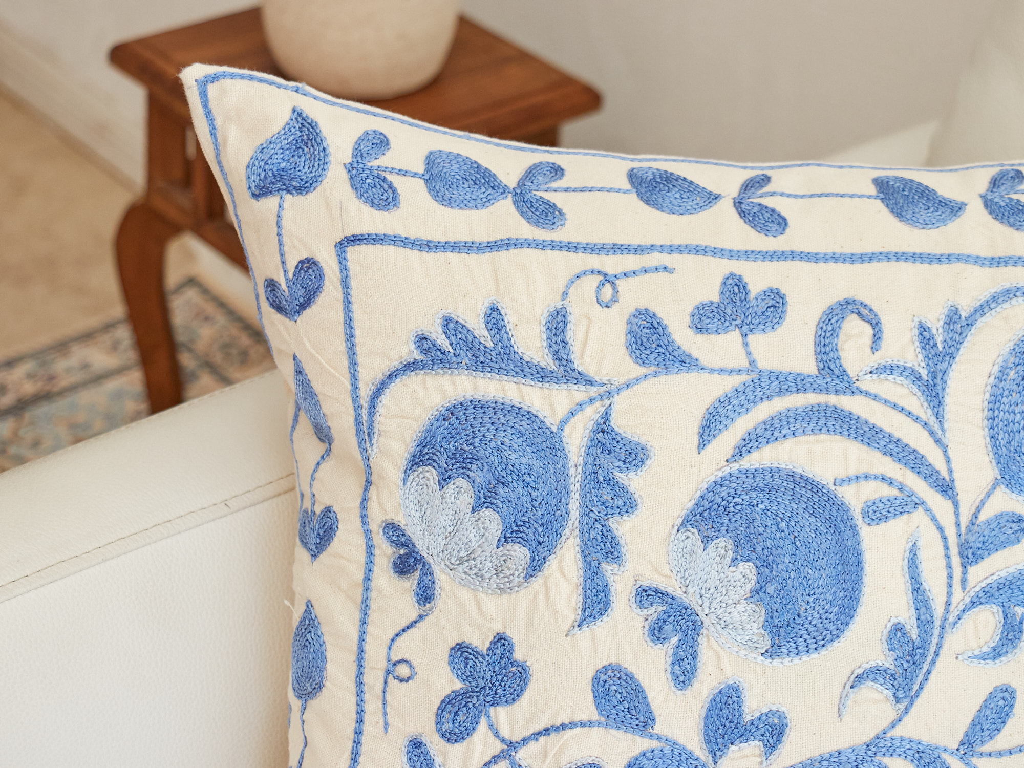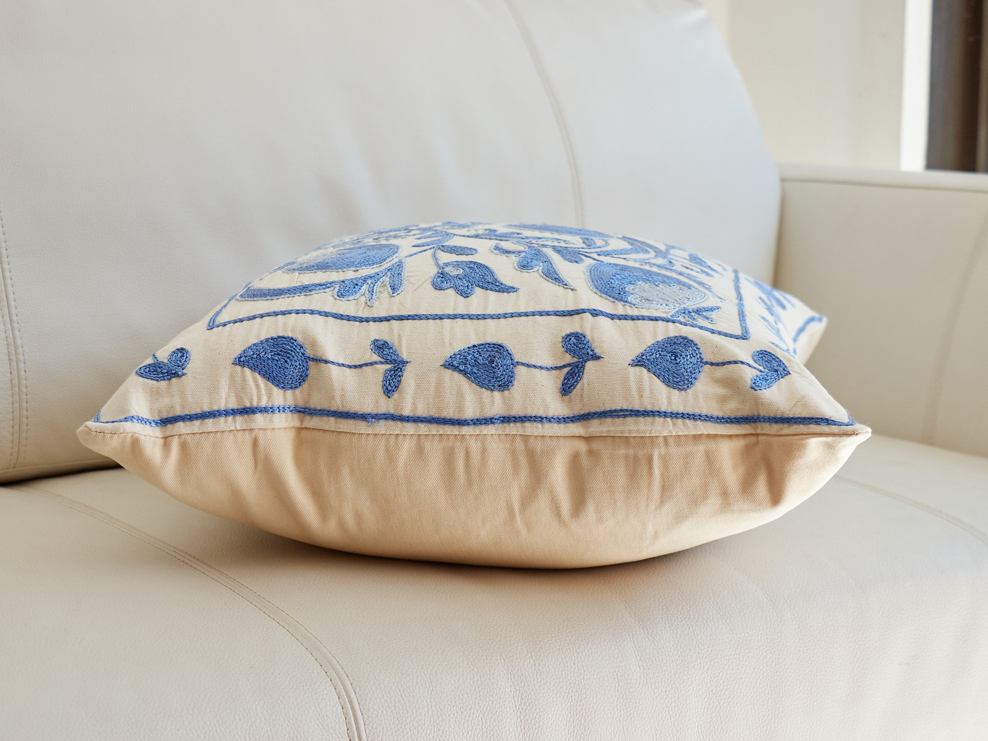 ウズベキスタンの伝統の手刺繍布・スザンニをクッションカバーに仕立てました。緻密なニードルワークによるチェーンステッチの手刺繍が見事。ひとつお部屋にあるだけで、お部屋が華やぐクッションです。