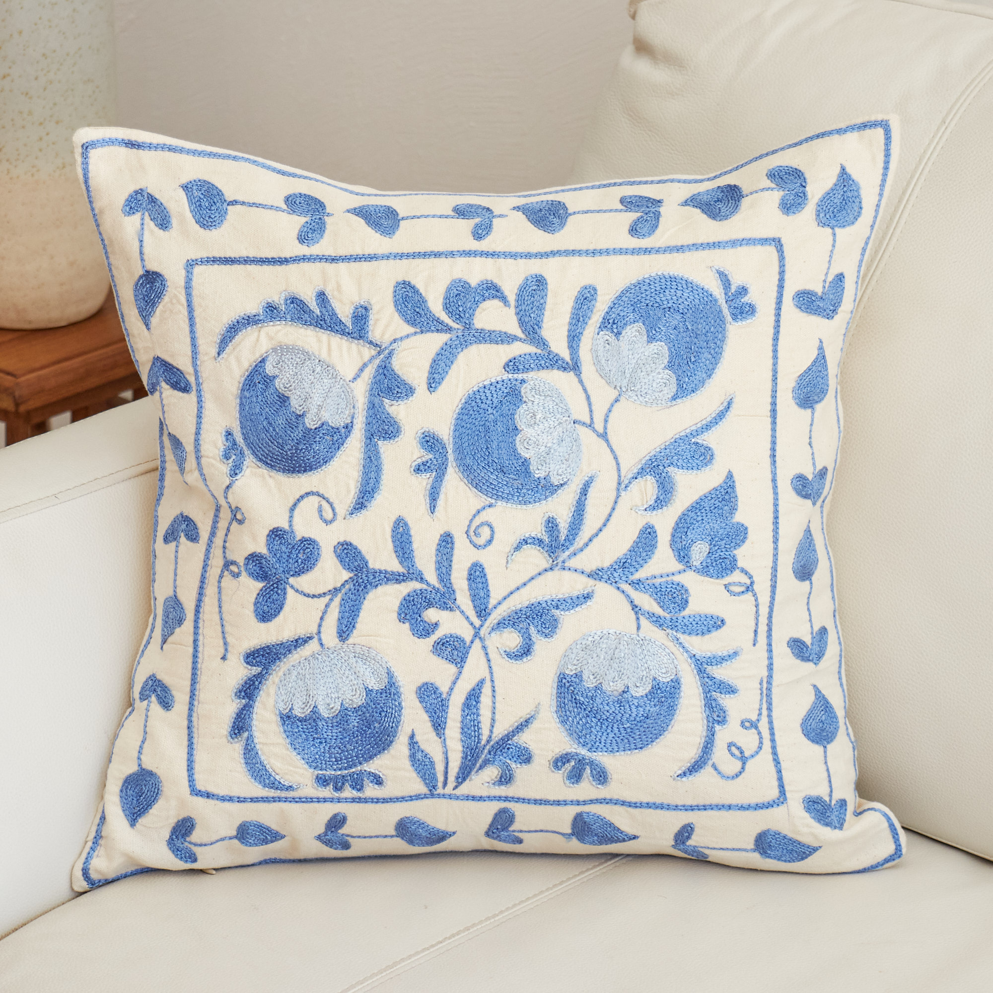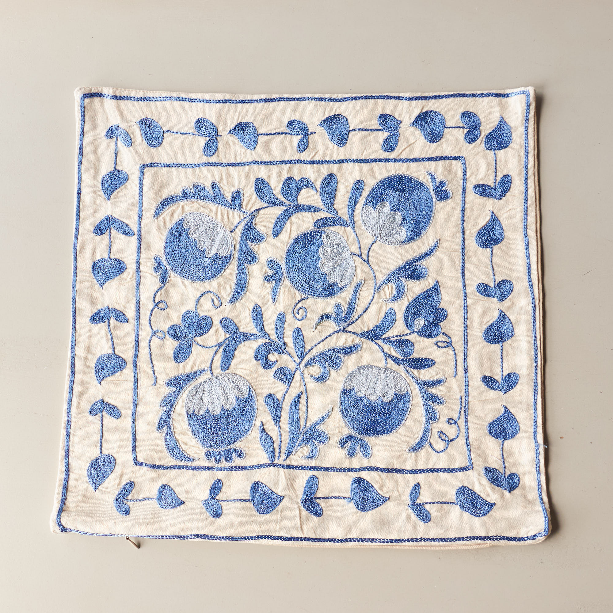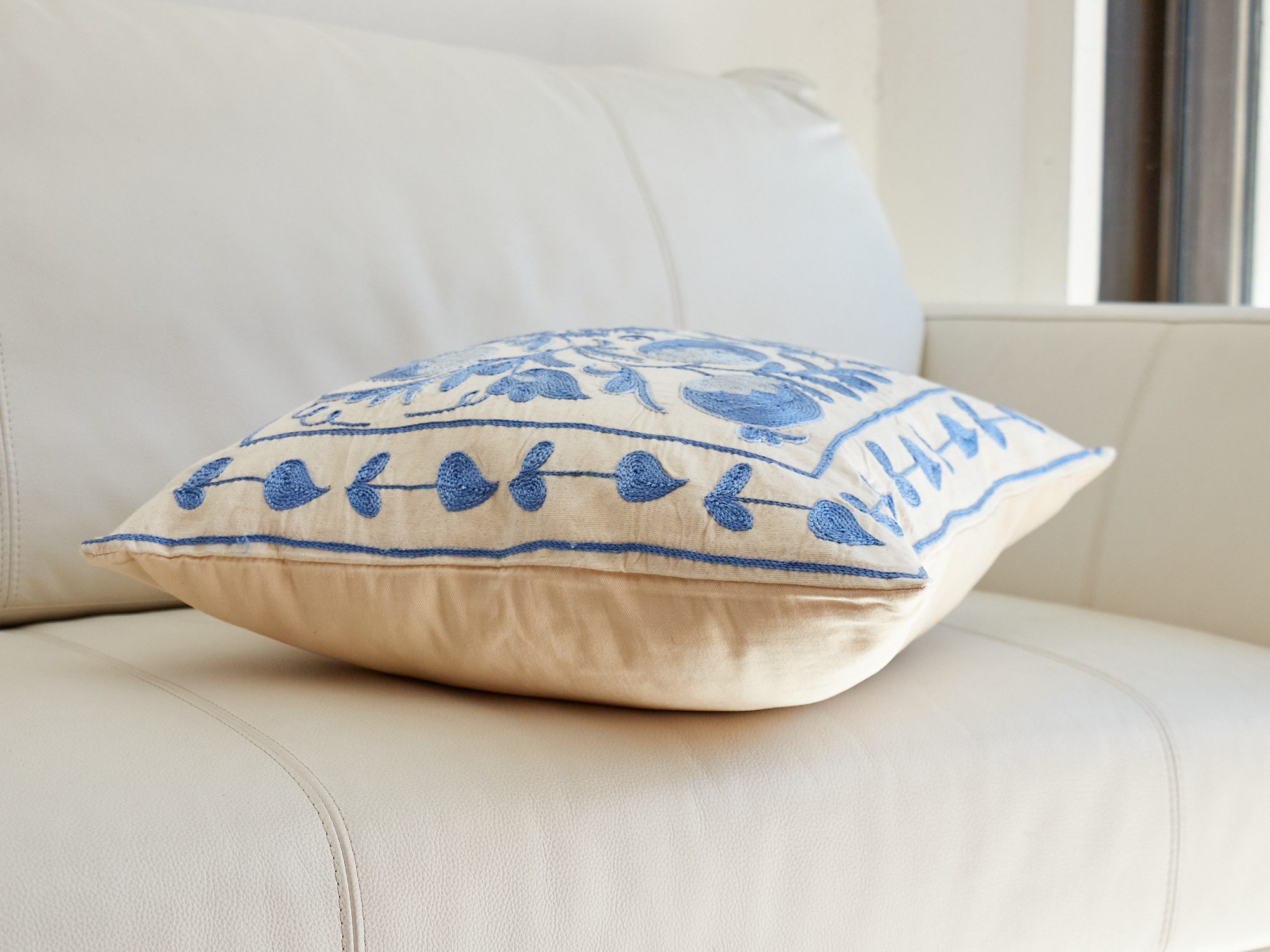 ウズベキスタンの伝統の手刺繍布・スザンニをクッションカバーに仕立てました。緻密なニードルワークによるチェーンステッチの手刺繍が見事。ひとつお部屋にあるだけで、お部屋が華やぐクッションです。