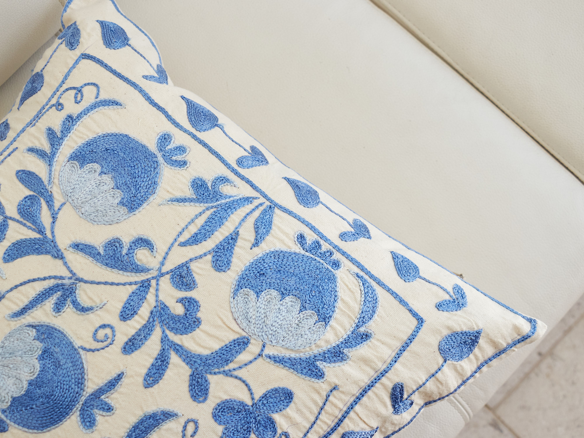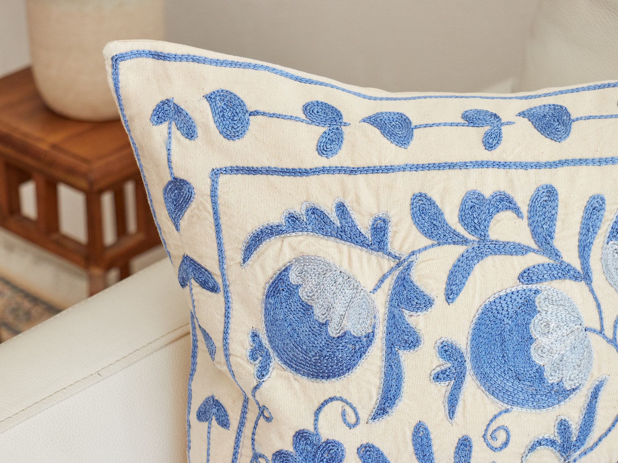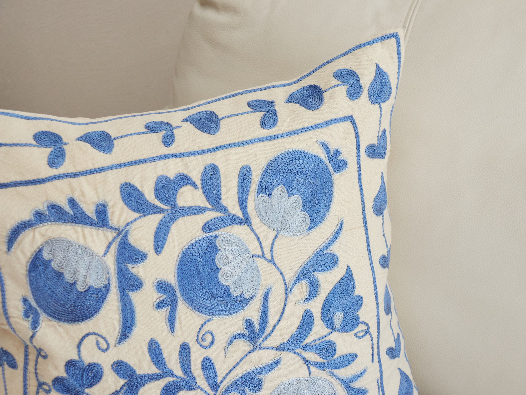 ウズベキスタンの伝統の手刺繍布・スザンニをクッションカバーに仕立てました。緻密なニードルワークによるチェーンステッチの手刺繍が見事。ひとつお部屋にあるだけで、お部屋が華やぐクッションです。