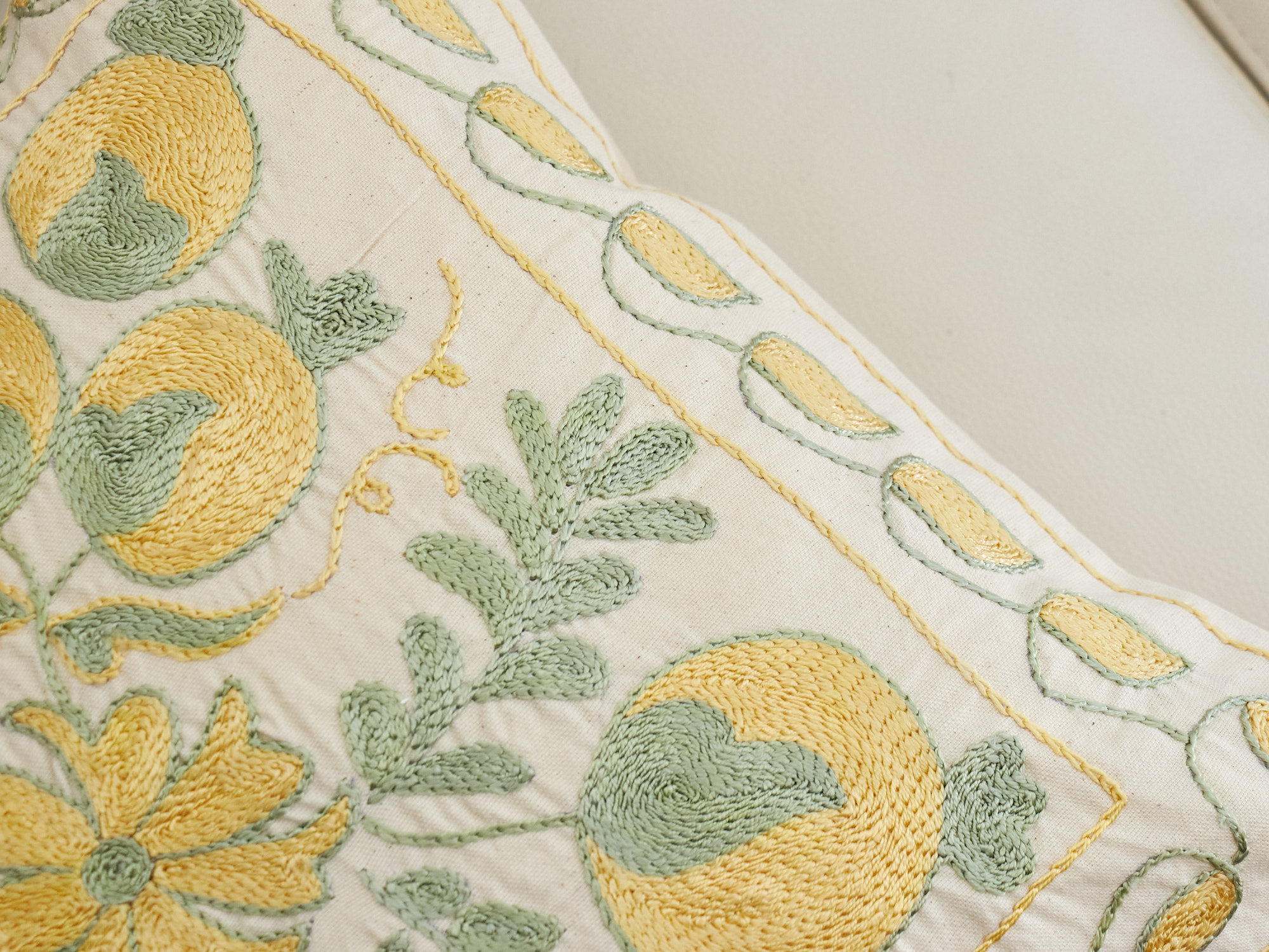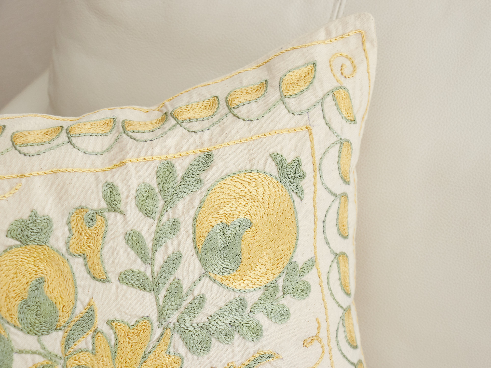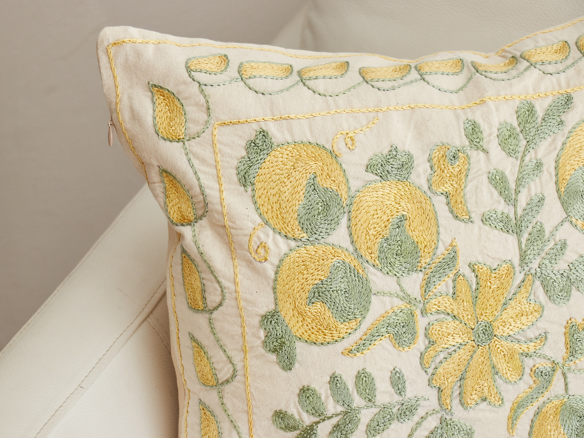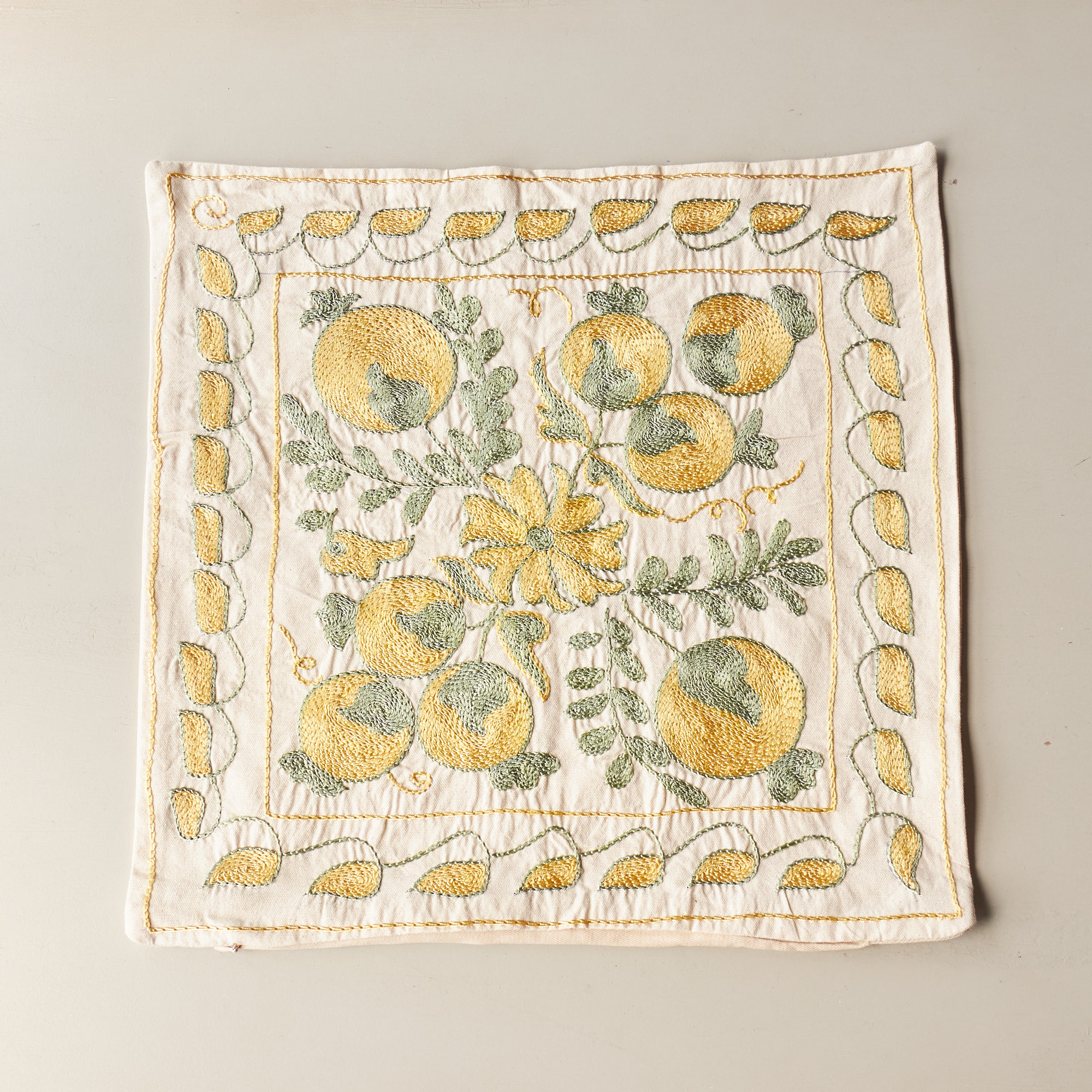 ウズベキスタンの伝統の手刺繍布・スザンニをクッションカバーに仕立てました。緻密なニードルワークによるチェーンステッチの手刺繍が見事。ひとつお部屋にあるだけで、お部屋が華やぐクッションです。