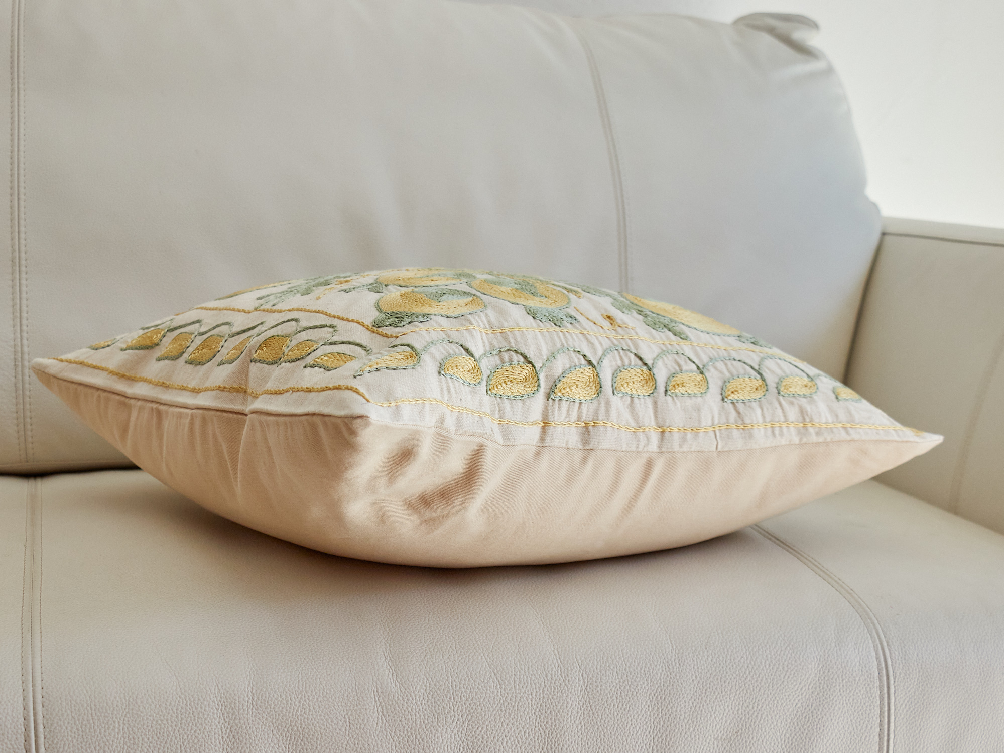 裏面は表と同系色のコットン無地。サイドにファスナーがついています。表面の生地の裏はあて布などありませんので、クッションカバーの内側から刺繍糸の結び目などが見られます。