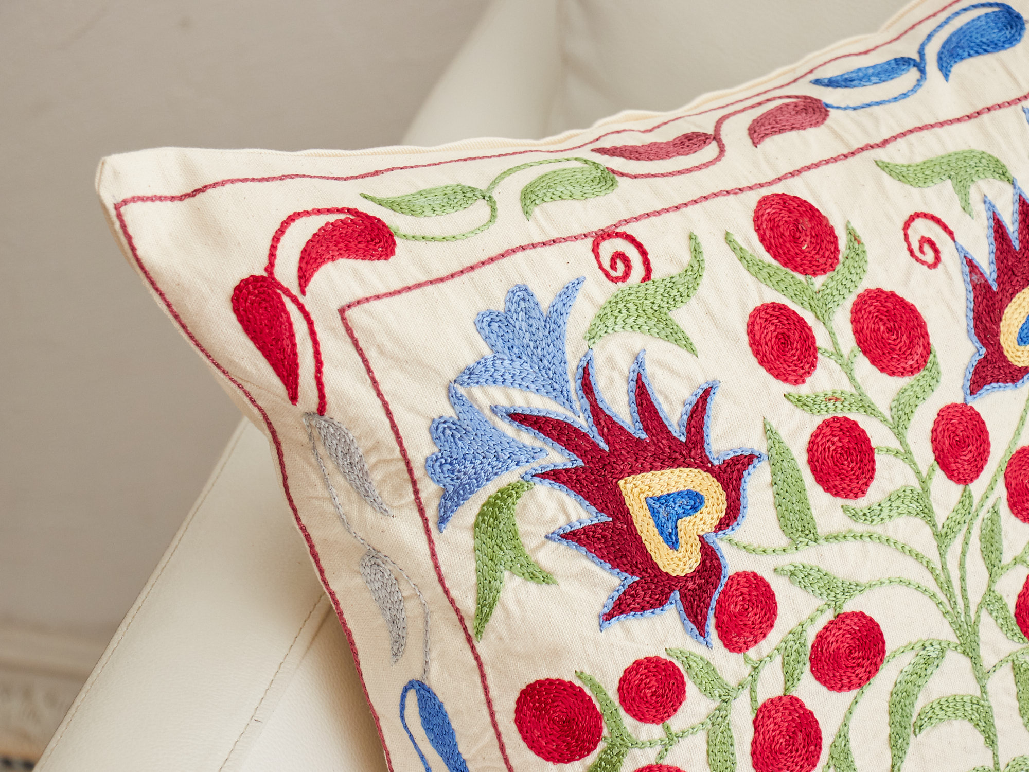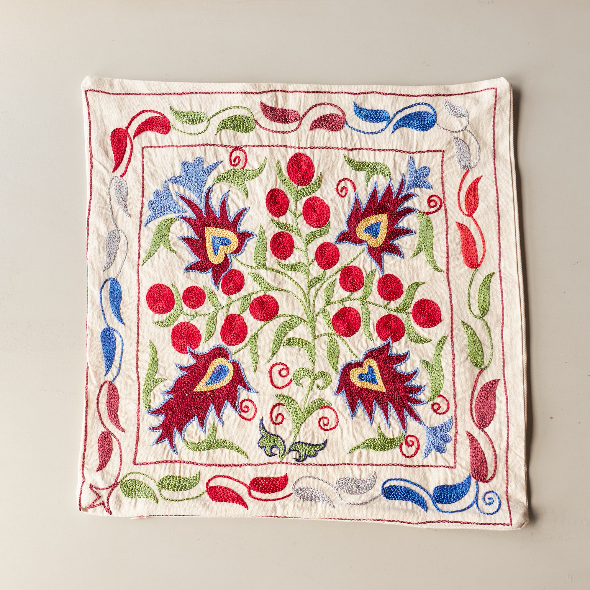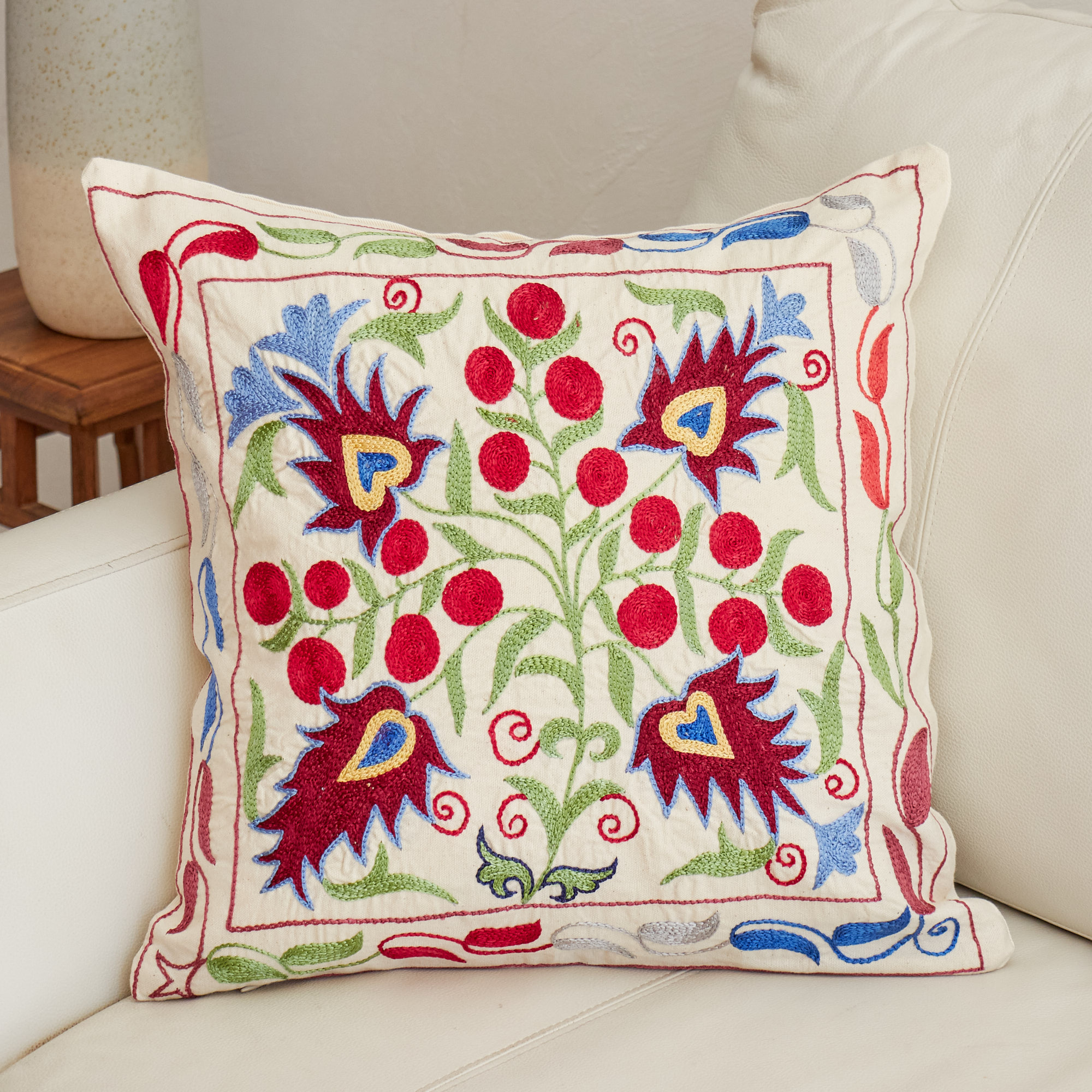 ウズベキスタンの伝統の手刺繍布・スザンニをクッションカバーに仕立てました。緻密なニードルワークによるチェーンステッチの手刺繍が見事。ひとつお部屋にあるだけで、お部屋が華やぐクッションです。
