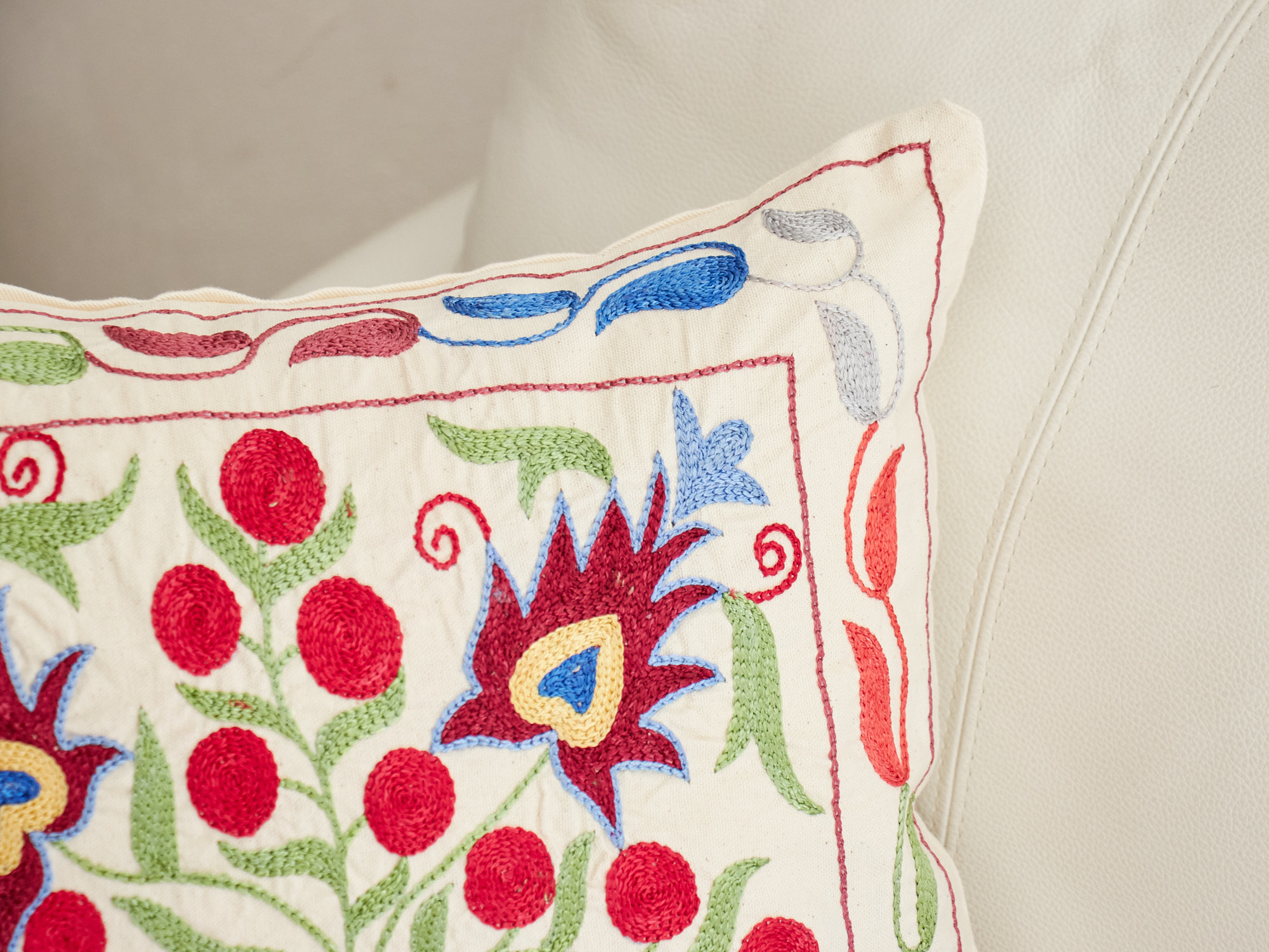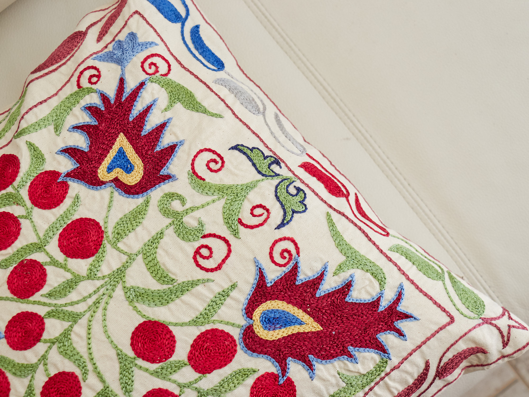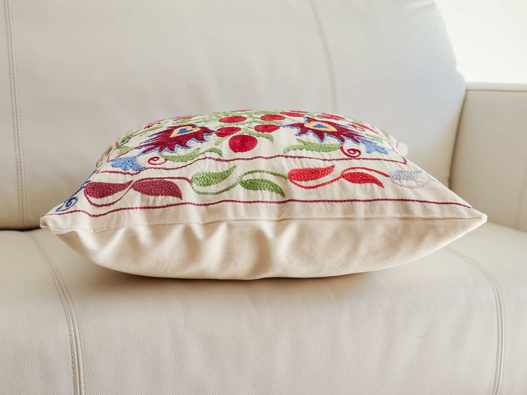 ウズベキスタンの伝統の手刺繍布・スザンニをクッションカバーに仕立てました。緻密なニードルワークによるチェーンステッチの手刺繍が見事。ひとつお部屋にあるだけで、お部屋が華やぐクッションです。