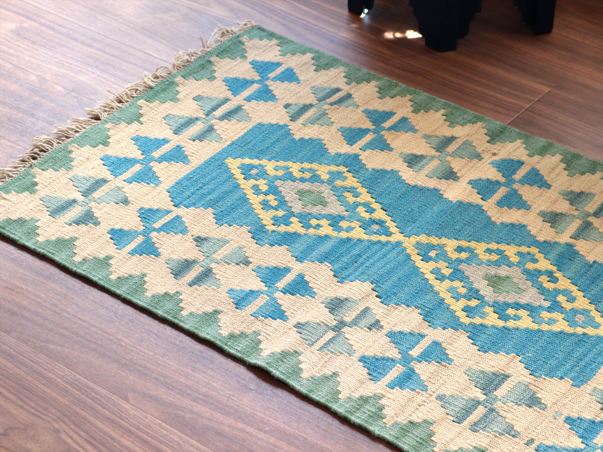 6-7mm程度の厚みがあり、パイル(毛足)がない平織りの敷物で表面は少しザラっとした肌ざわりです。織り手の自由なアイデアでデザインされていますので、左右対象でなかったり、モチーフが少しずれていたりということもありますが、世界で一枚だけの作品ですからその点はご了承ください。