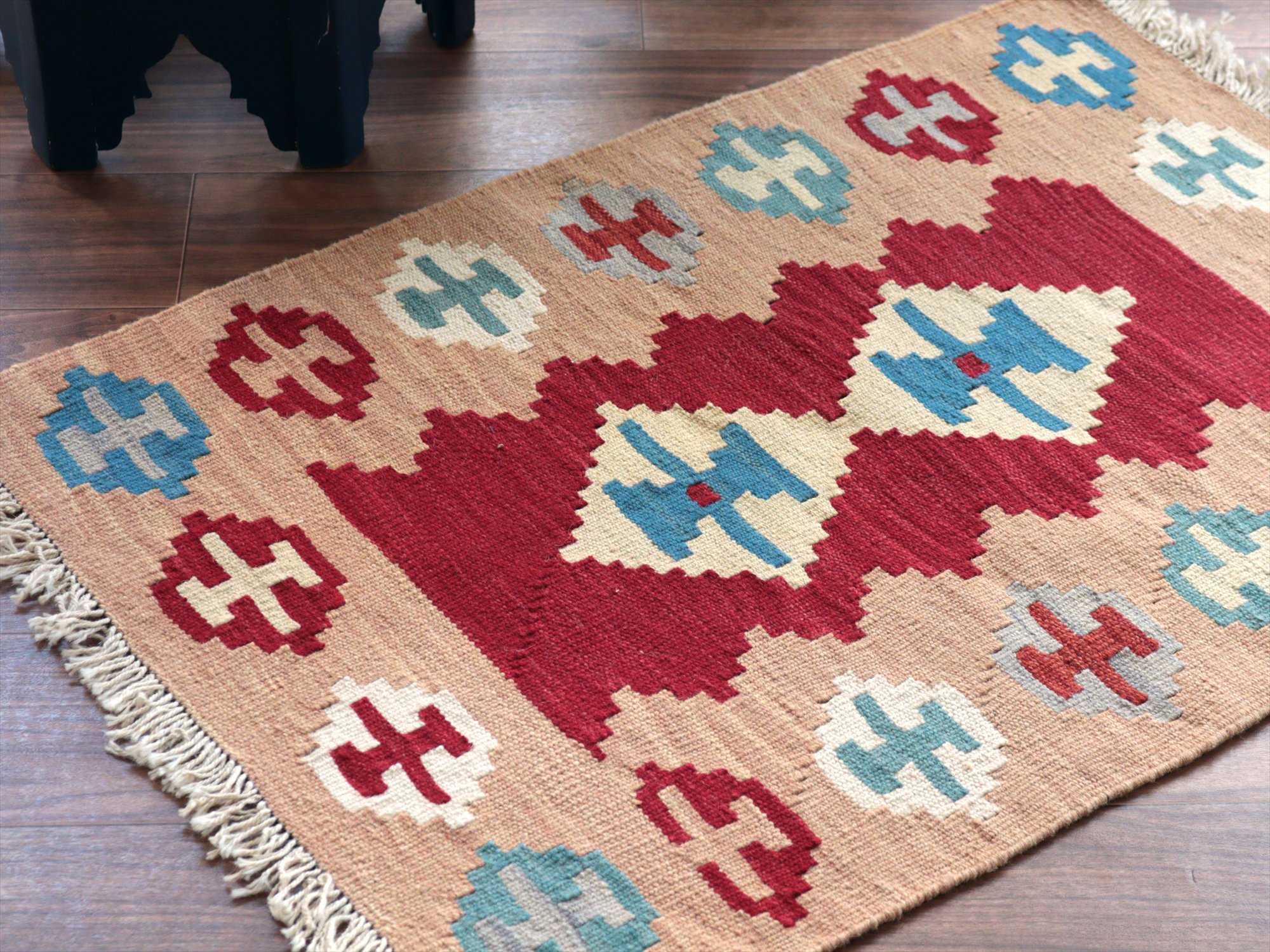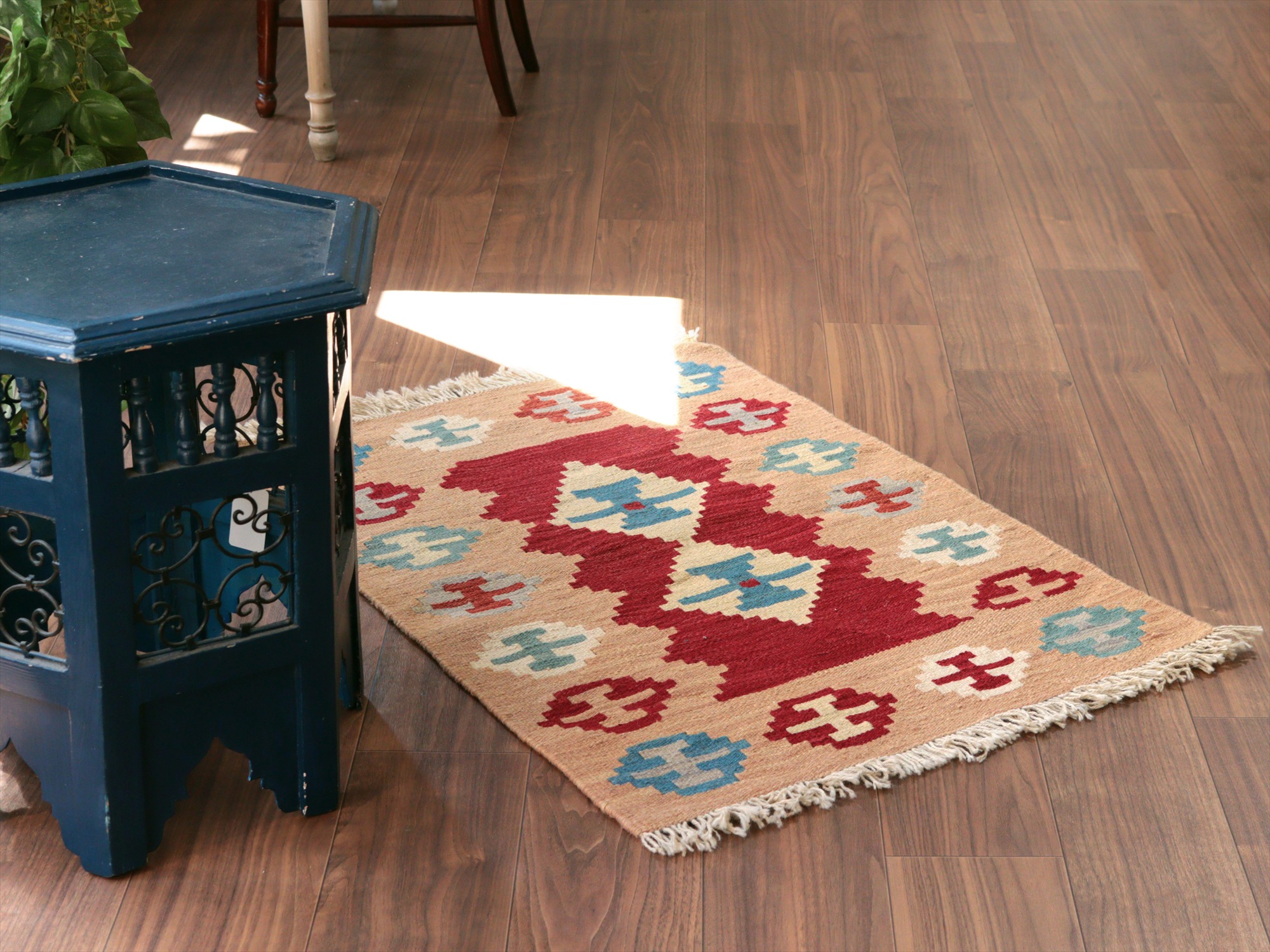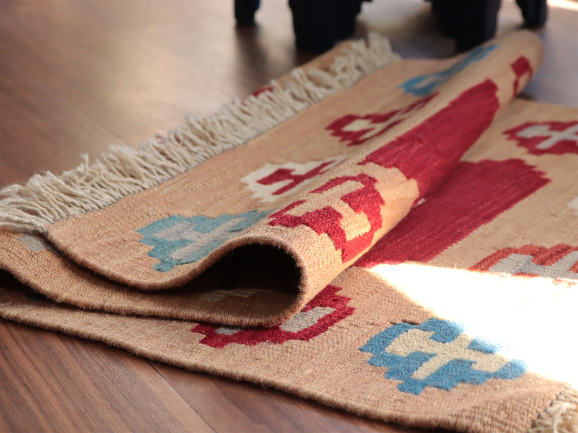 6-7mm程度の厚みがあり、パイル(毛足)がない平織りの敷物で表面は少しザラっとした肌ざわりです。織り手の自由なアイデアでデザインされていますので、左右対象でなかったり、モチーフが少しずれていたりということもありますが、世界で一枚だけの作品ですからその点はご了承ください。