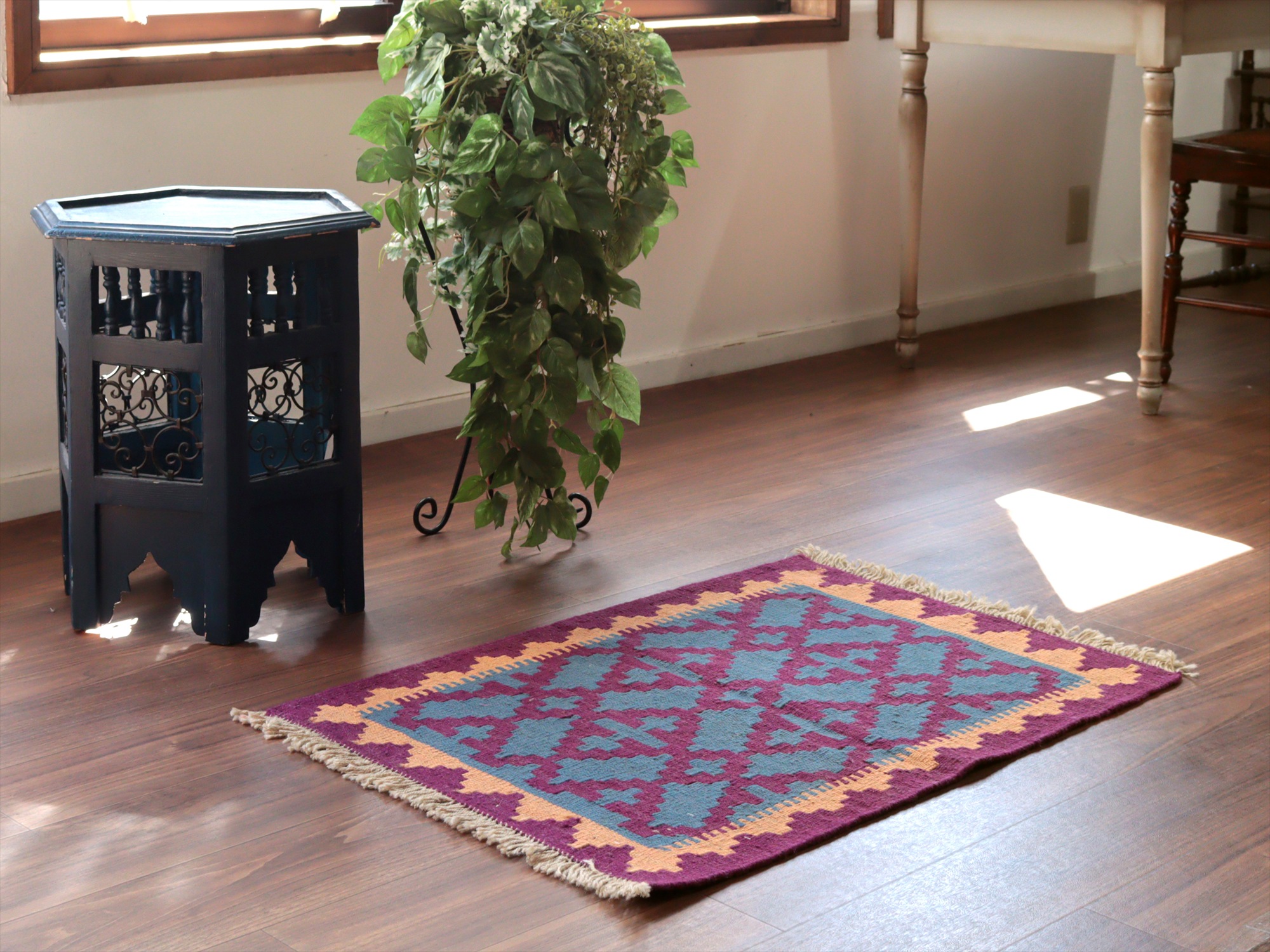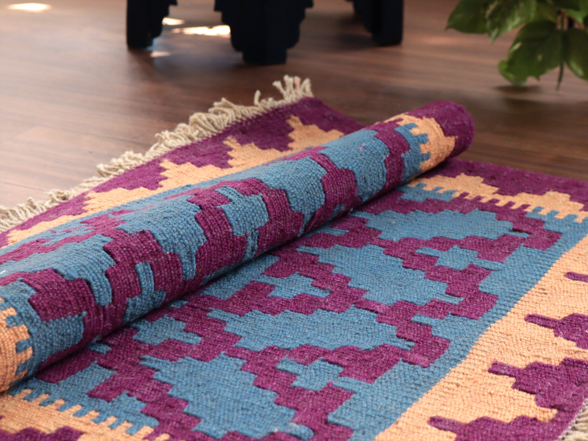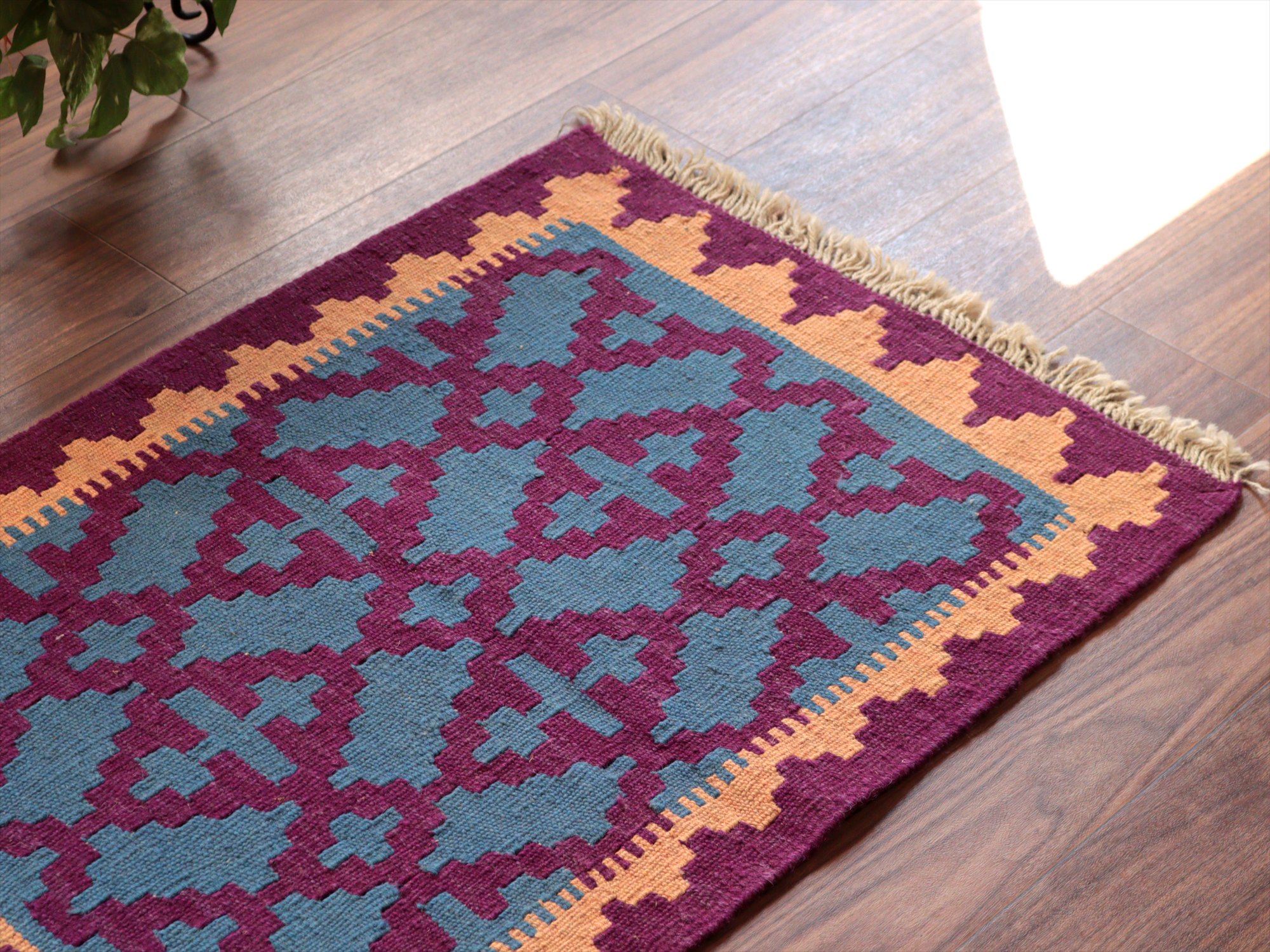 6-7mm程度の厚みがあり、パイル(毛足)がない平織りの敷物で表面は少しザラっとした肌ざわりです。織り手の自由なアイデアでデザインされていますので、左右対象でなかったり、モチーフが少しずれていたりということもありますが、世界で一枚だけの作品ですからその点はご了承ください。