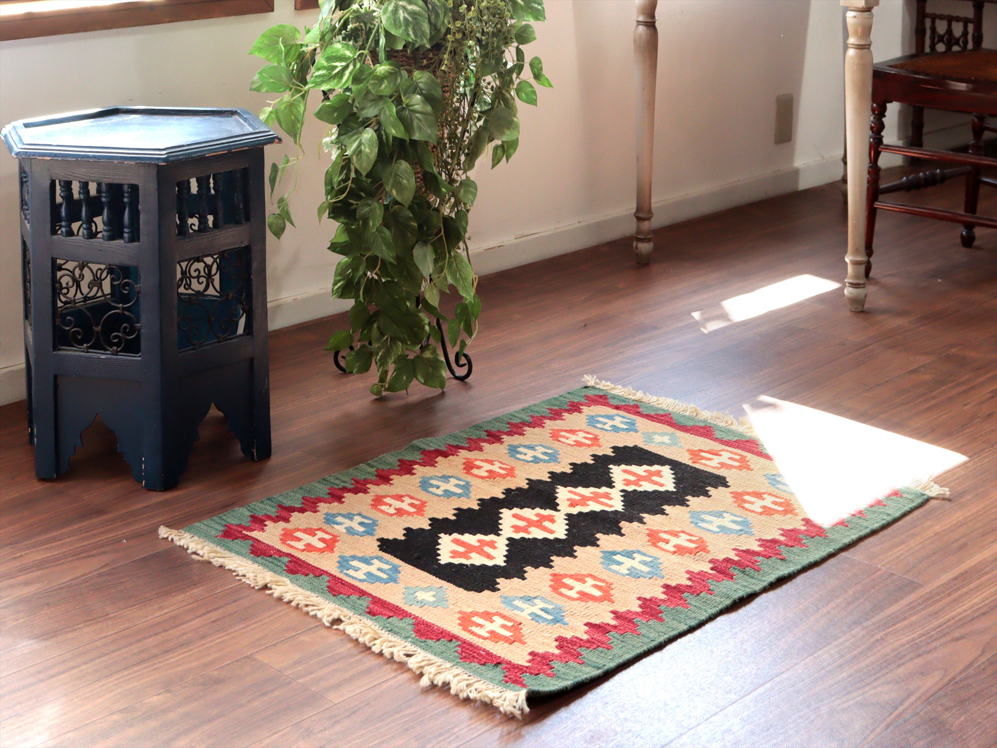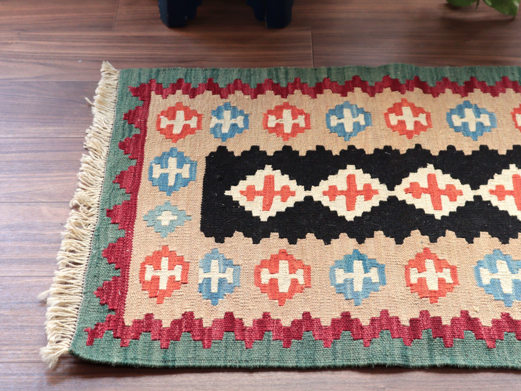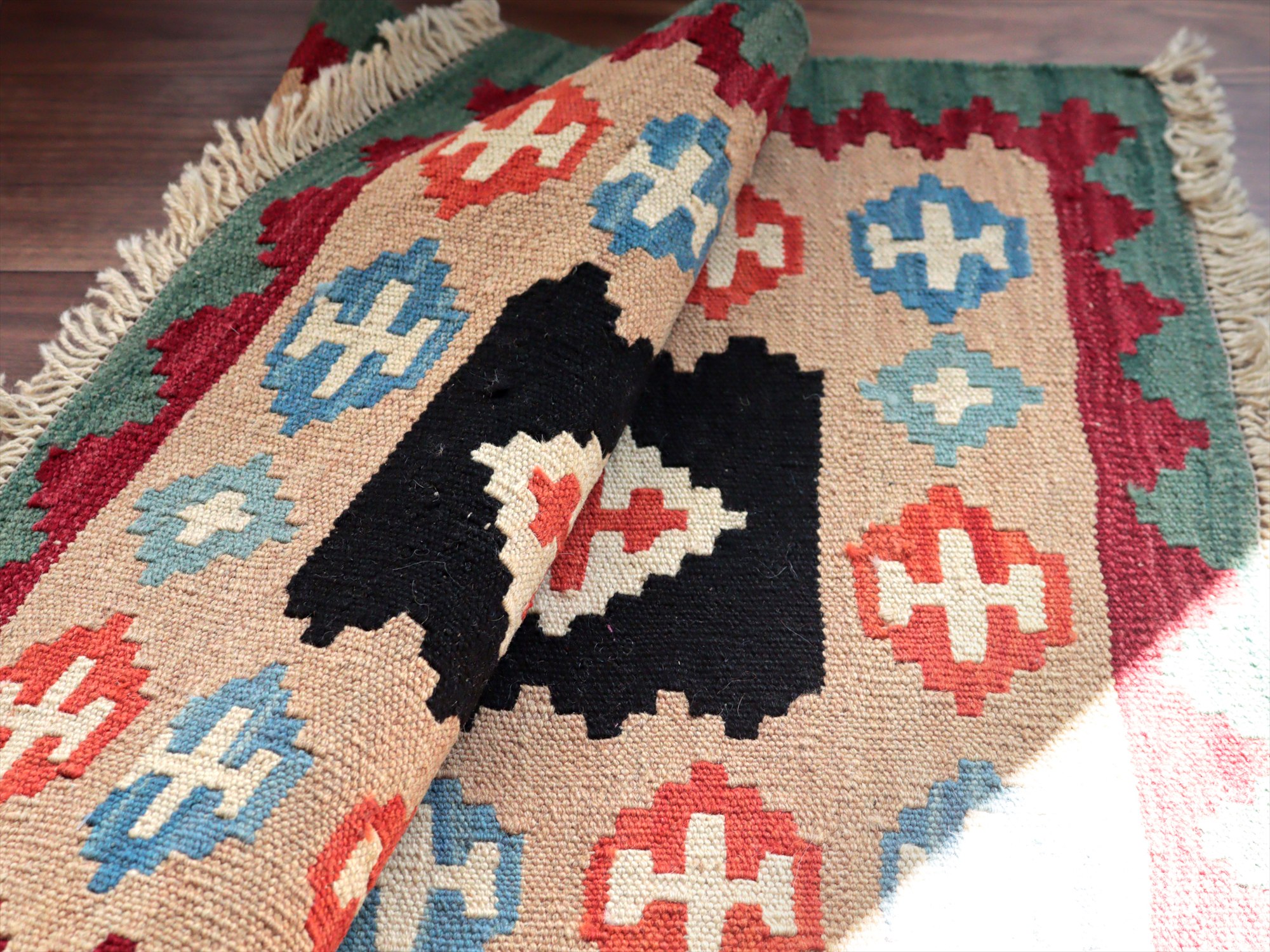 6-7mm程度の厚みがあり、パイル(毛足)がない平織りの敷物で表面は少しザラっとした肌ざわりです。織り手の自由なアイデアでデザインされていますので、左右対象でなかったり、モチーフが少しずれていたりということもありますが、世界で一枚だけの作品ですからその点はご了承ください。