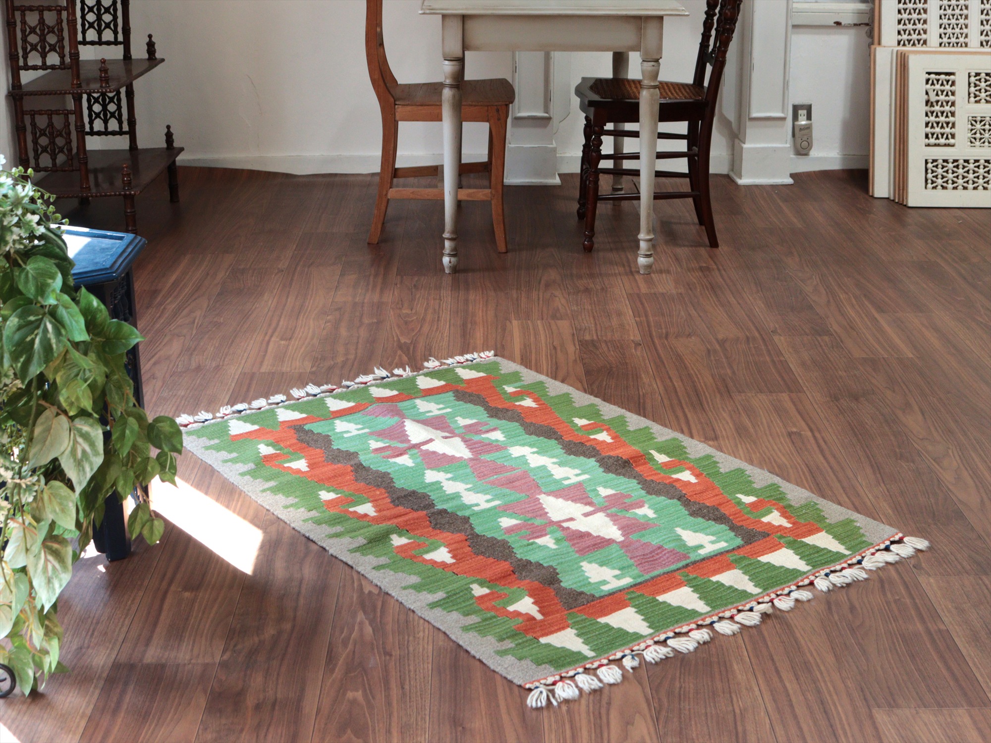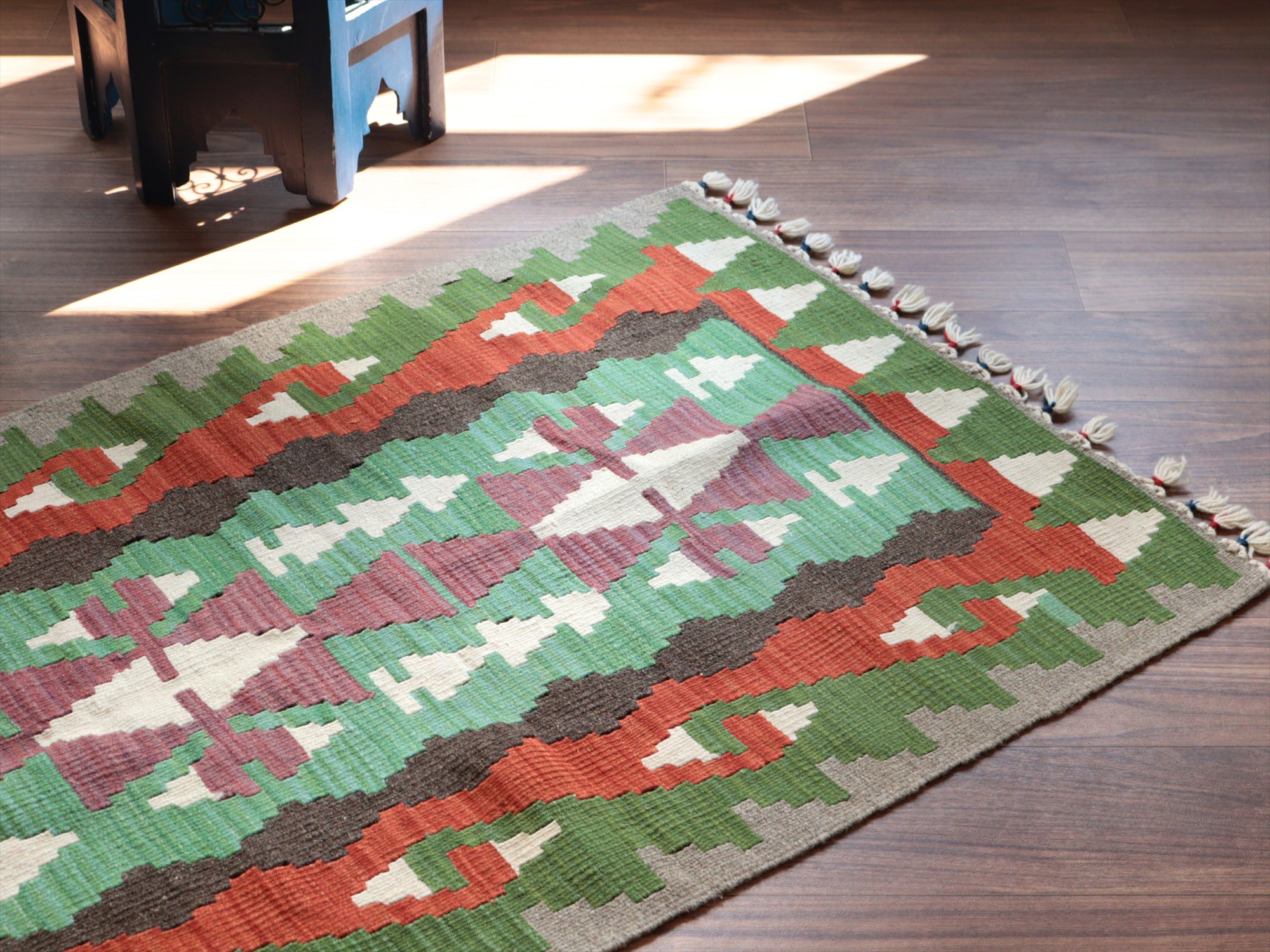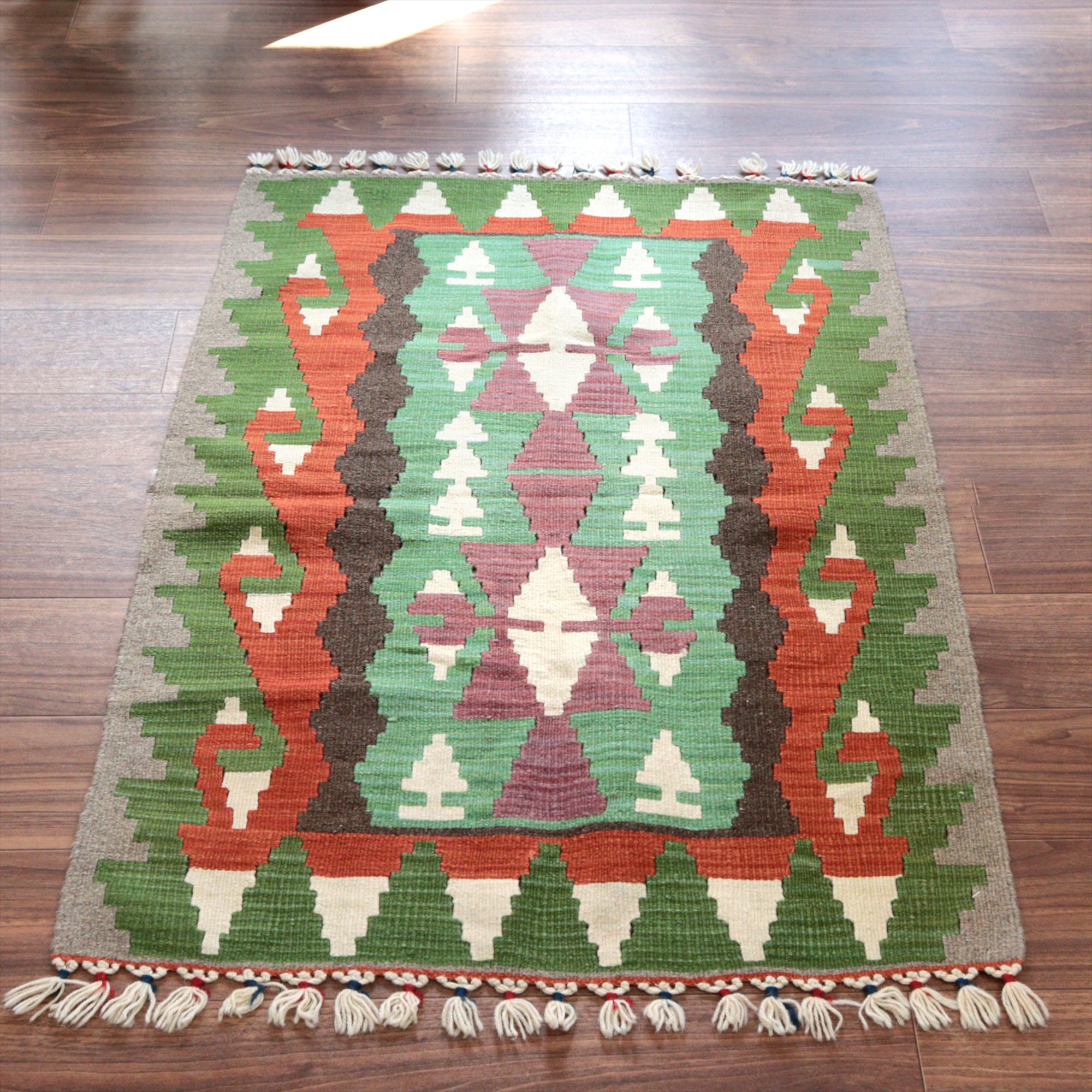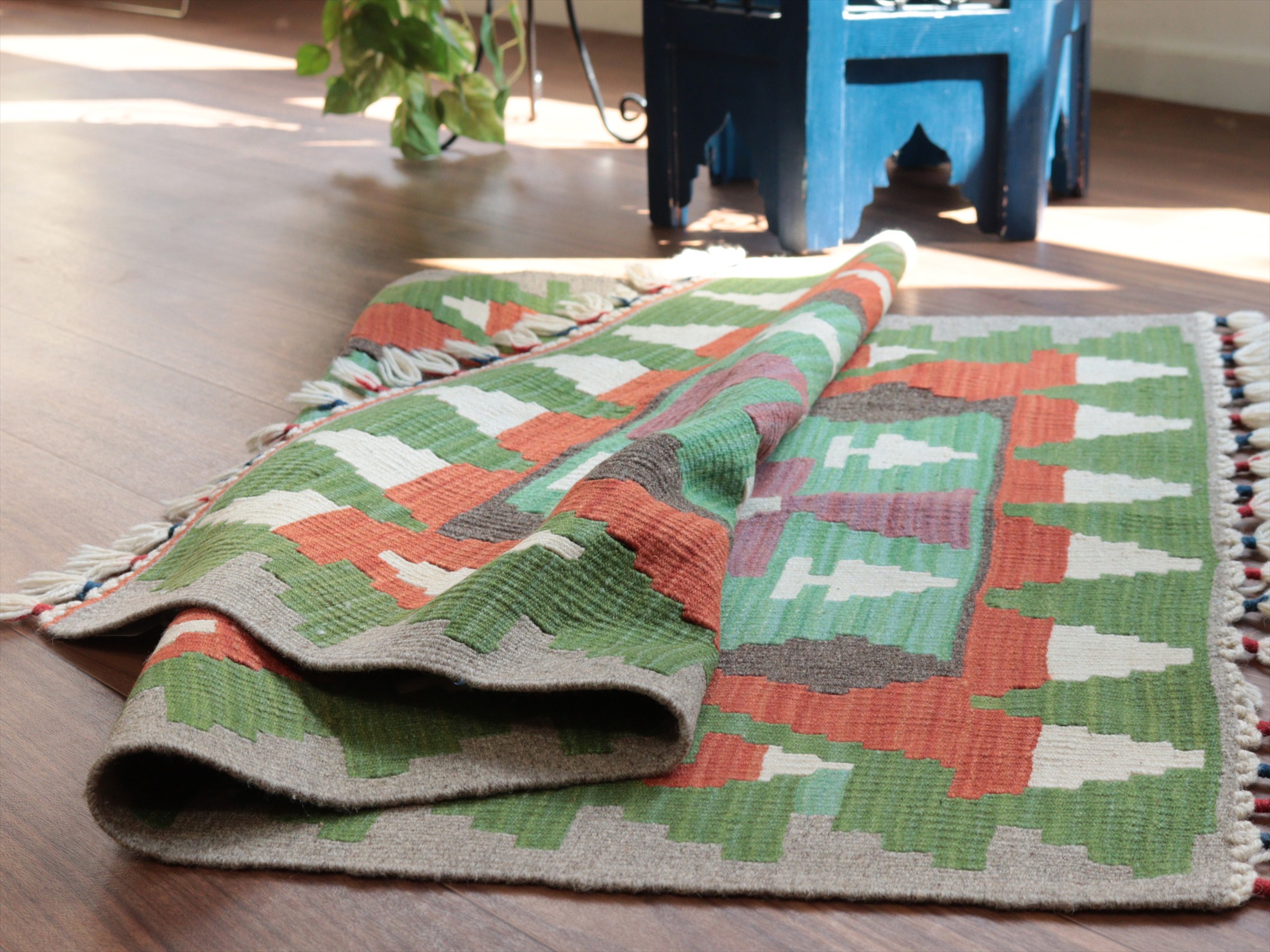 カイセリ産手織りキリム116×82cm グリーン&オレンジ トルコの手織りラグ