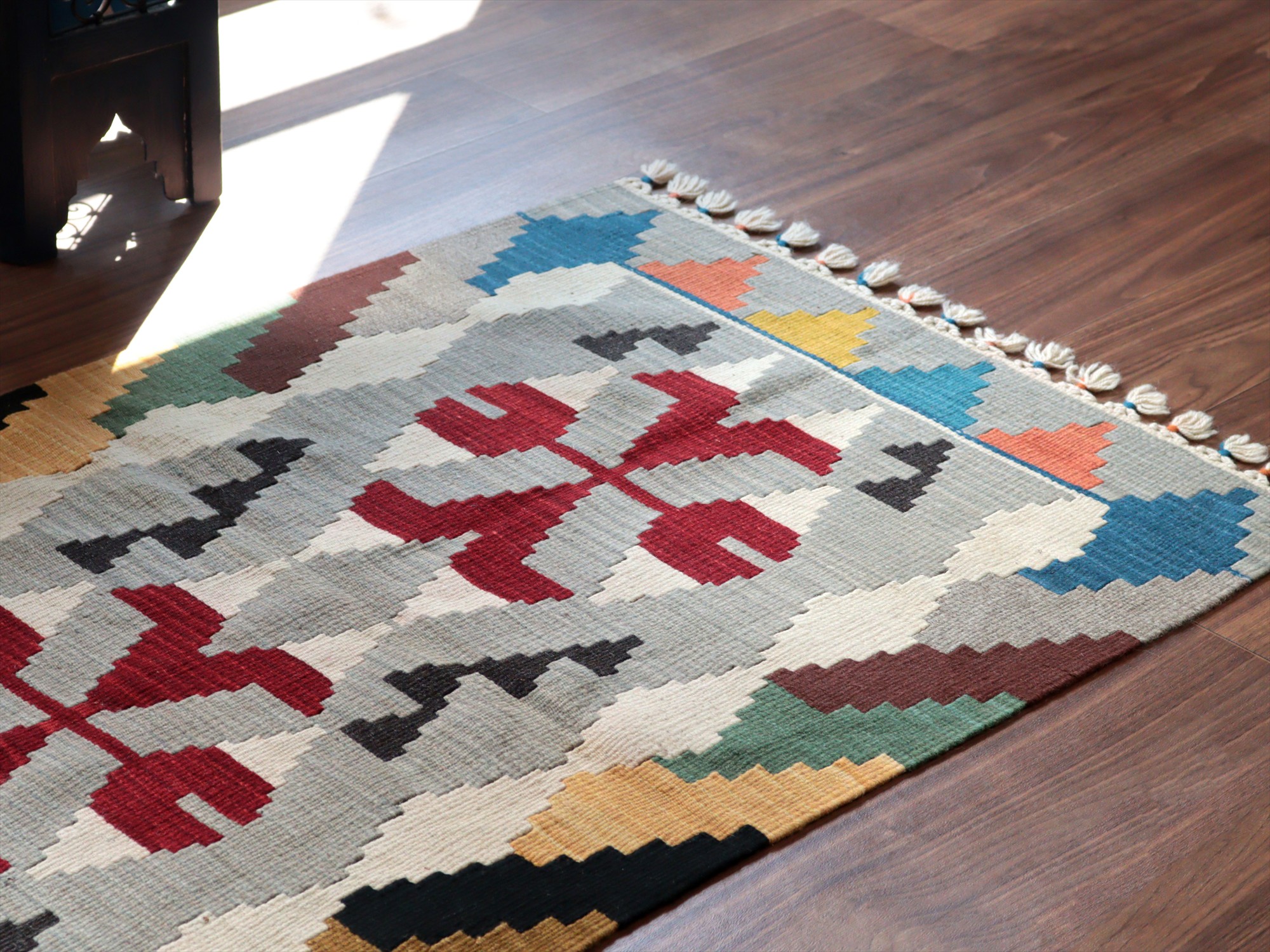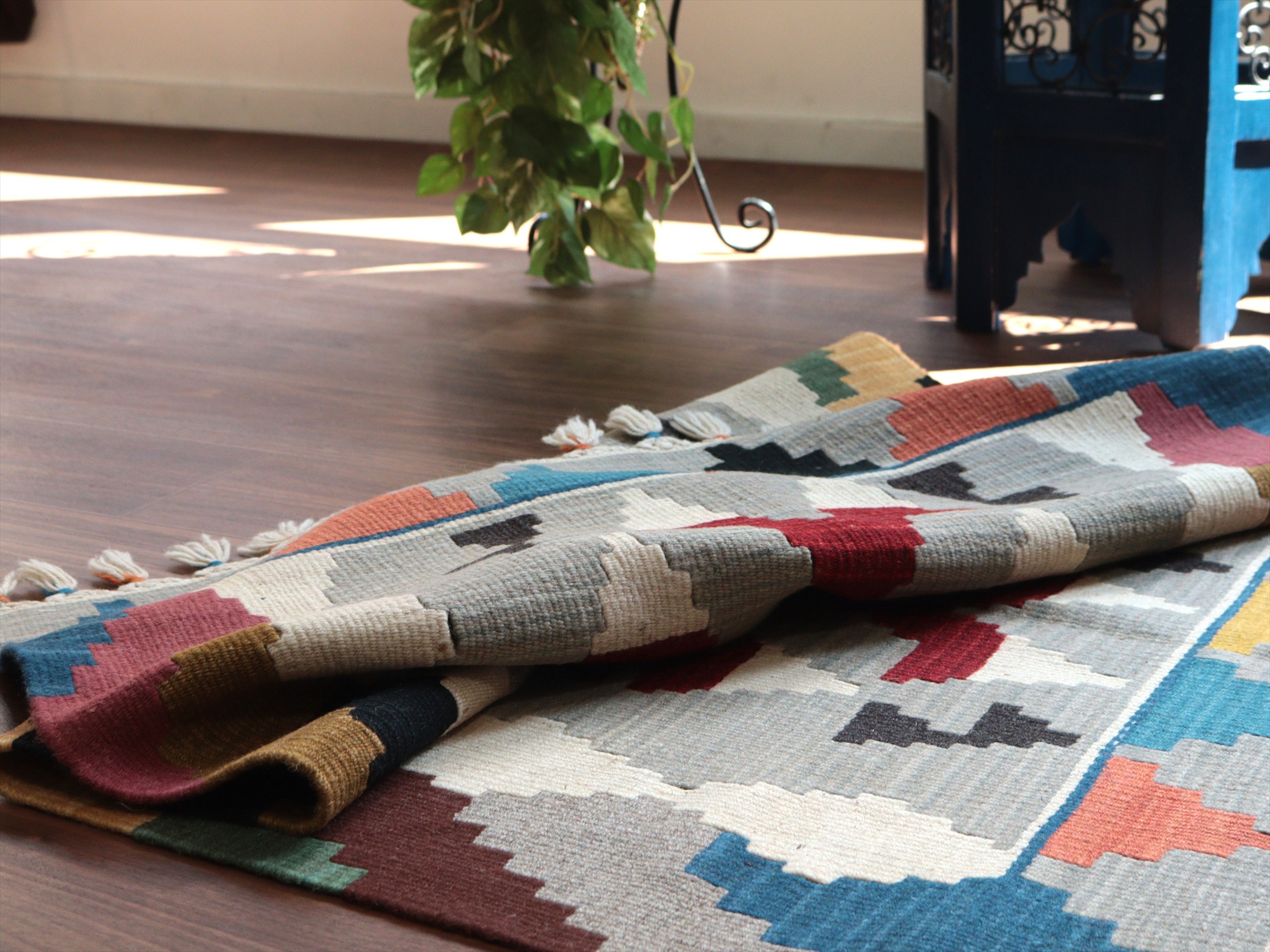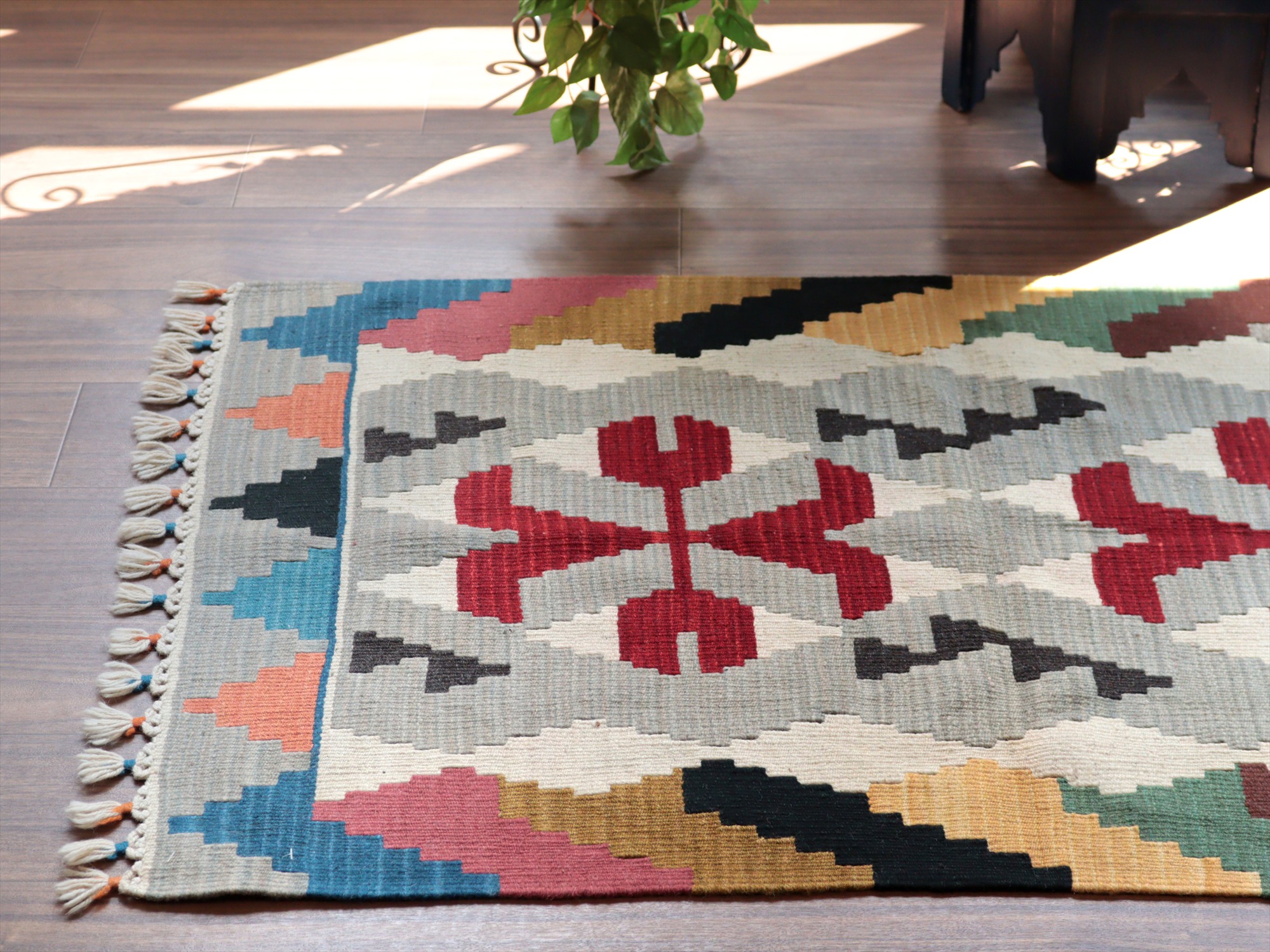 織り地がしなやかでやわらかいのがカイセリキリムの特徴です。やや厚みがあり、やさしい肌触り。色の切り替え部分には、キリムの織りの特徴で、縦に隙間が開いています(スリットと呼んでいます)。