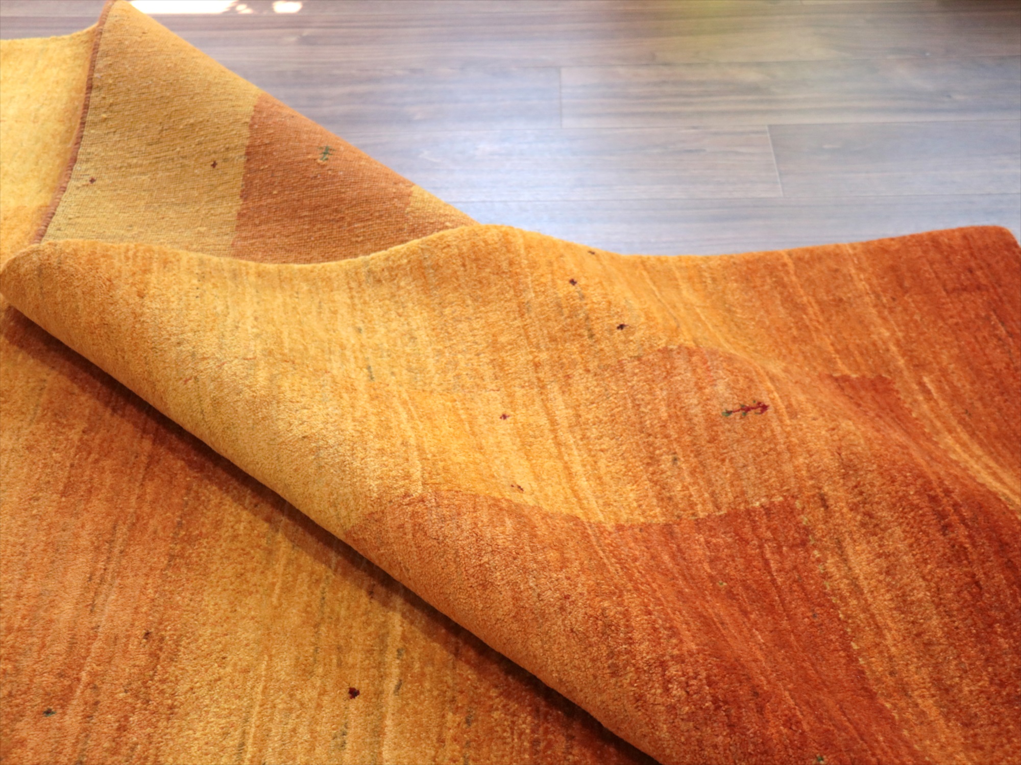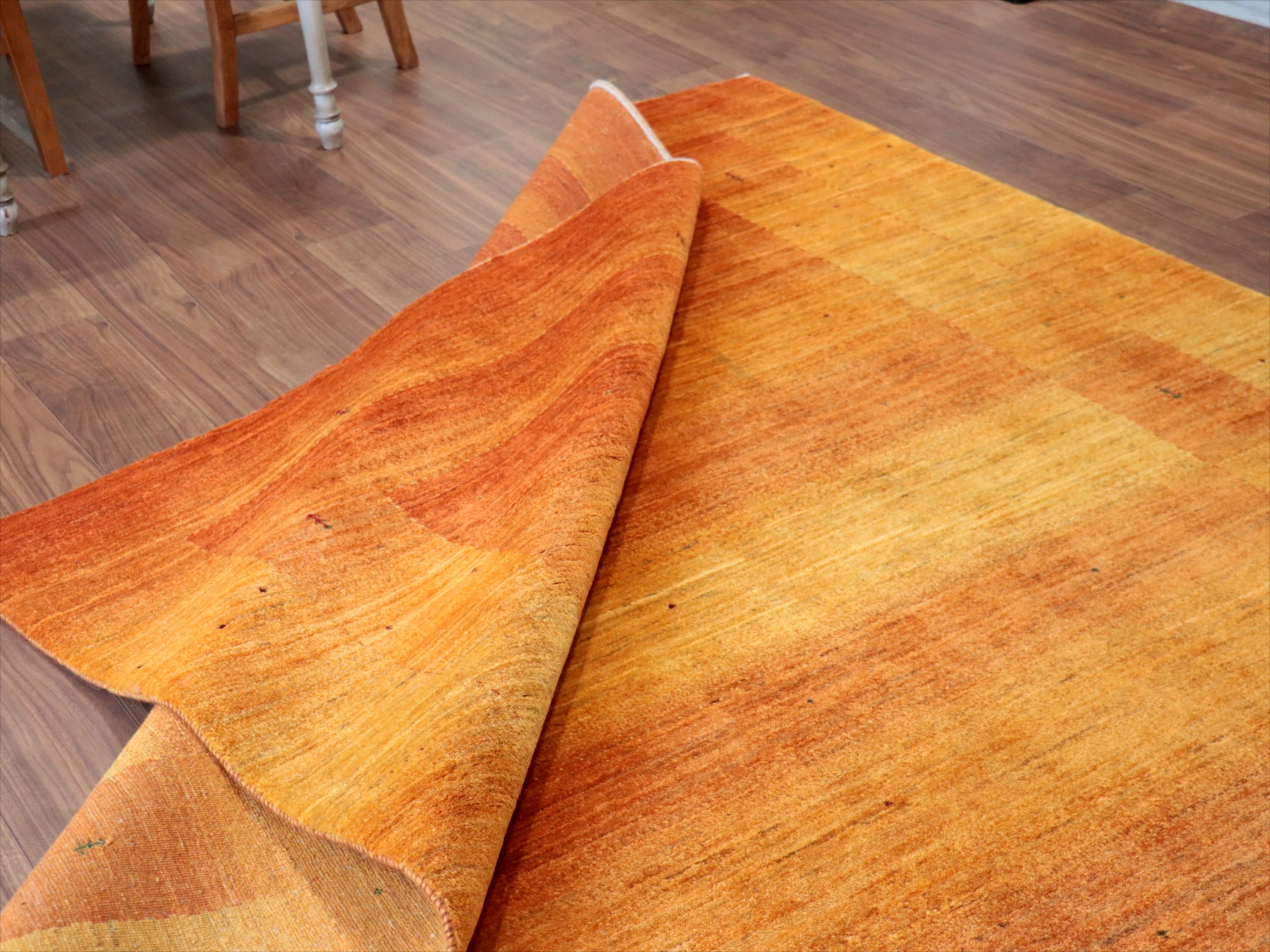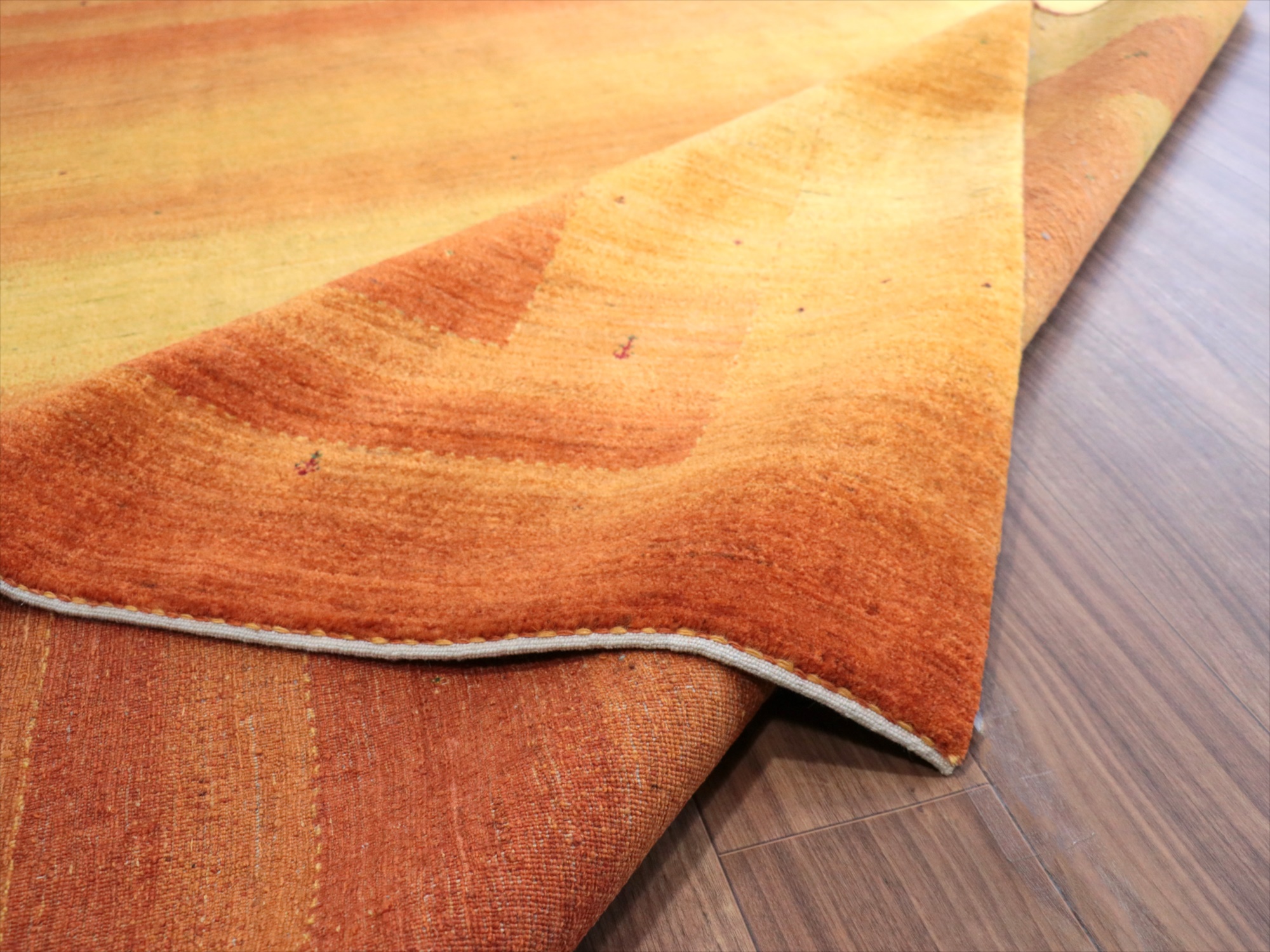 イエローからオレンジまでのグラデーションを重ねてボーダーデザインを表現。パイルの背面から見ると明るく鮮やかに、反対方向から見るとグッと落ち着いた濃い染めの色が楽しめます。
