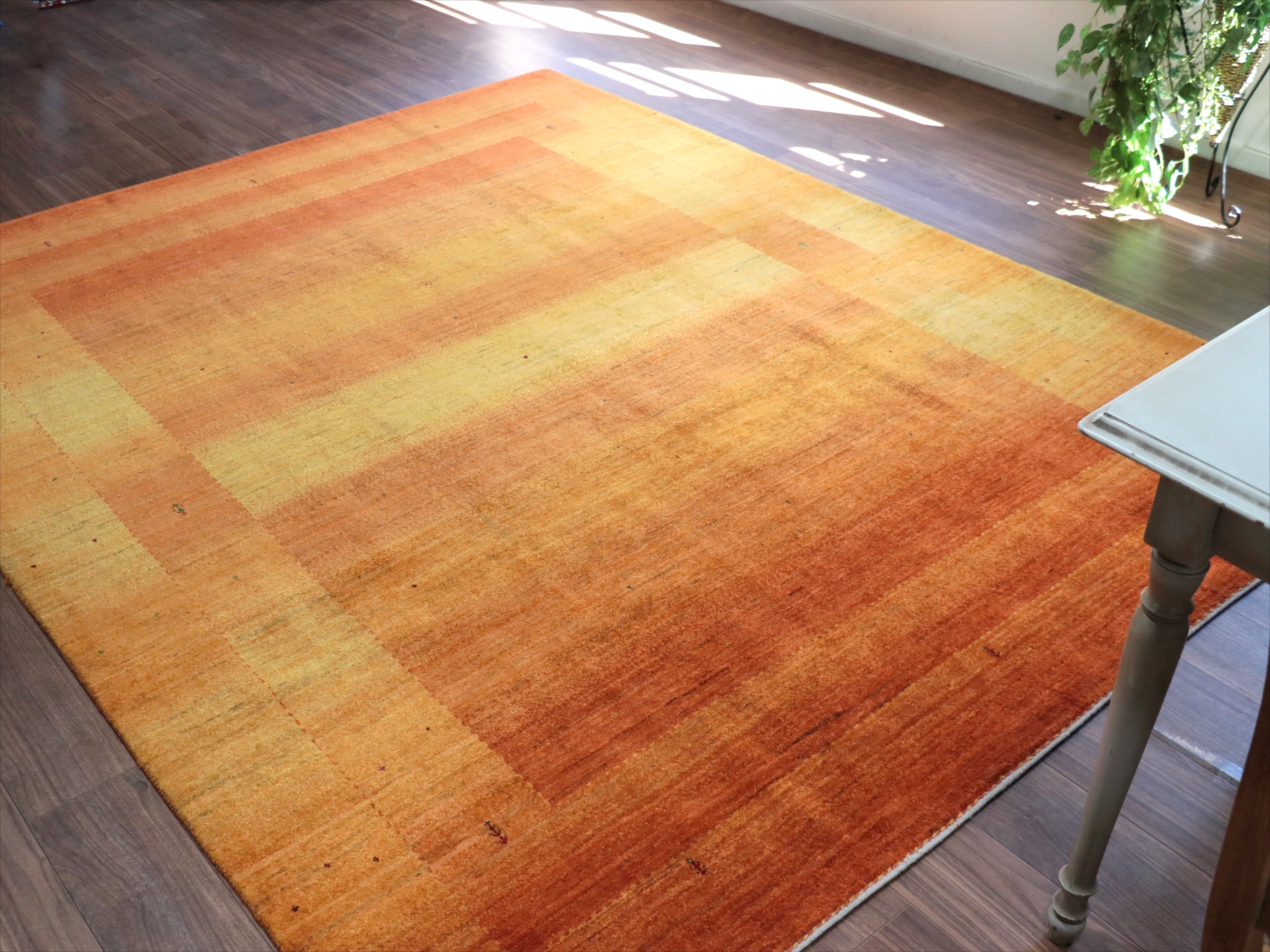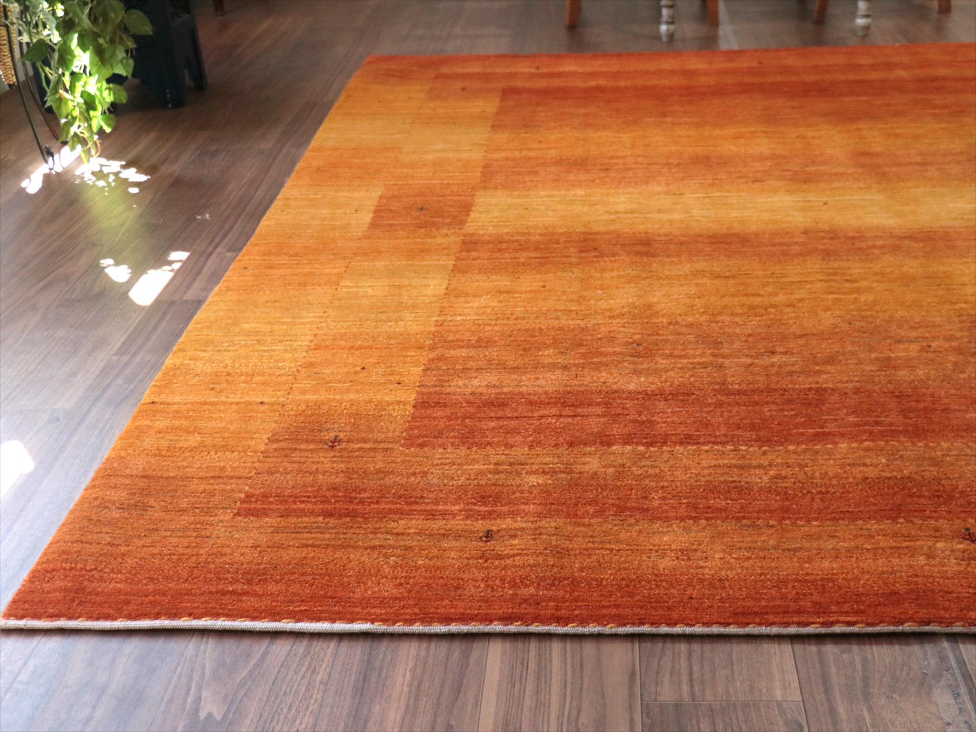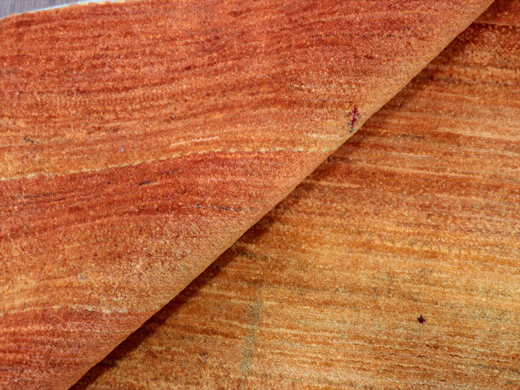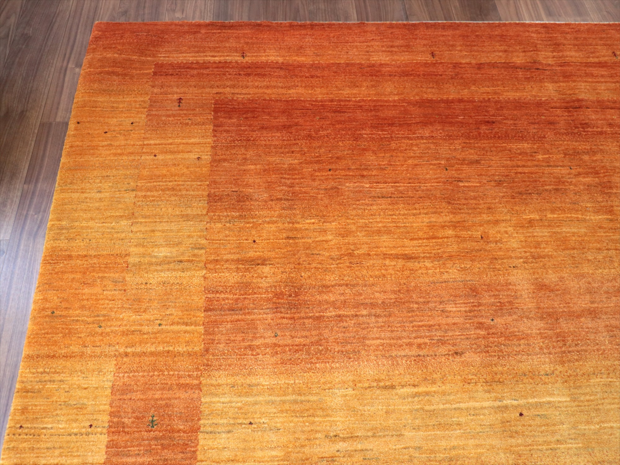 イエローからオレンジまでのグラデーションを重ねてボーダーデザインを表現。パイルの背面から見ると明るく鮮やかに、反対方向から見るとグッと落ち着いた濃い染めの色が楽しめます。