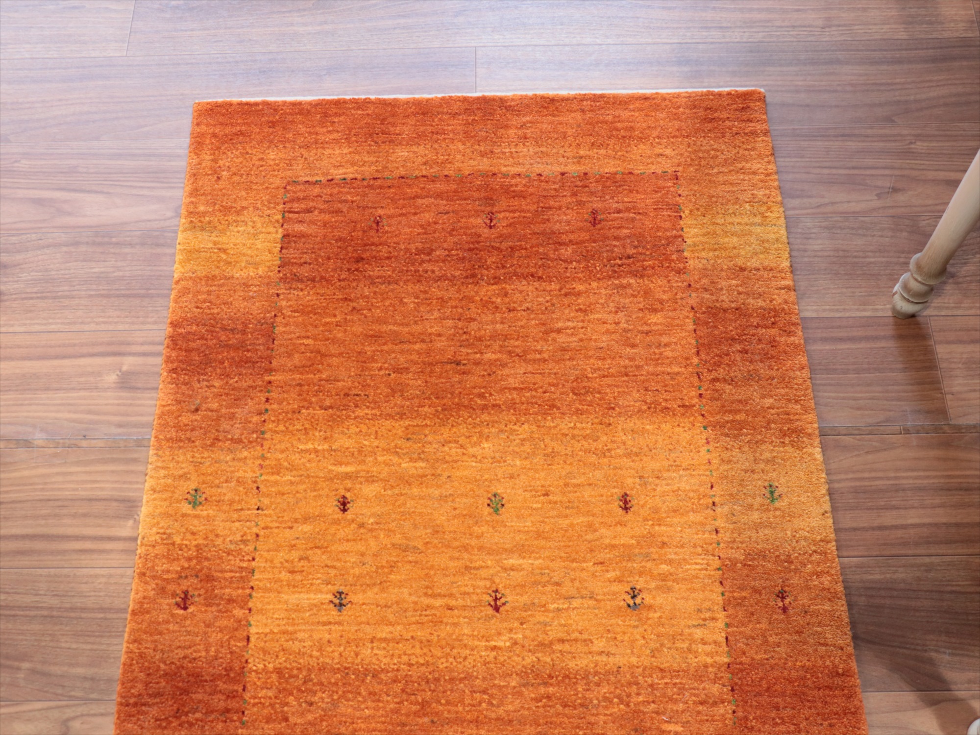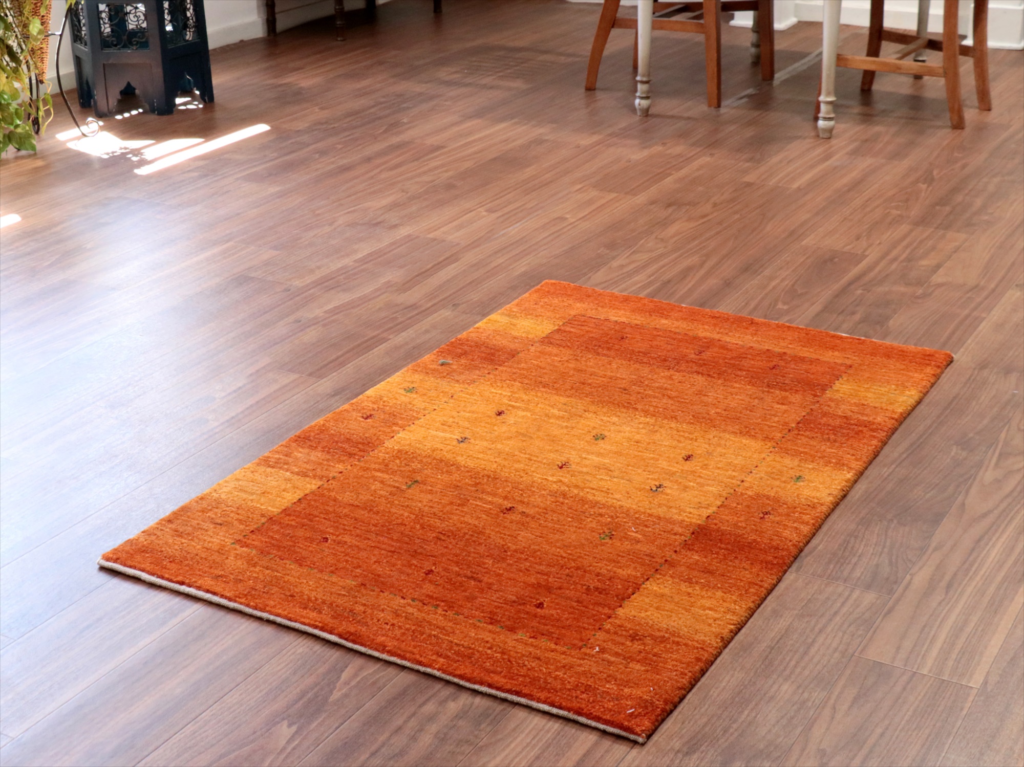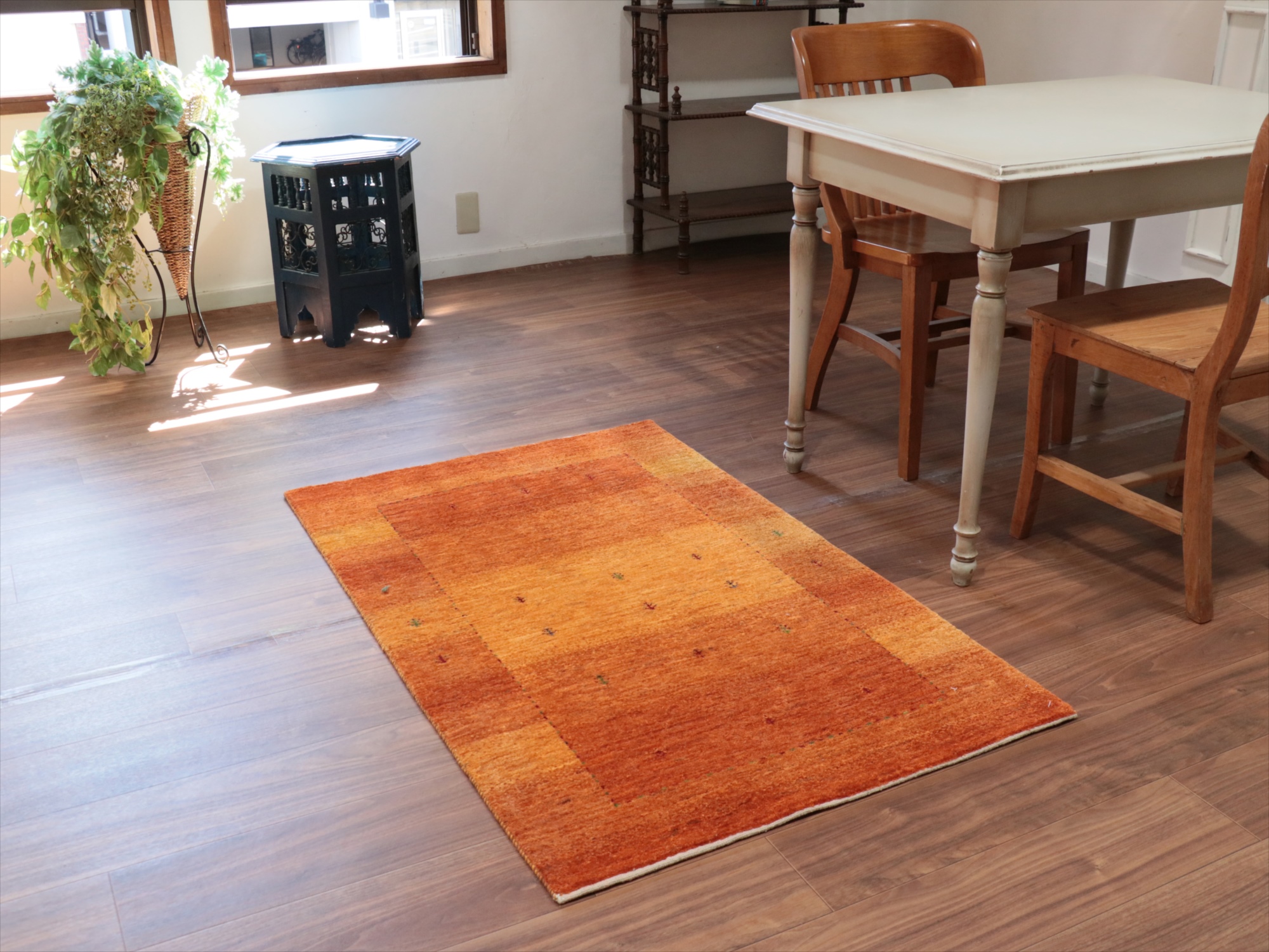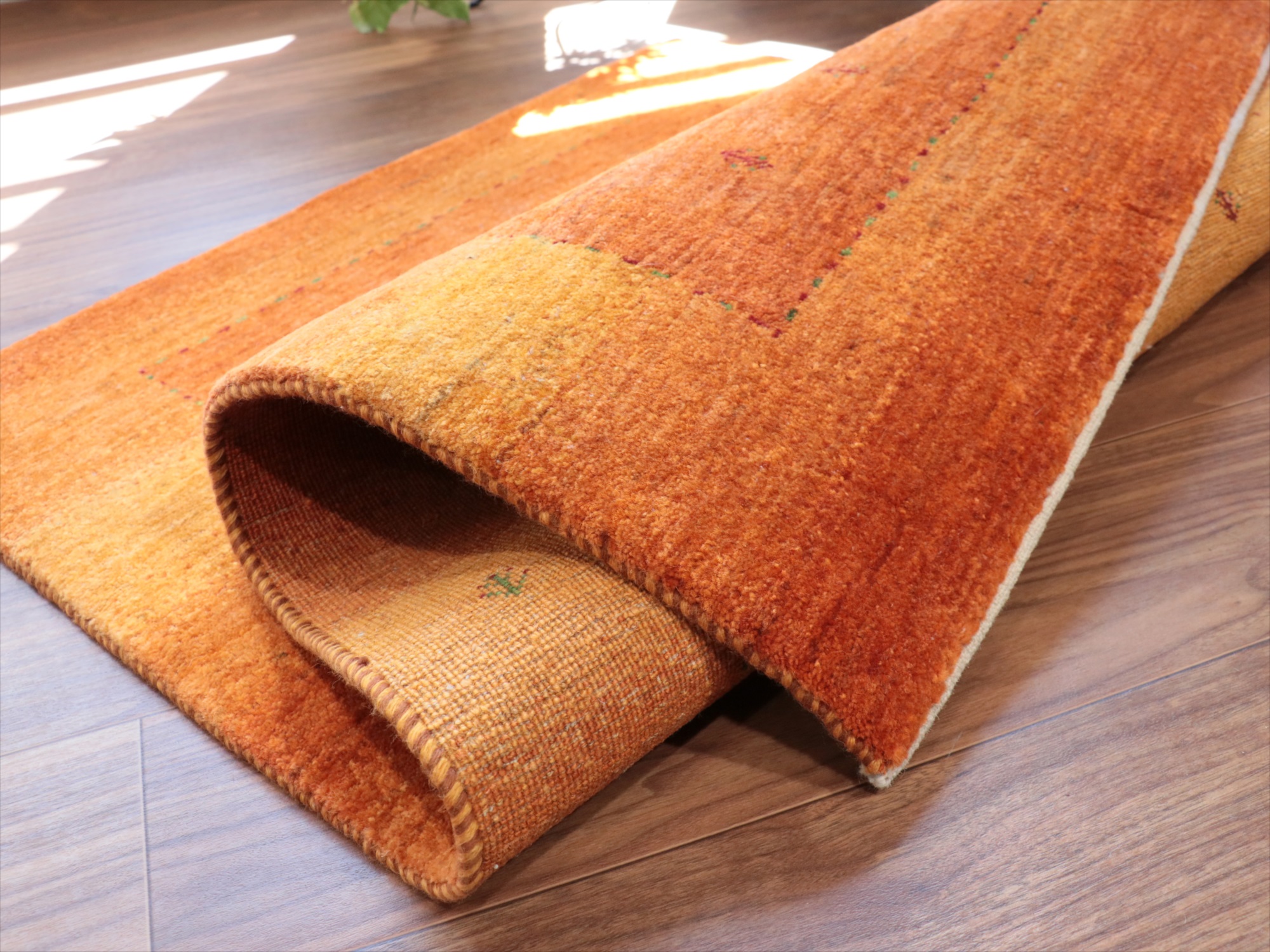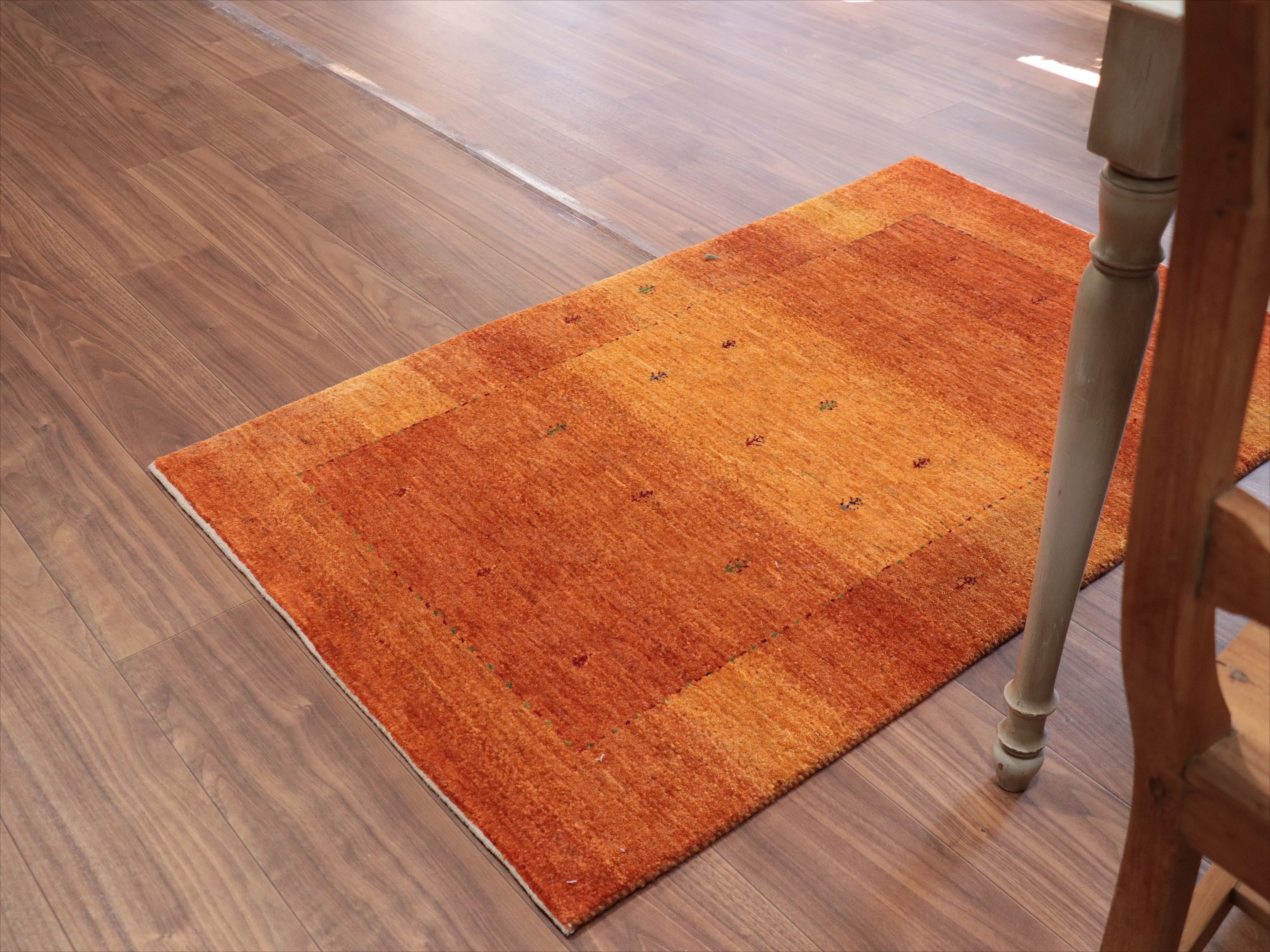 オレンジの濃淡の色合いでボーダーストライプのデザインに仕上げた1枚。草木染の色の美しさが堪能できる、繊細なグラデーションのシンプルなデザインです。敷くだけでお部屋の雰囲気がぱっと明るい印象になります。