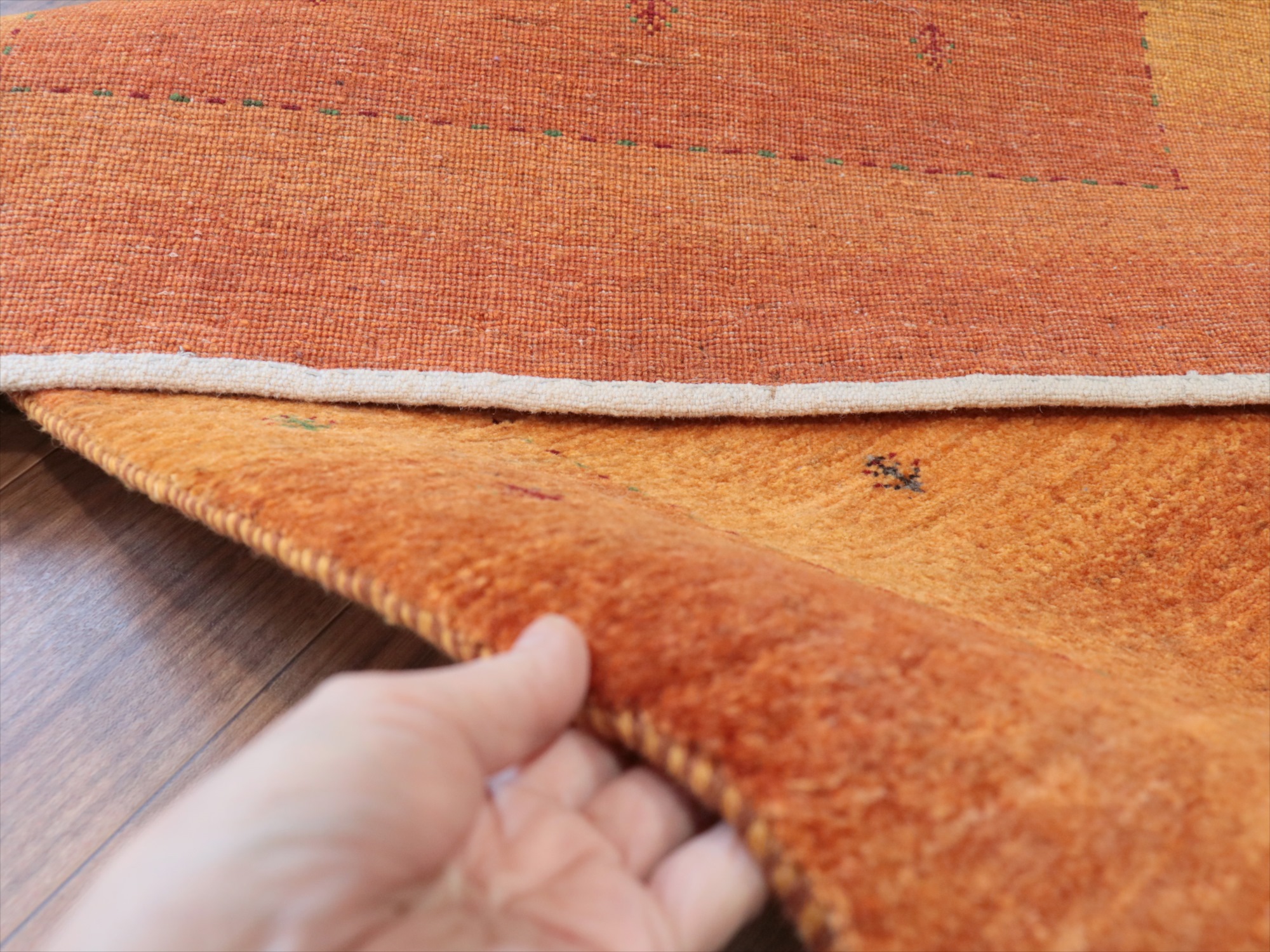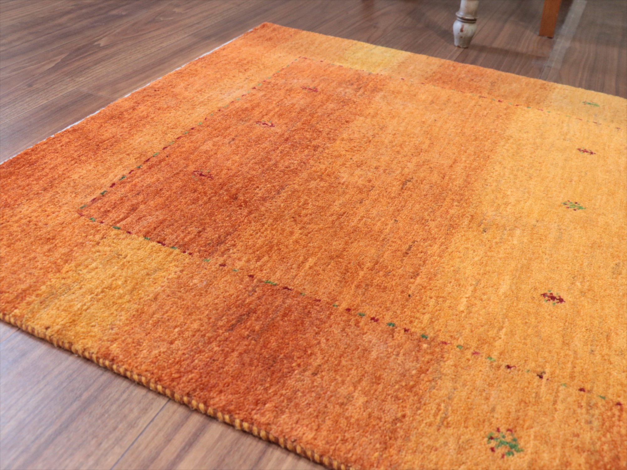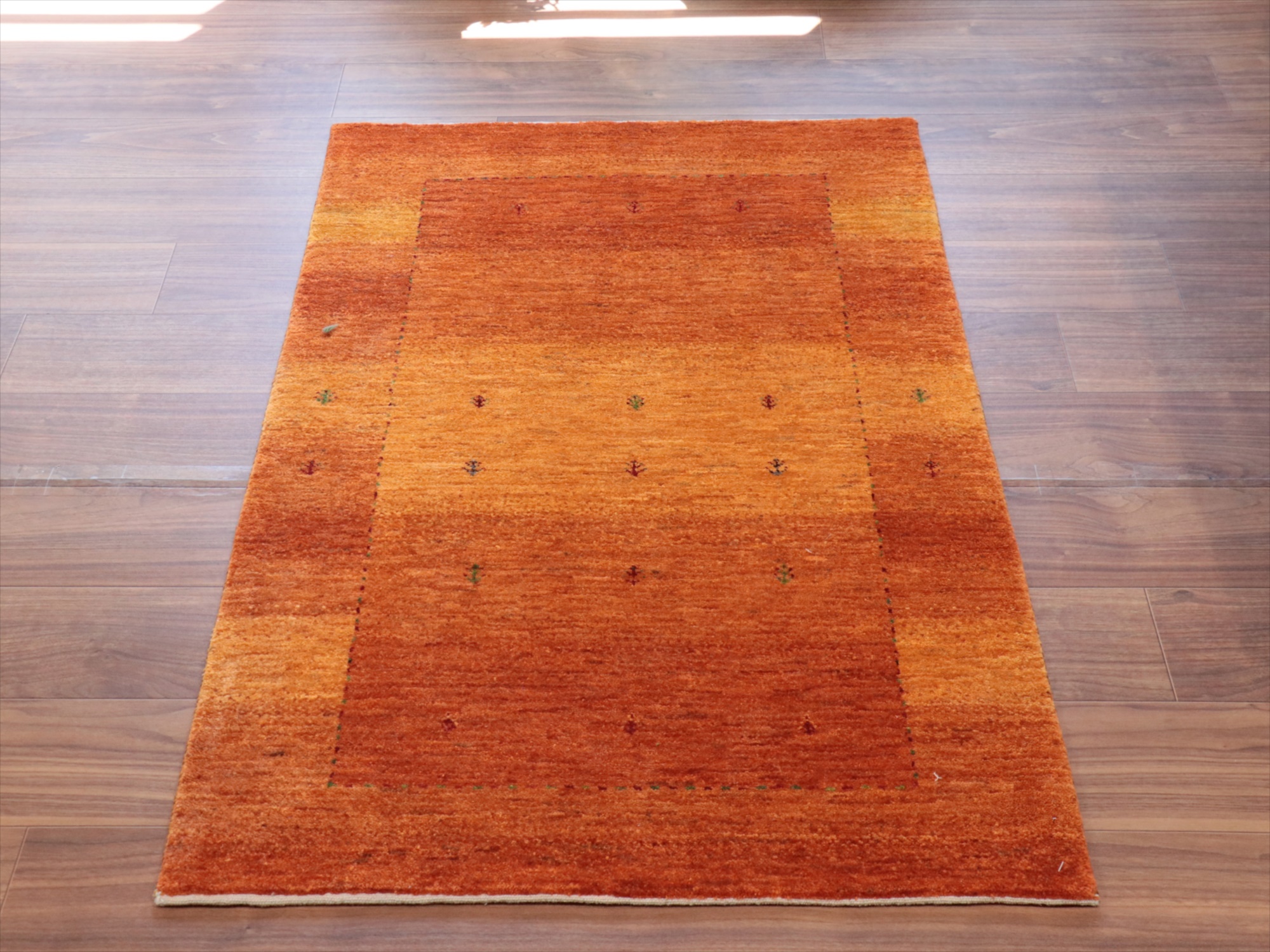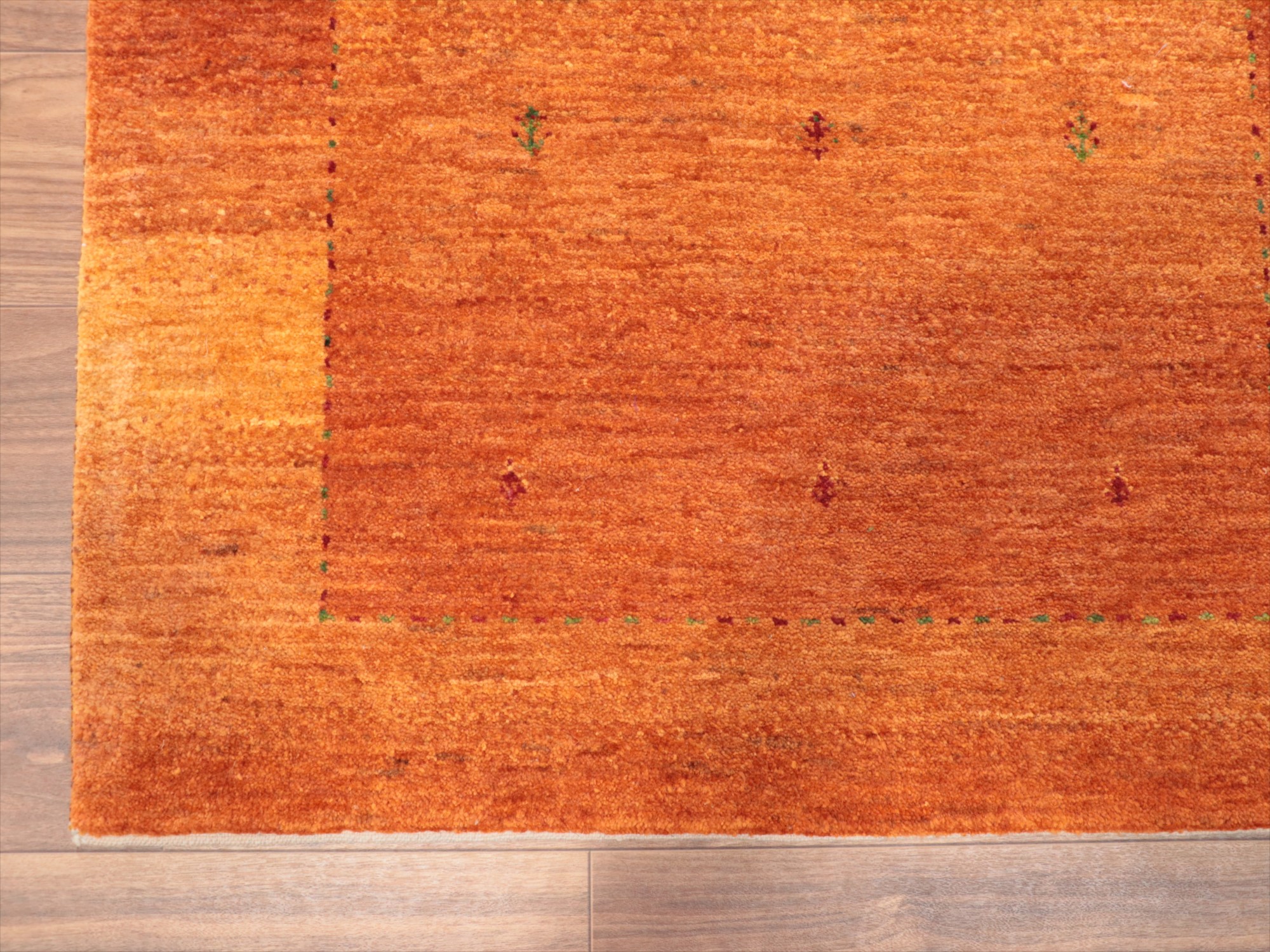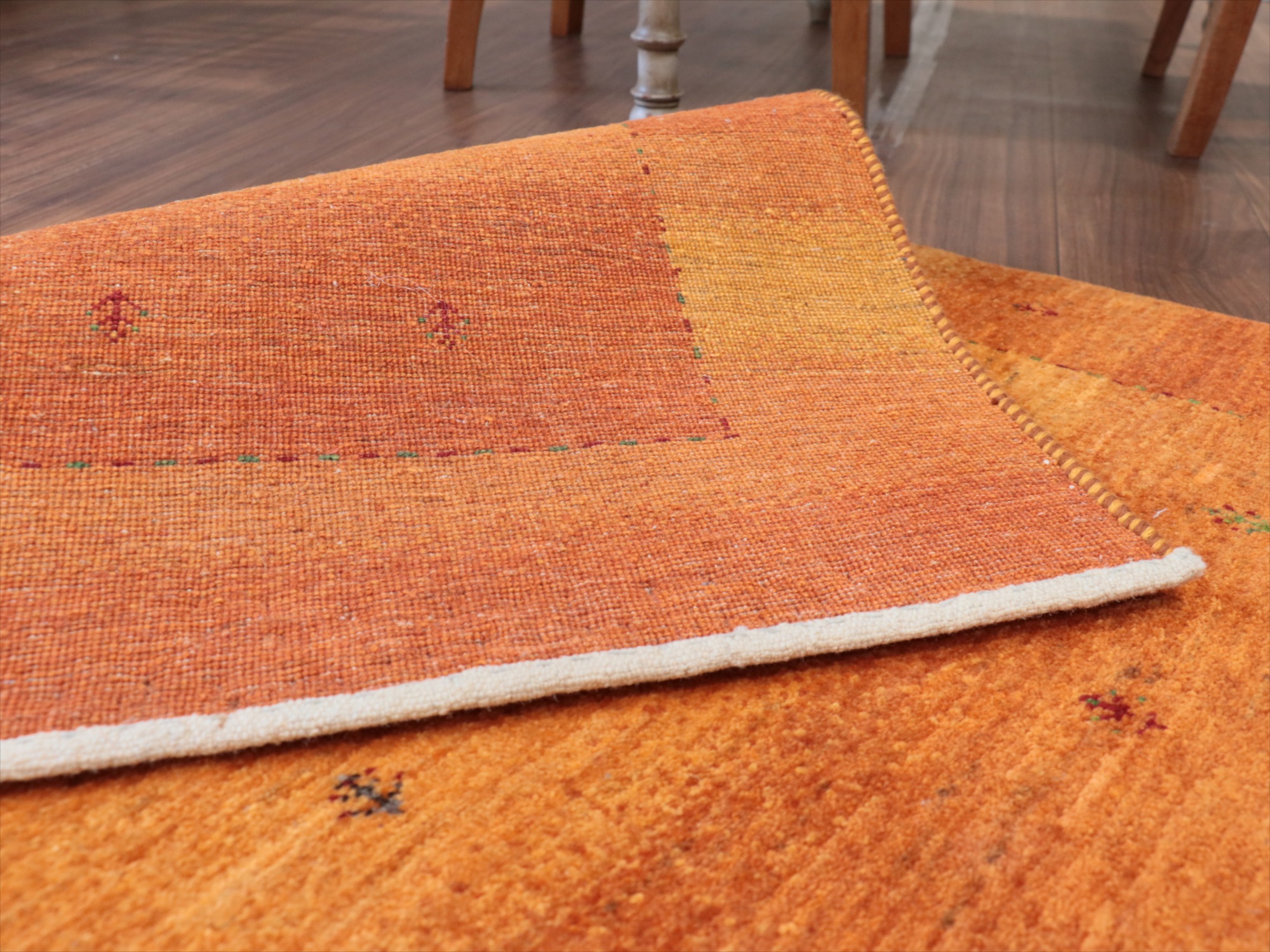 オレンジの濃淡の色合いでボーダーストライプのデザインに仕上げた1枚。草木染の色の美しさが堪能できる、繊細なグラデーションのシンプルなデザインです。敷くだけでお部屋の雰囲気がぱっと明るい印象になります。