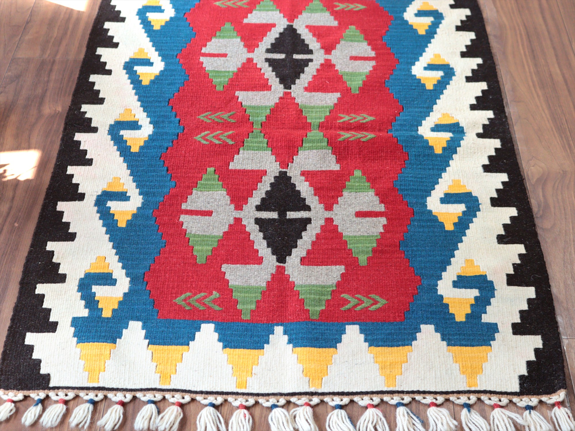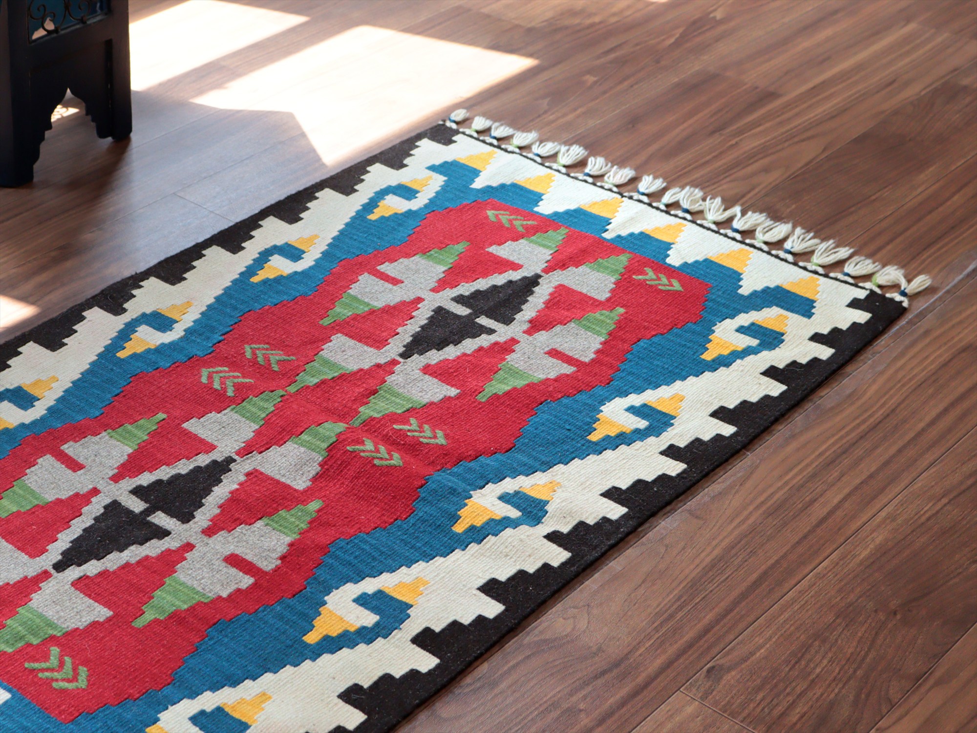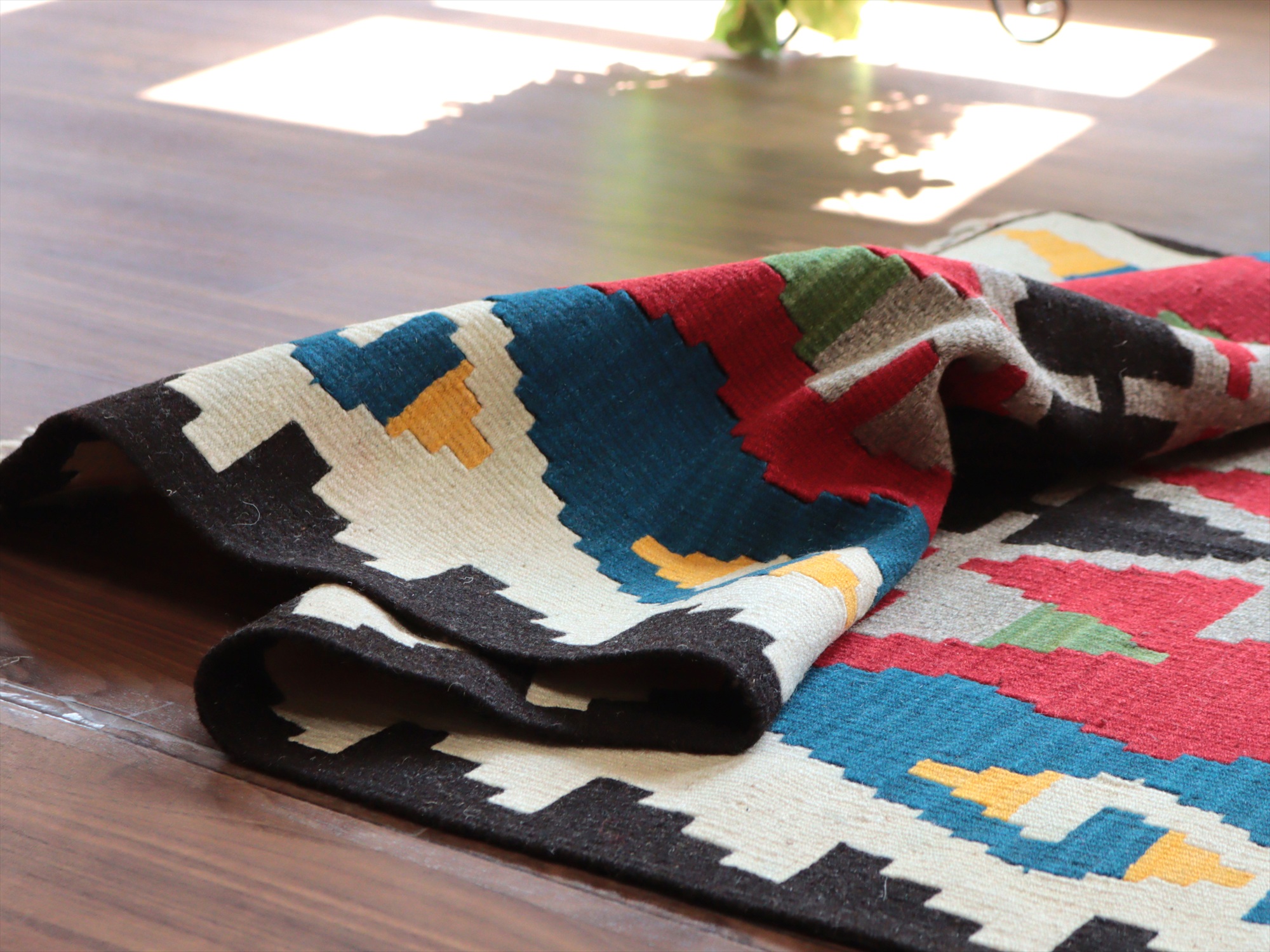 織り地がしなやかでやわらかいのがカイセリキリムの特徴です。やや厚みがあり、やさしい肌触り。色の切り替え部分には、キリムの織りの特徴で、縦に隙間が開いています(スリットと呼んでいます)。