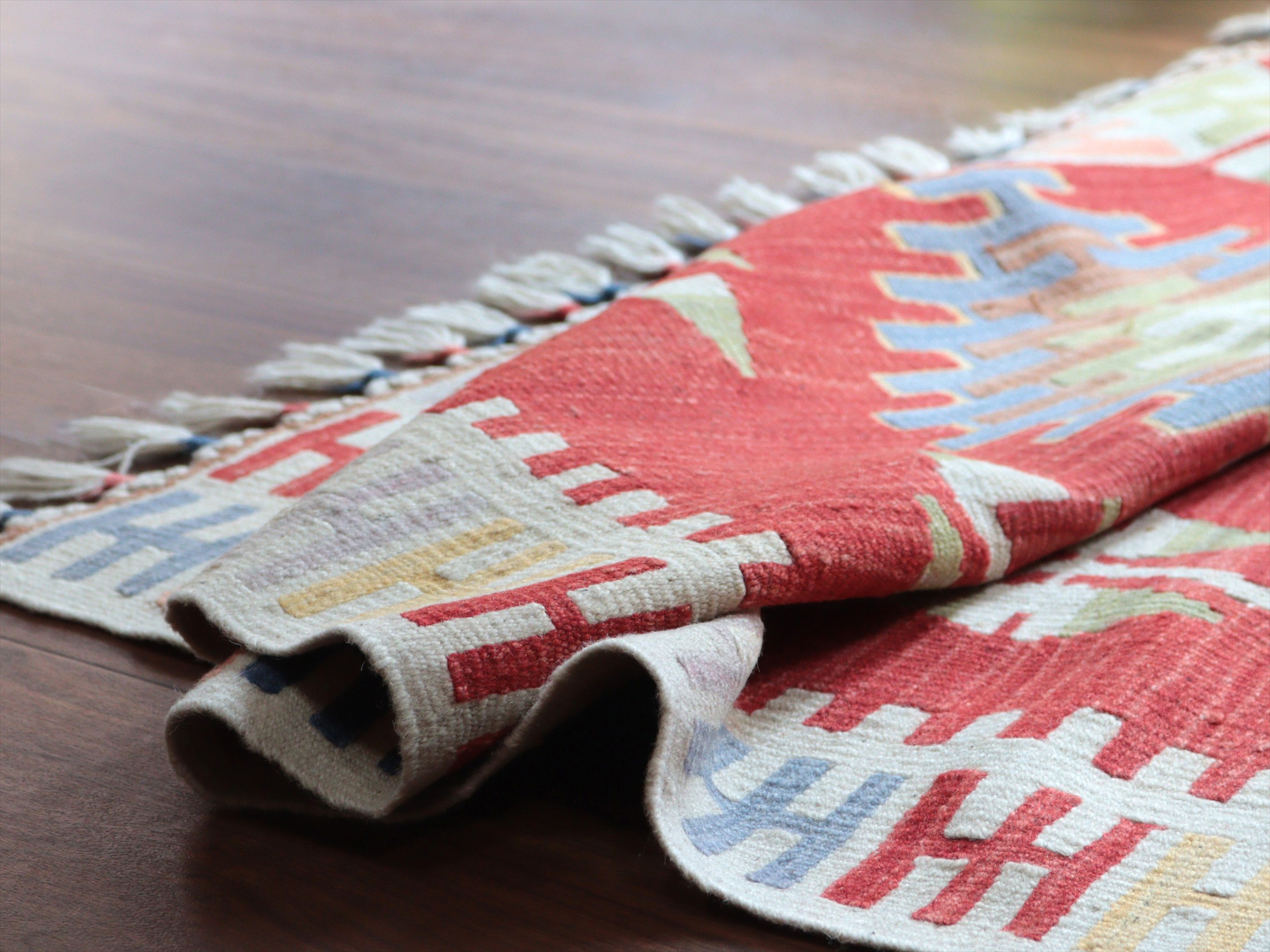織り地がしなやかでやわらかいのがカイセリキリムの特徴です。やや厚みがあり、やさしい肌触り。色の切り替え部分には、キリムの織りの特徴で、縦に隙間が開いています(スリットと呼んでいます)。