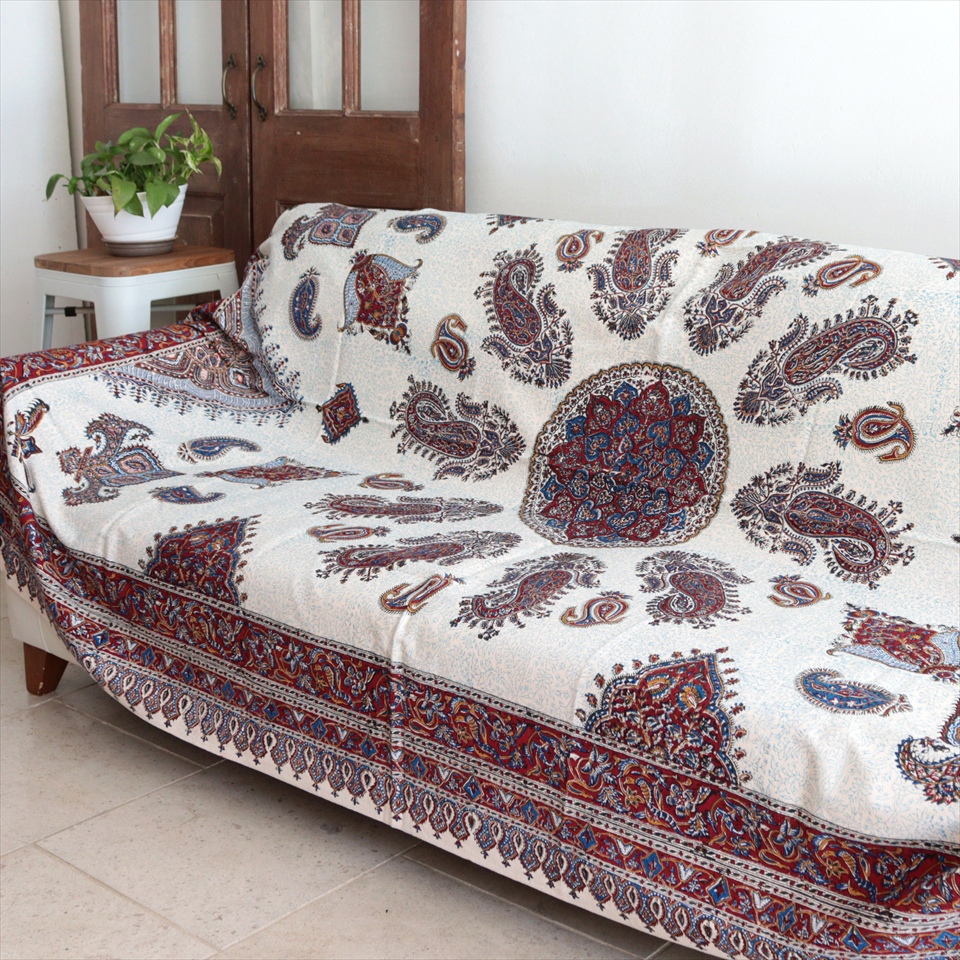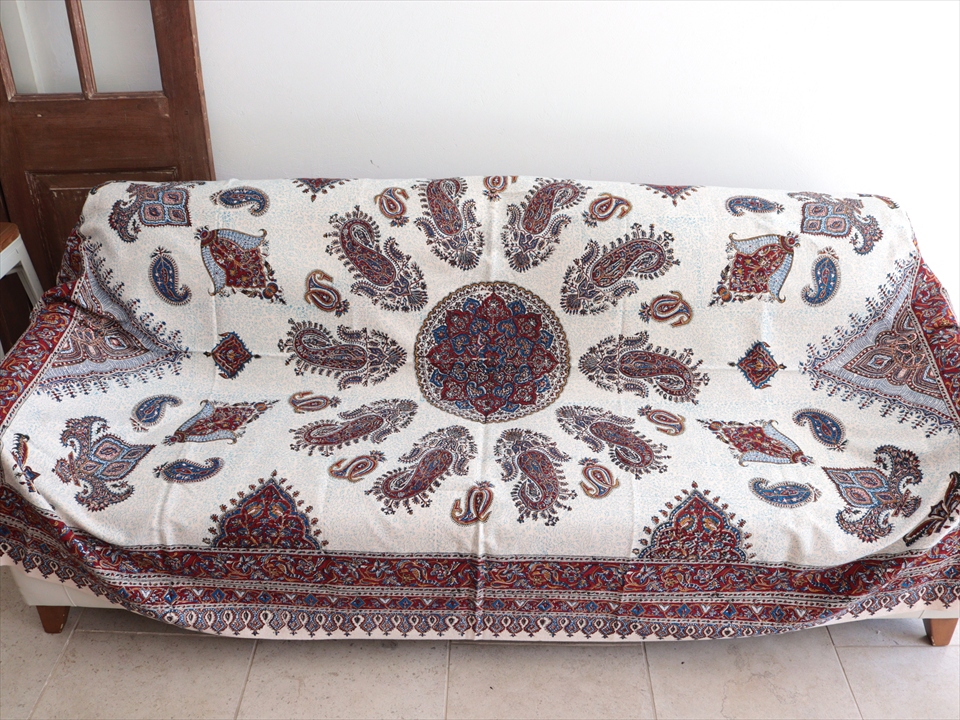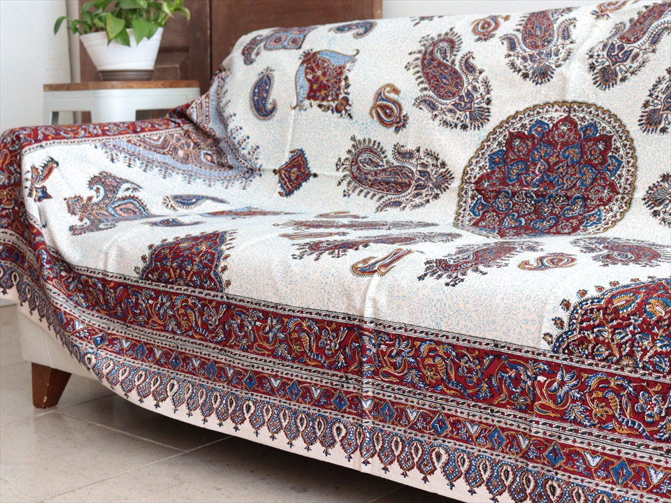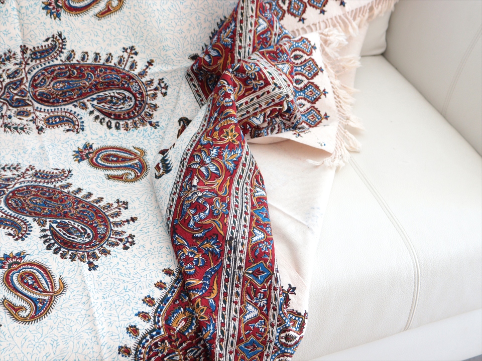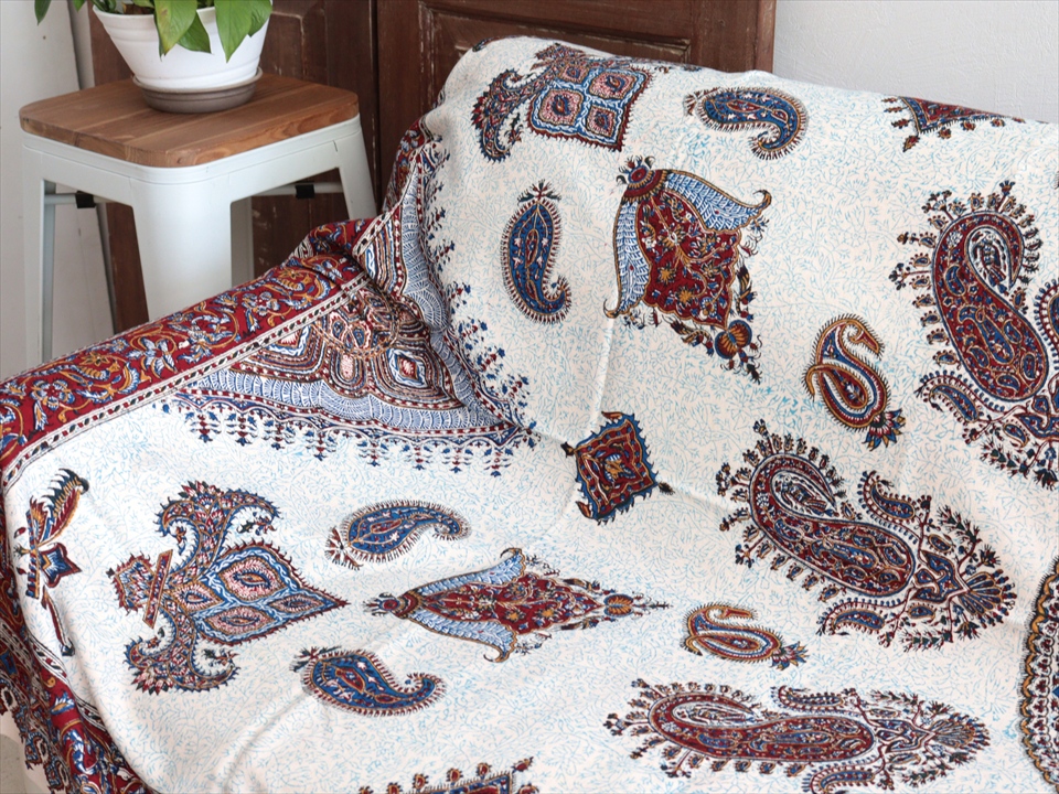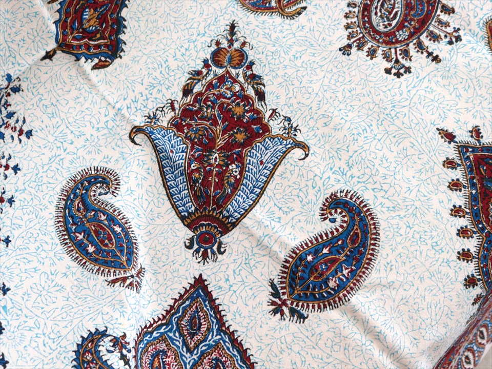 Key:コットン 染色 ブロックプリント 木版 捺染 伝統工芸 ペルシャブルー ペイズリー フリークロス マルチカバー ベッドスプレッド ベッドカバー ソファカバー カーテン タペストリー ファブリック インテリアファブリック クラフト インテリア ペルシャ ペルセポリス イラン 中東 シルクロード アジアン エスニック