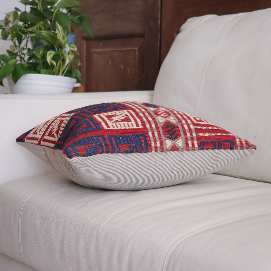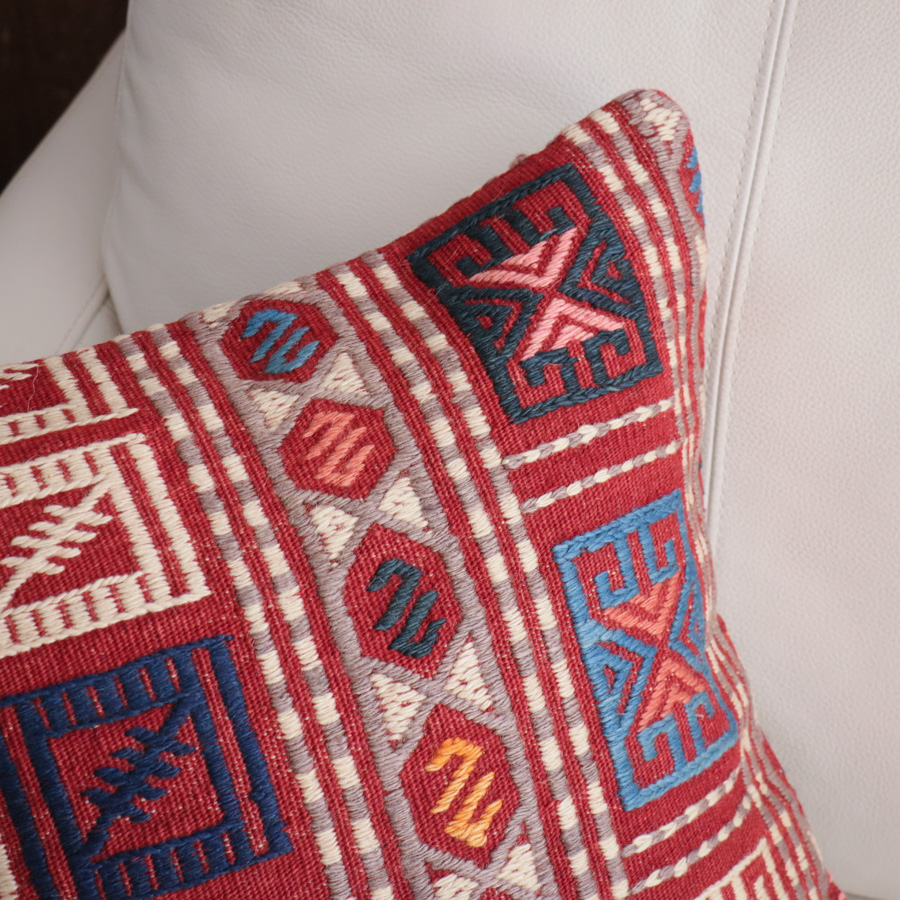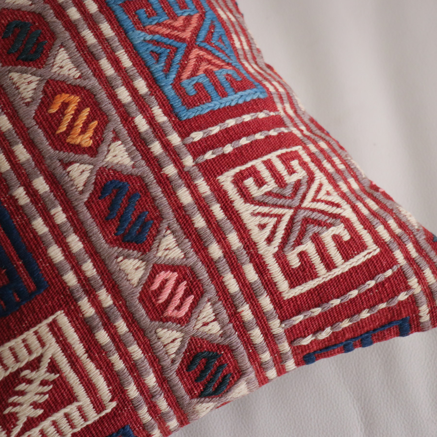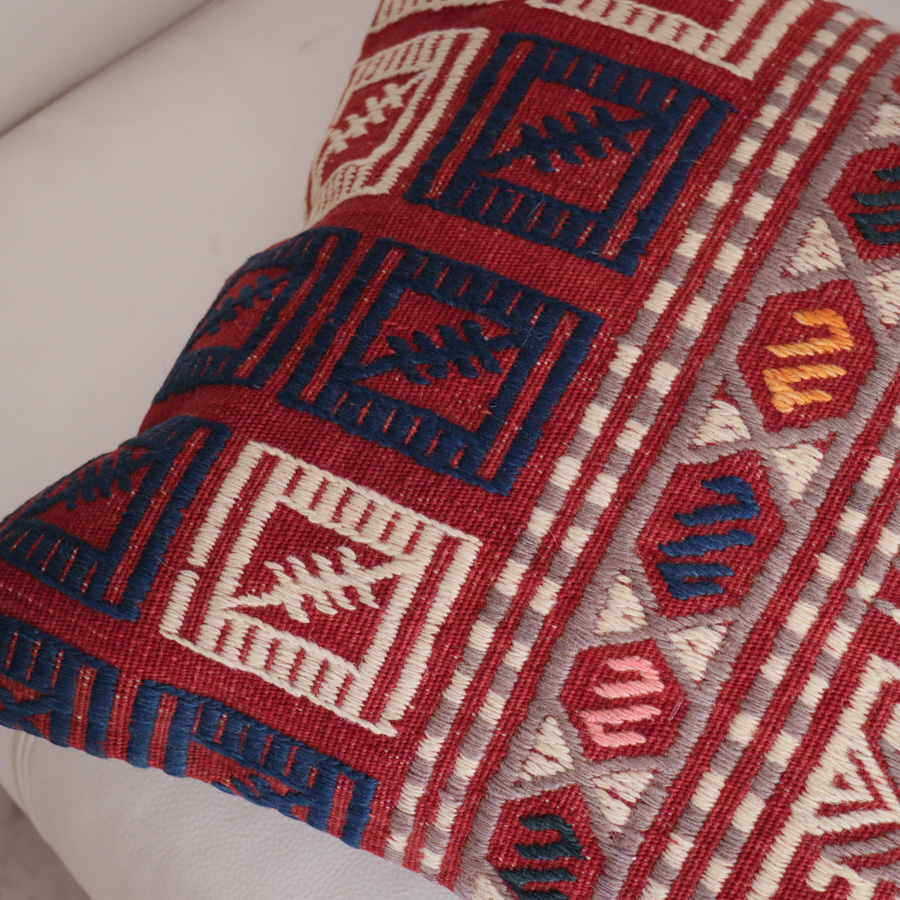 トルコ西部、エーゲ海に近いバルケスィールのオールドキリムから。明るい赤をベースに、アイボリー、紺でモチーフが織り込まれています。ジジムは平織りのキリムにもう一本飾り糸を一緒に織り込んでいく織り方で、表面は立体感のあるテクスチャです。