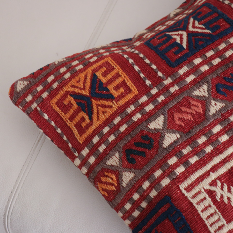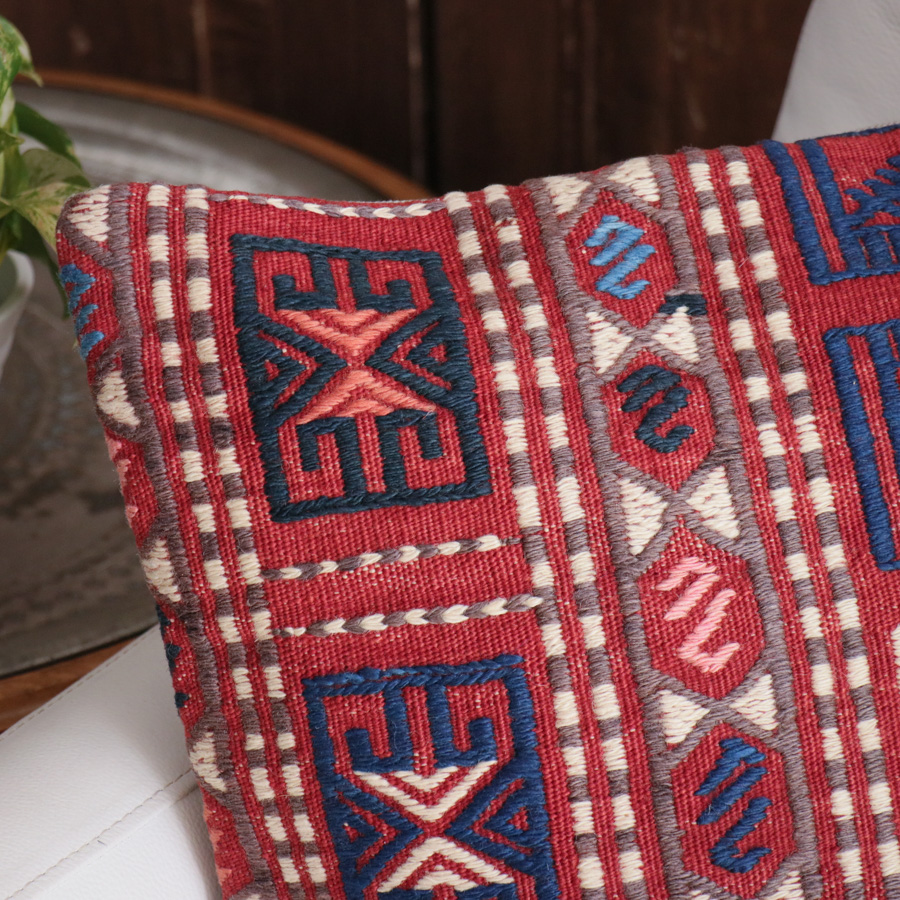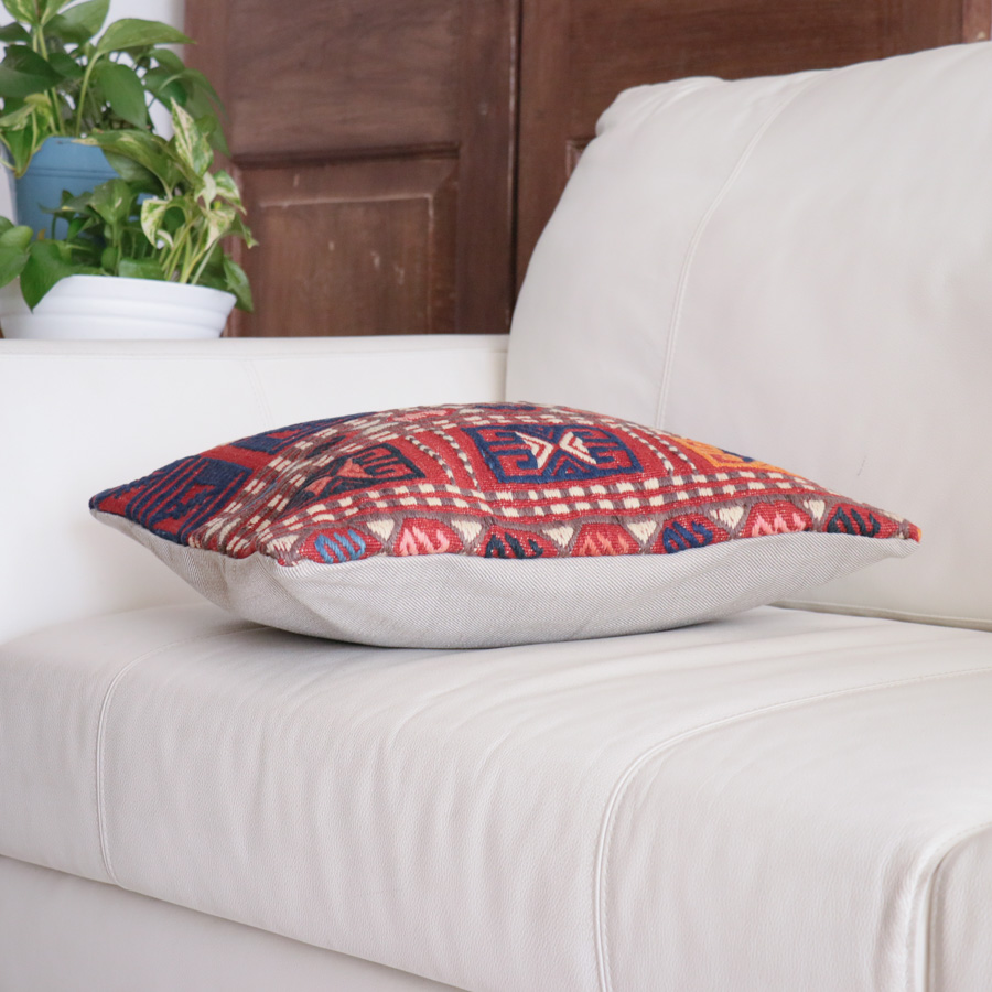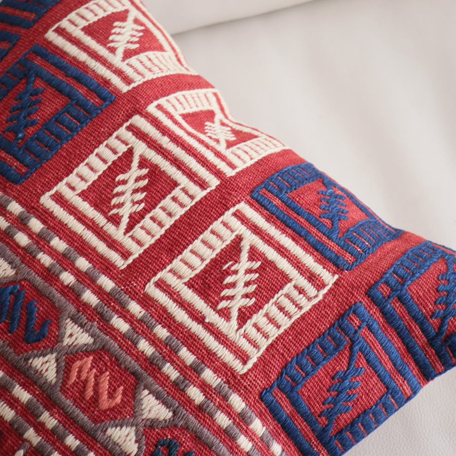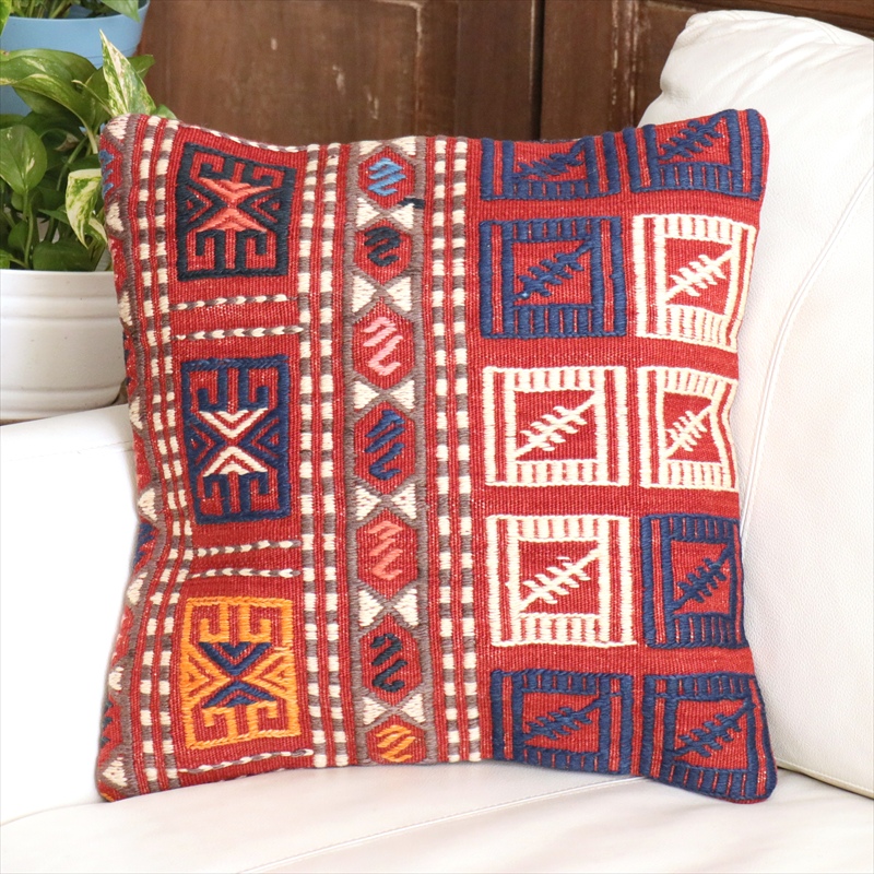 トルコ西部、エーゲ海に近いバルケスィールのオールドキリムから。明るい赤をベースに、アイボリー、紺でモチーフが織り込まれています。ジジムは平織りのキリムにもう一本飾り糸を一緒に織り込んでいく織り方で、表面は立体感のあるテクスチャです。