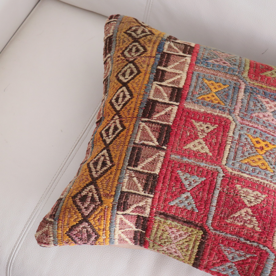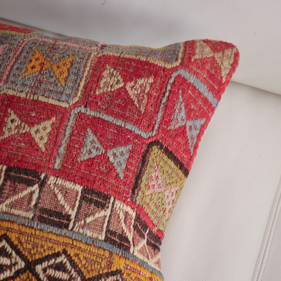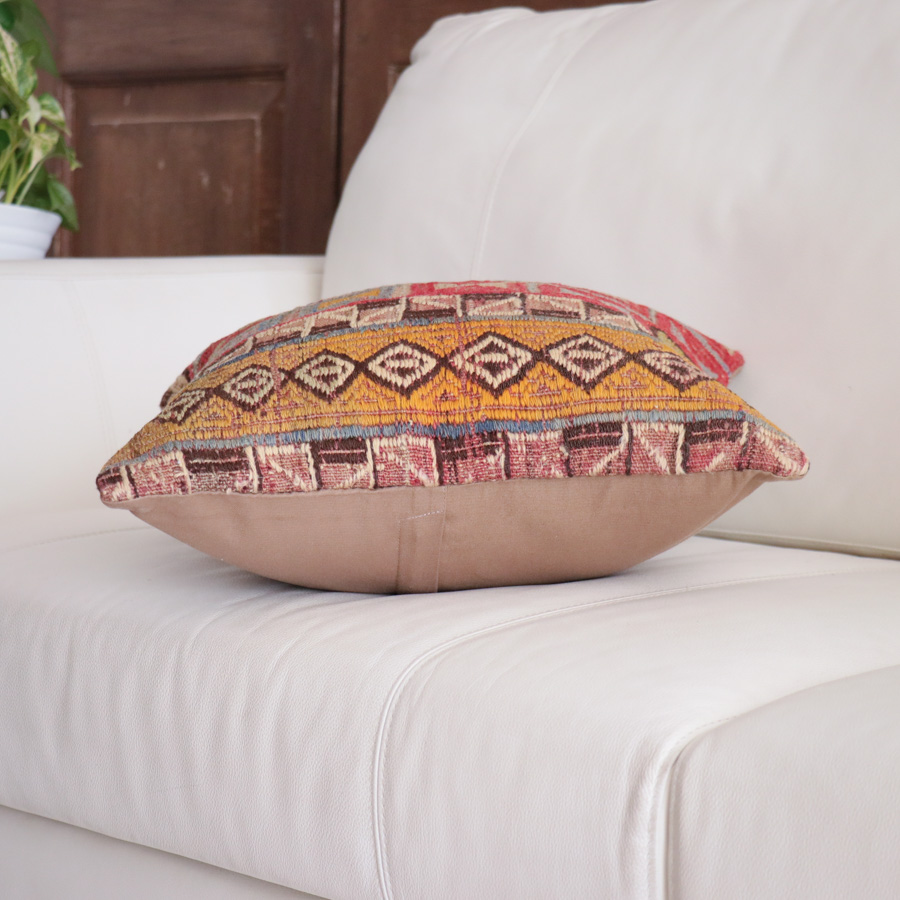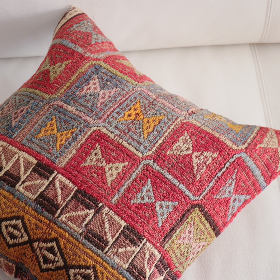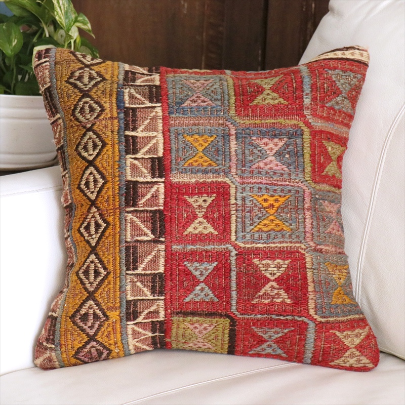 アナトリア半島西部に位置するアフィヨン地方のオールドキリムからのカット。刺繍のように見えるモチーフは、後から刺したものではなく、織りの途中で毛糸を絡めながらモチーフを織り込むジジム織りです。表面は立体感のあるテクスチャです。
