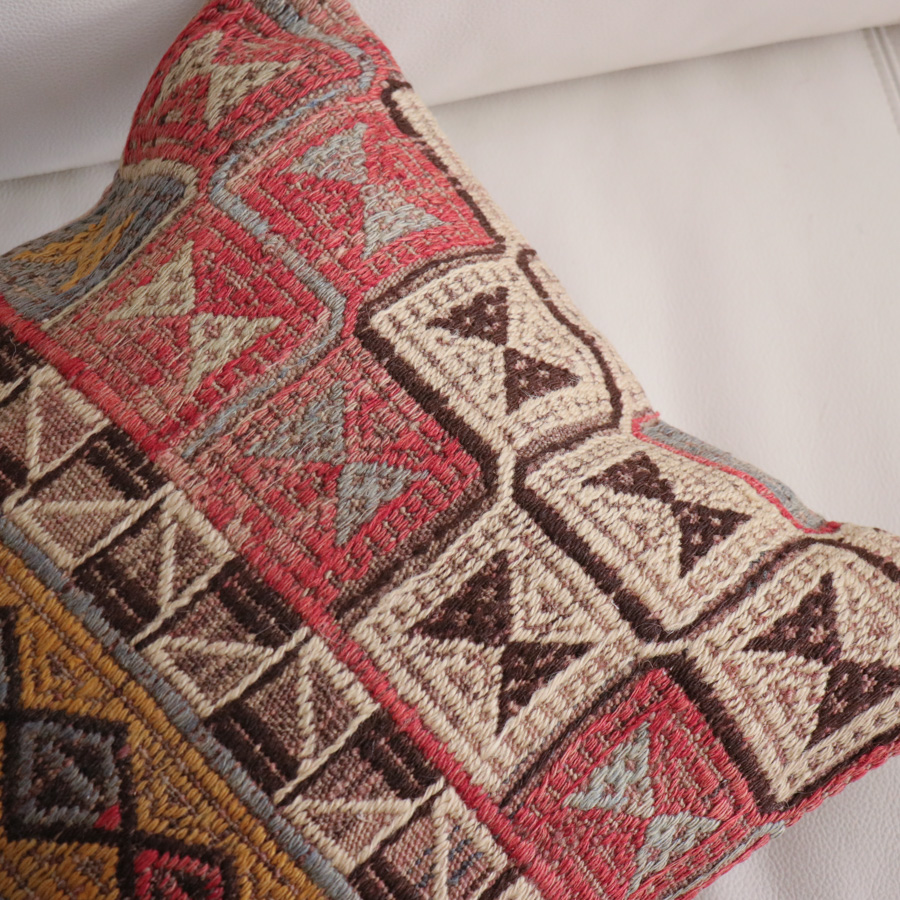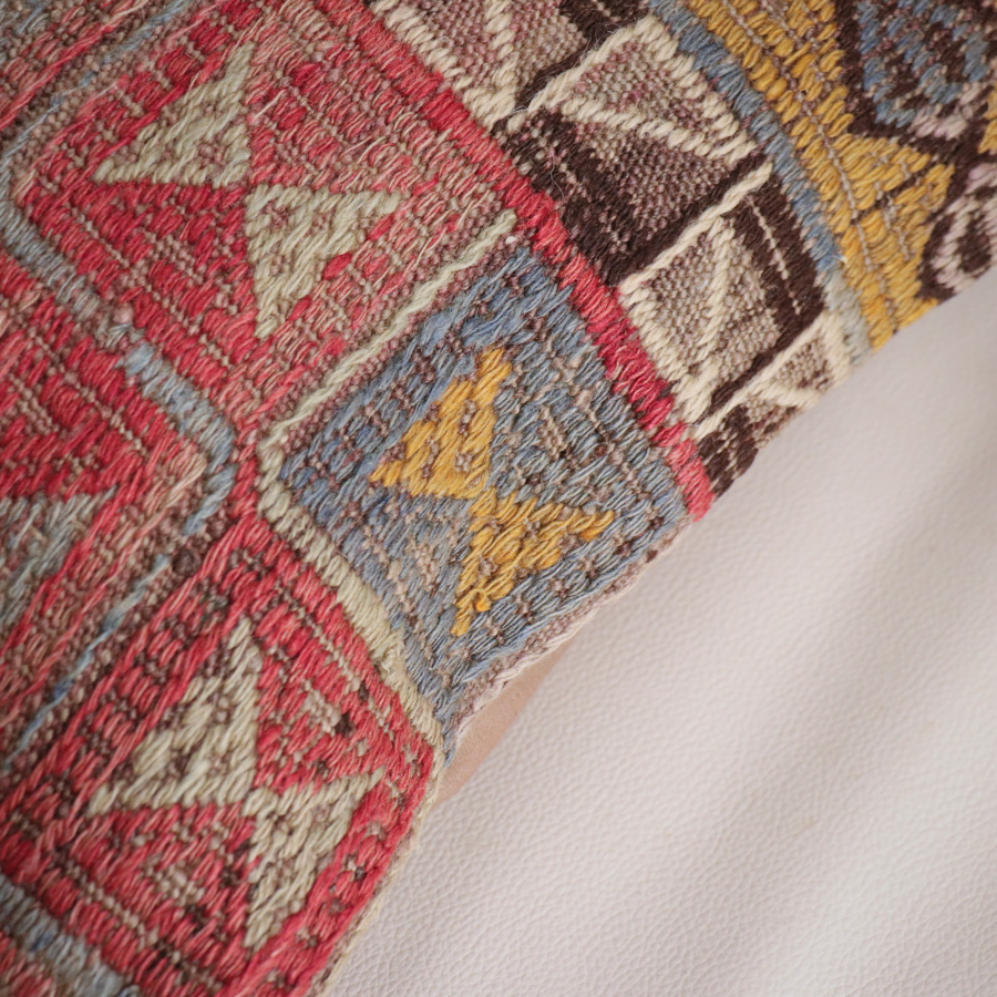 アナトリア半島西部に位置するアフィヨン地方のオールドキリムからのカット。刺繍のように見えるモチーフは、後から刺したものではなく、織りの途中で毛糸を絡めながらモチーフを織り込むジジム織りです。表面は立体感のあるテクスチャです。
