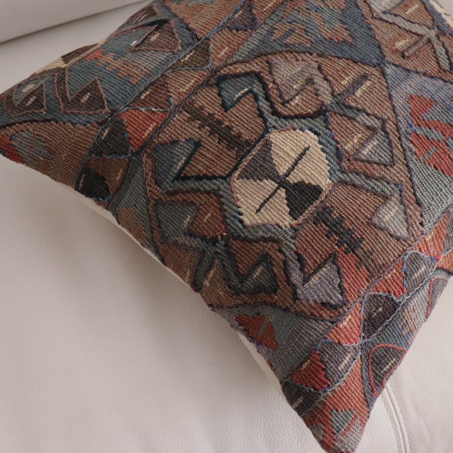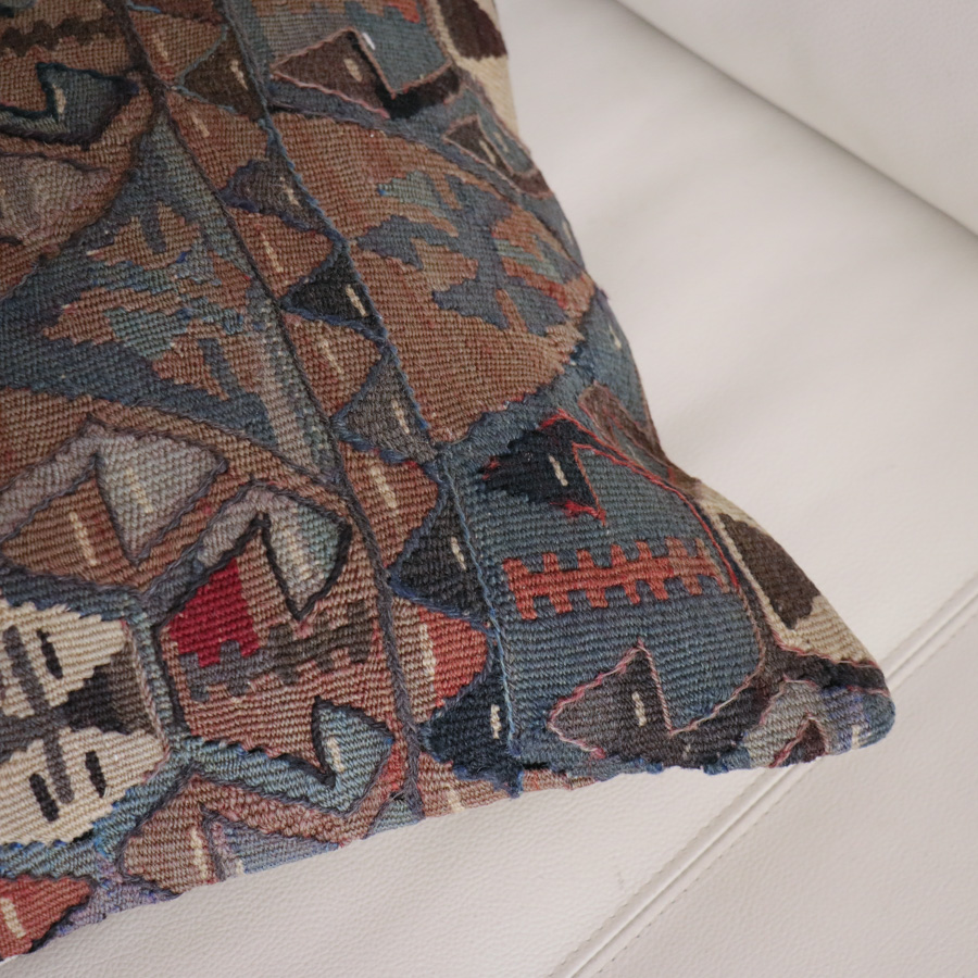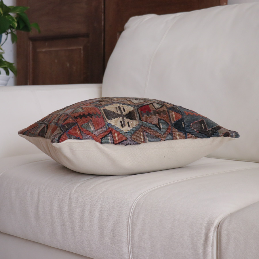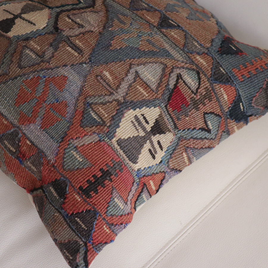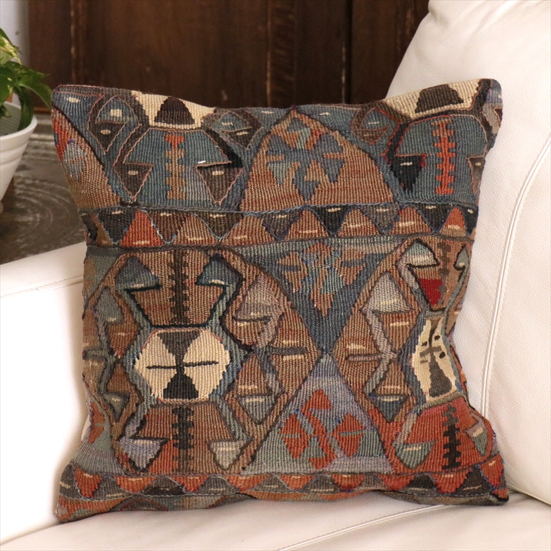 トルコ最南部、イラクとの国境に面するハッキャリ地方のオールドキリムからのカット。赤、紺、茶、などのシンプルな色使いで、力強い印象です。
