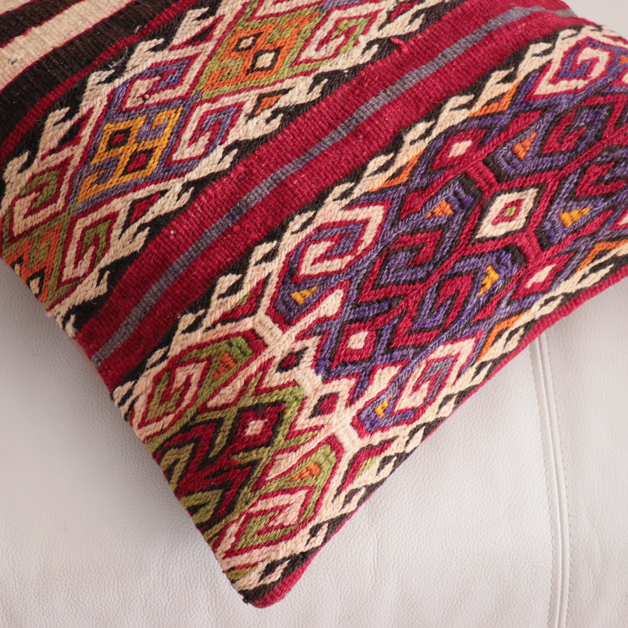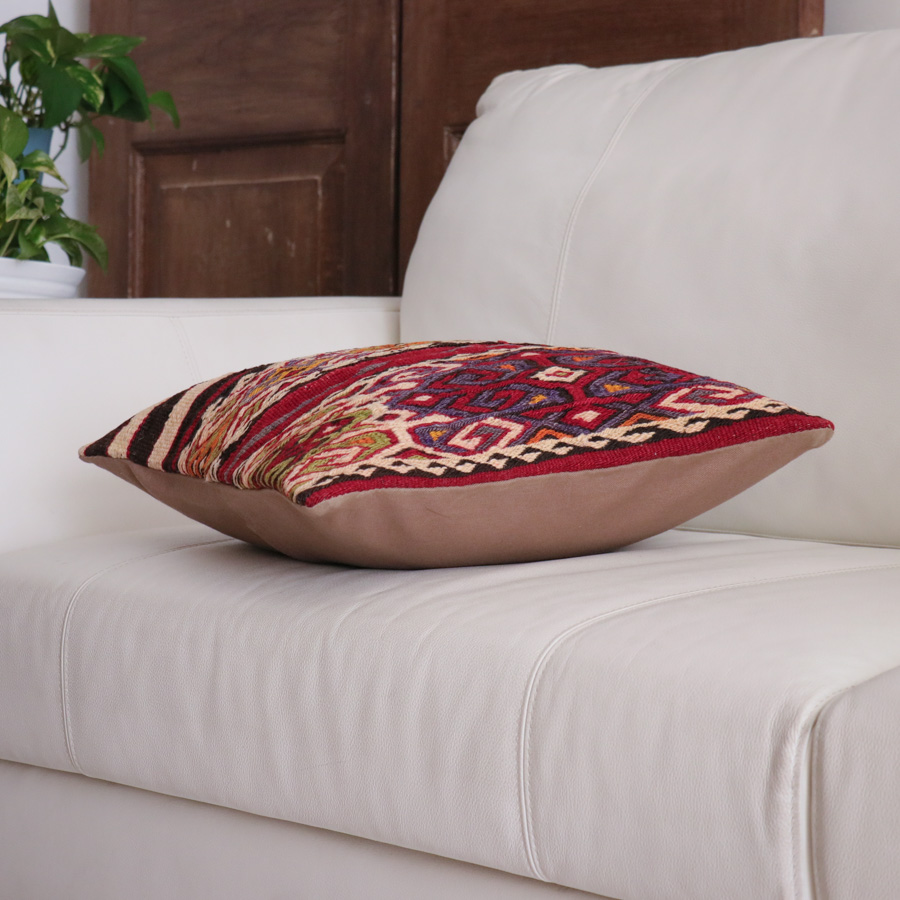 遊牧民たちがテントの中で、家財道具を入れるために使っていた収納袋(チュアル)からカットされたクッションです。幾何学モチーフの部分は、刺繍のようにみえるスマック織りで丁寧に織られ、しっかりとした厚みがあります。キリムは厚みがありがっちりした織り。