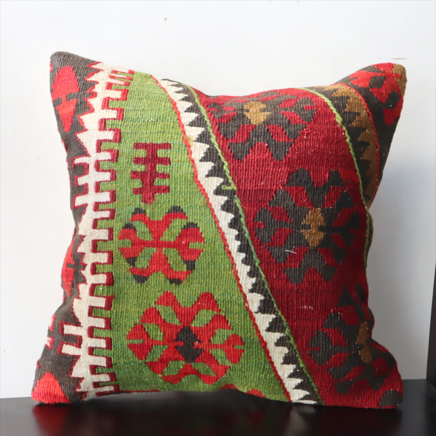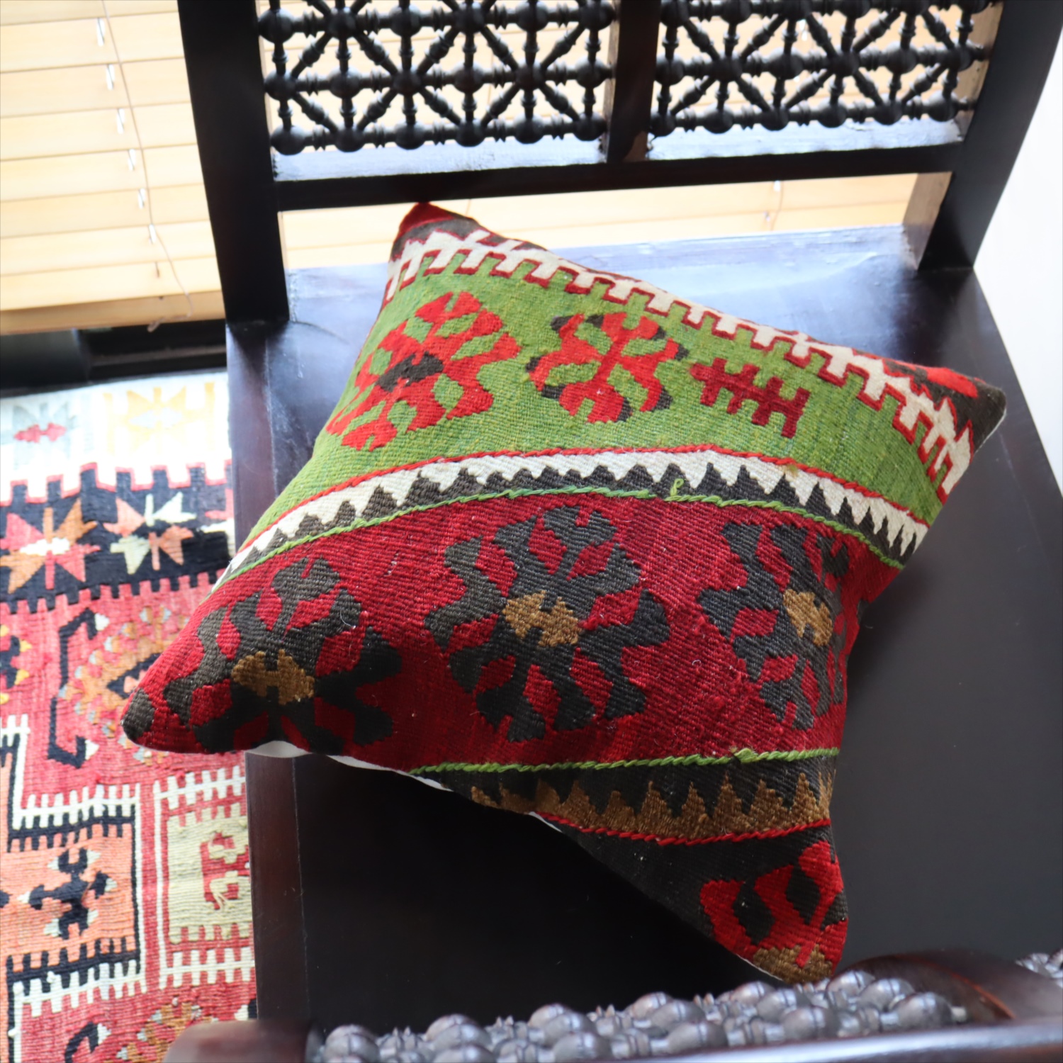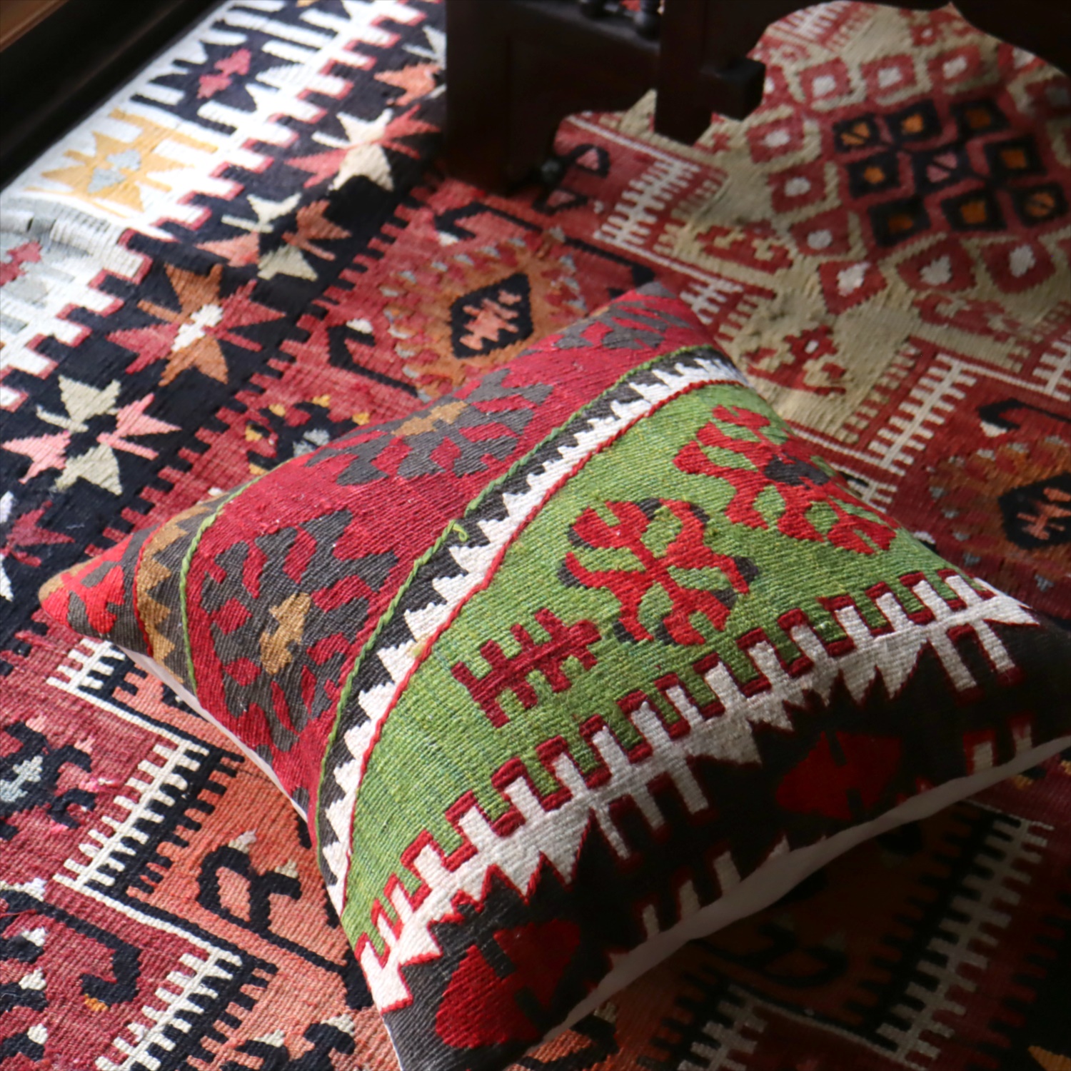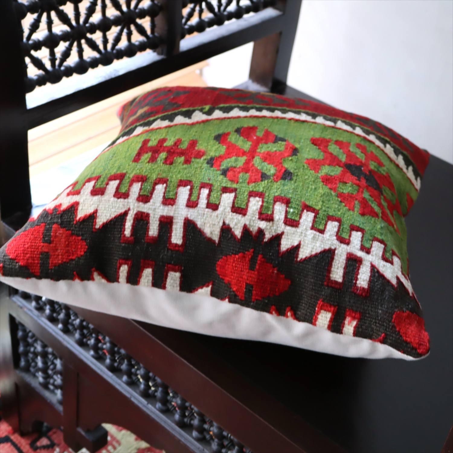 20世紀中頃に、アナトリア(トルコ)東部、マラテヤ地方またはシワス地方で織られたもので、年代は古いものの、大切に保管されており、織られた当時のままの鮮やかな色が残っています。グリーンの色はお部屋でクッションとしてお使いいただく間に、少しずつ褪色してやわらかな色に変化すると想像できます。