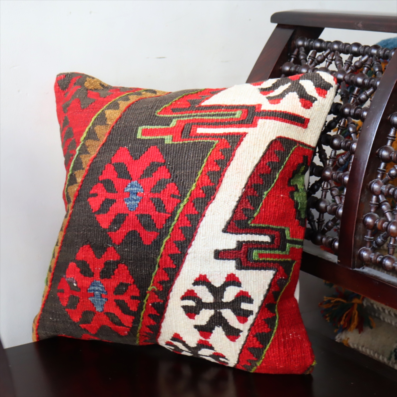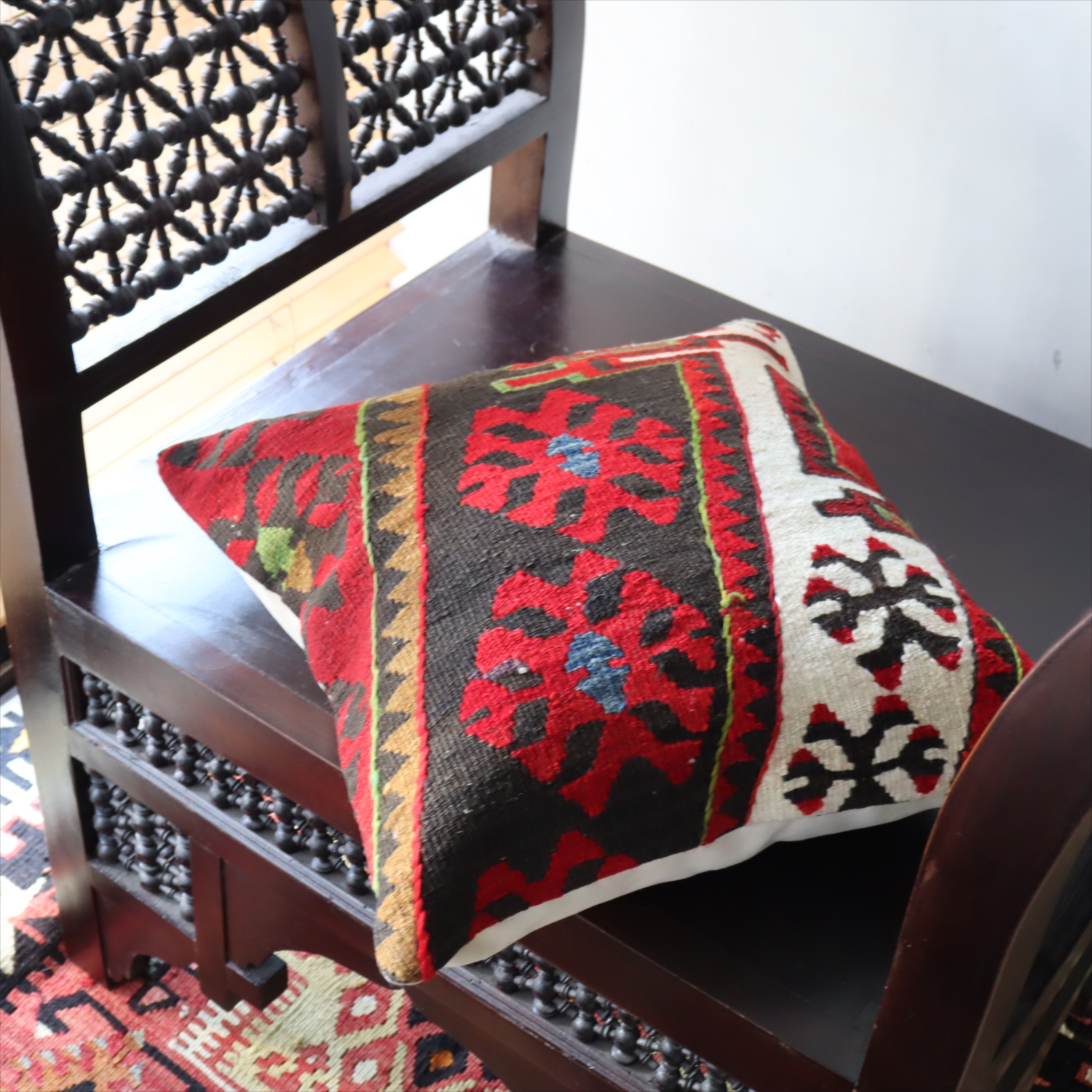20世紀中頃に、アナトリア(トルコ)東部、マラテヤ地方またはシワス地方で織られたもので、年代は古いものの、大切に保管されており、織られた当時のままの鮮やかな色が残っています。お部屋でクッションとしてお使いいただく間に、少しずつ褪色してやわらかな色に変化すると想像できます。