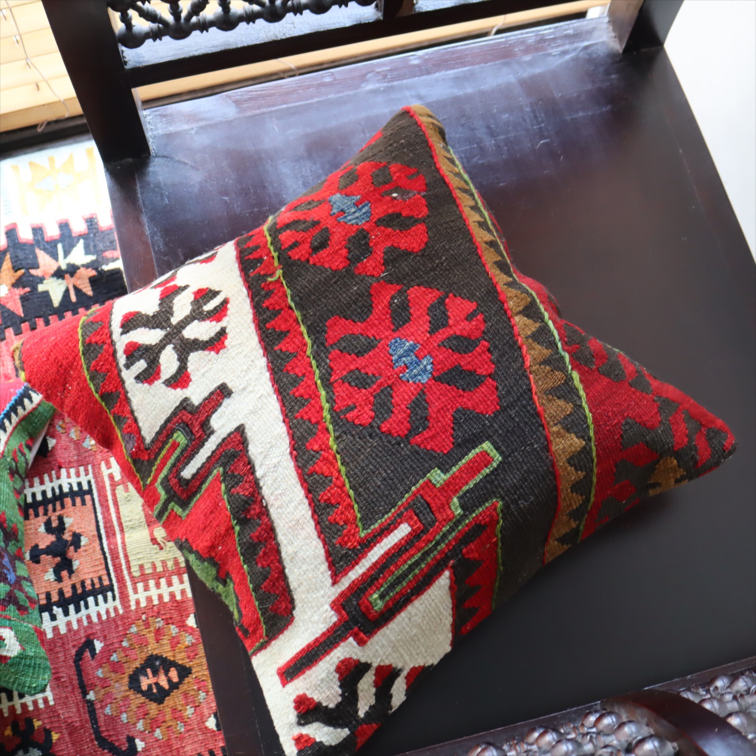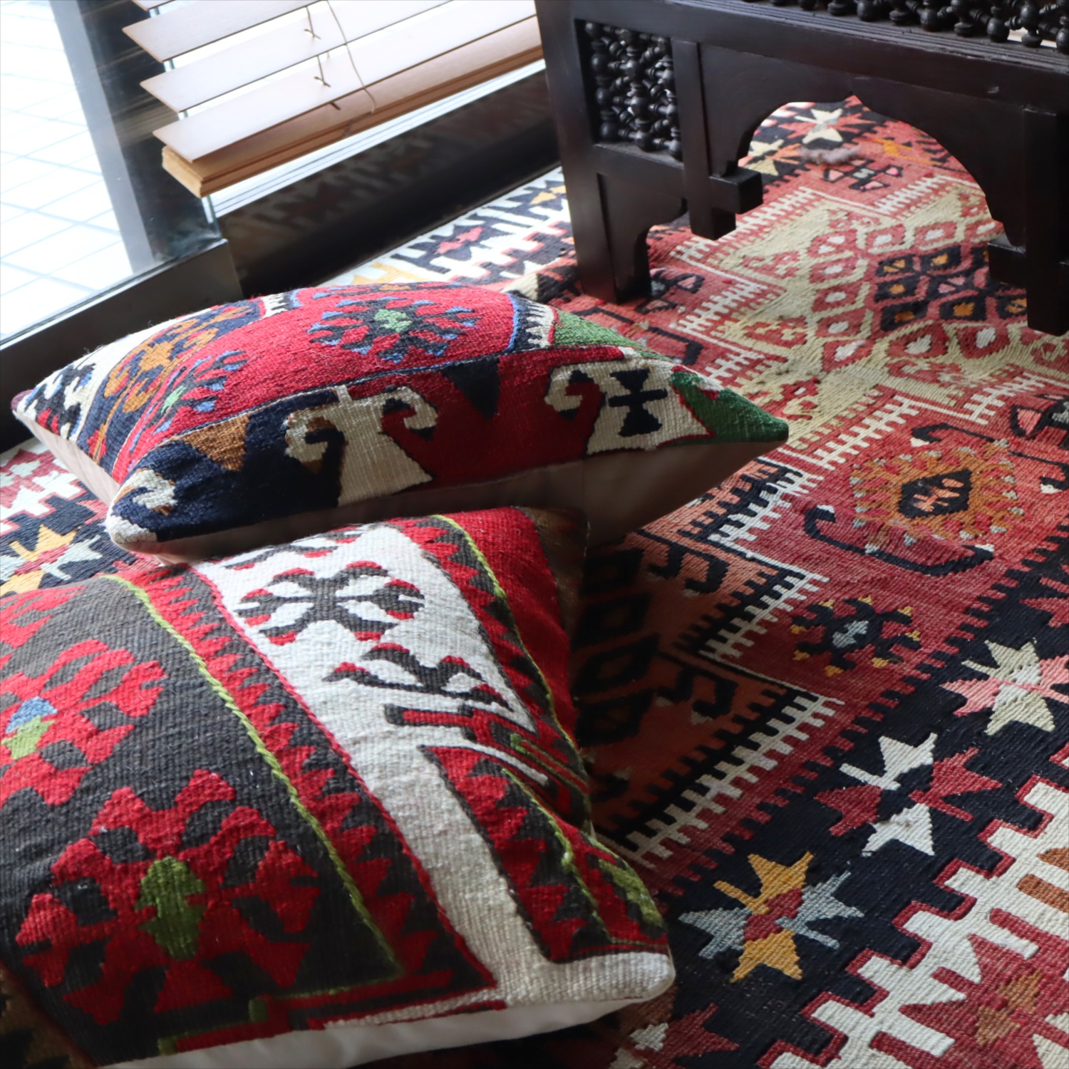 クッションカバーにすると、一枚のキリムから50枚以上に切り分けられるものもあり、配色が似ていてモチーフのバランスが違うクッションができあがります。