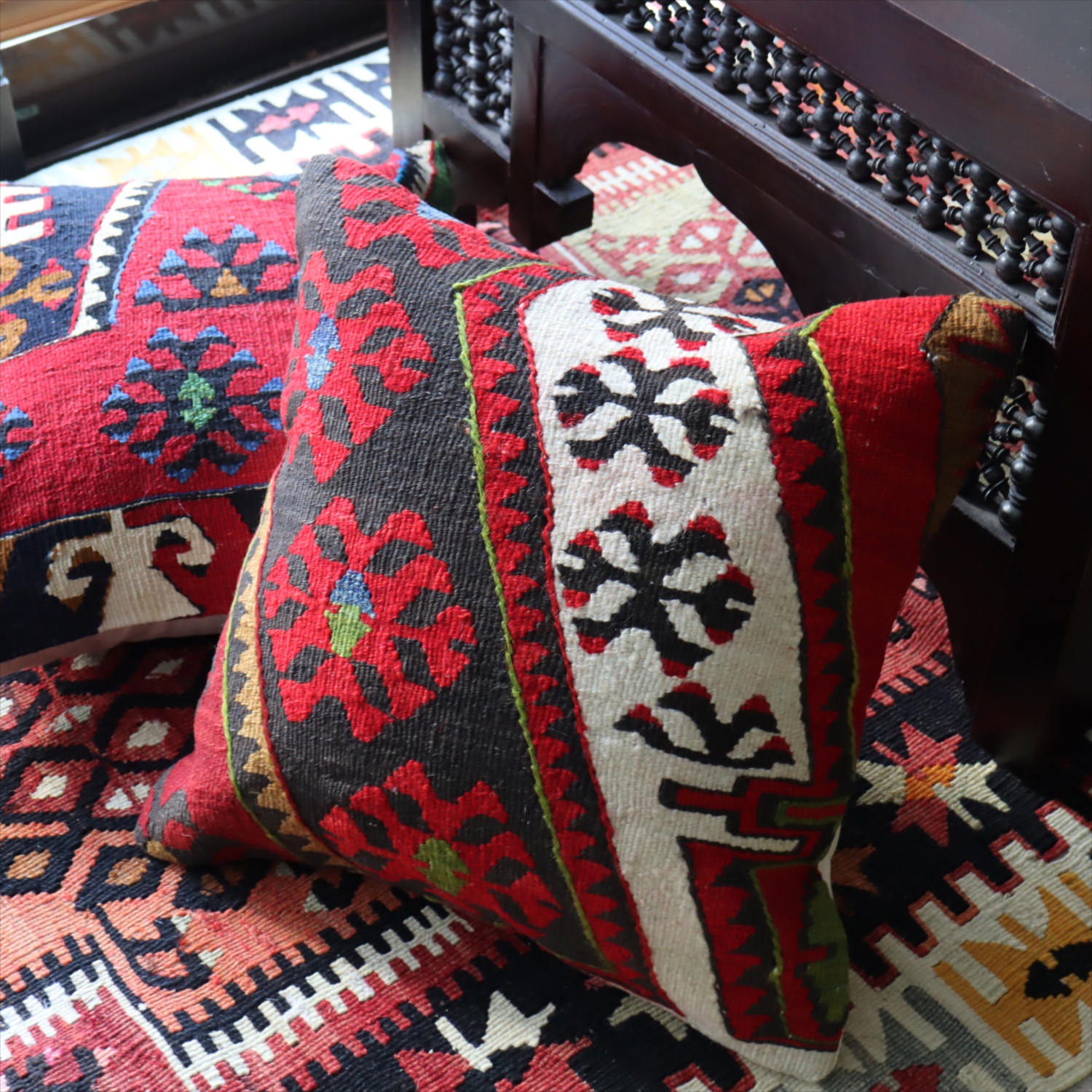 クッションカバーにすると、一枚のキリムから50枚以上に切り分けられるものもあり、配色が似ていてモチーフのバランスが違うクッションができあがります。