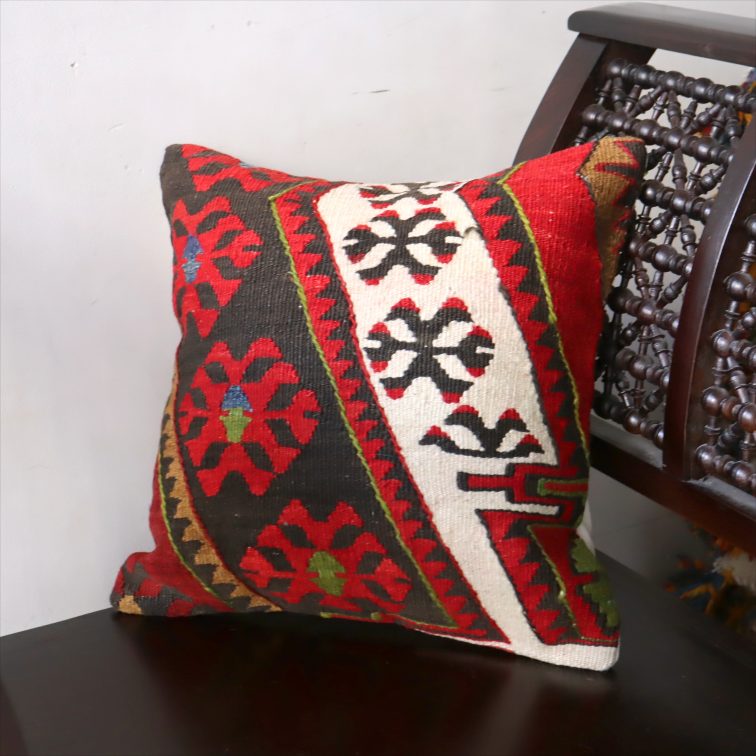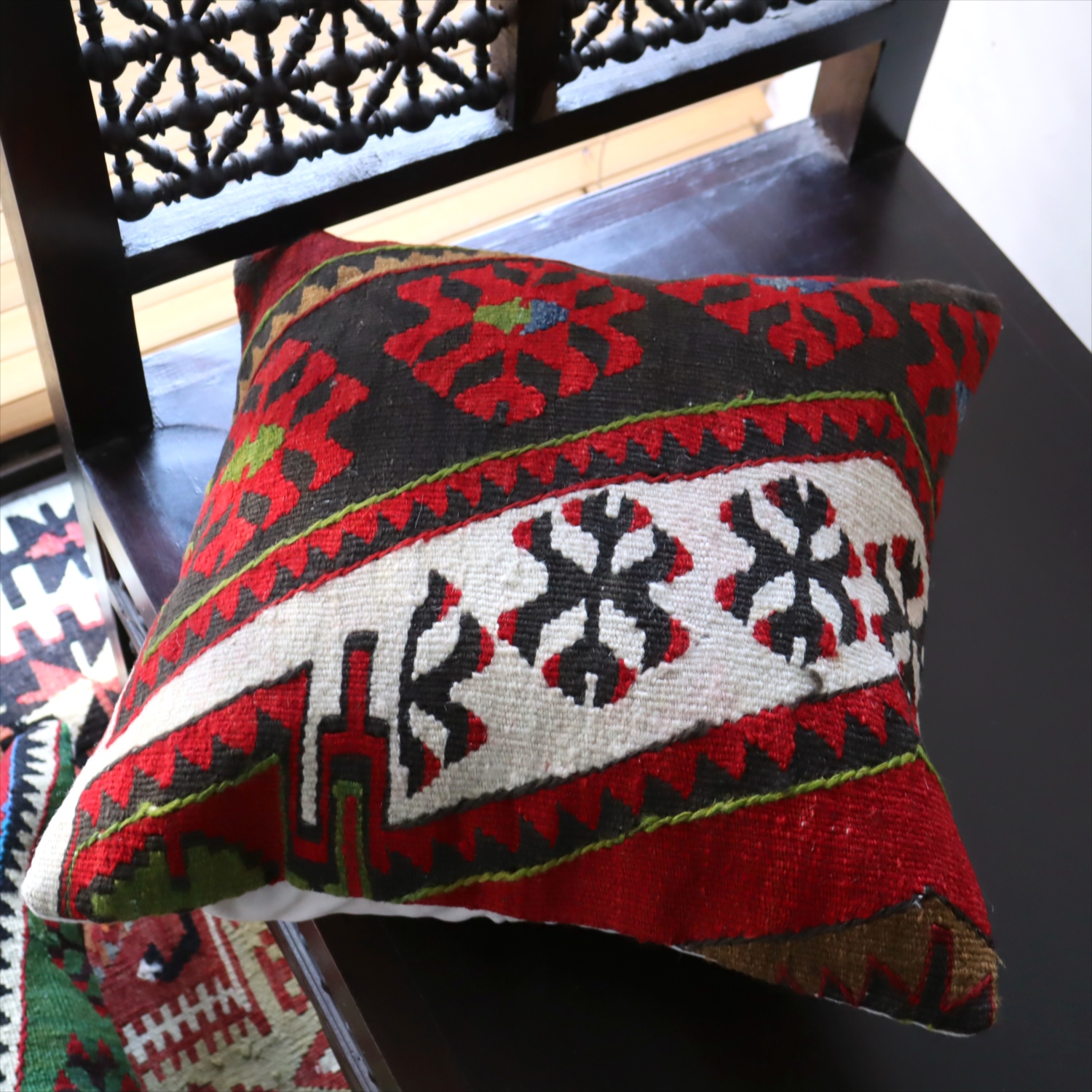 20世紀中頃に、アナトリア(トルコ)東部、マラテヤ地方またはシワス地方で織られたもので、年代は古いものの、大切に保管されており、織られた当時のままの鮮やかな色が残っています。お部屋でクッションとしてお使いいただく間に、少しずつ褪色してやわらかな色に変化すると想像できます。