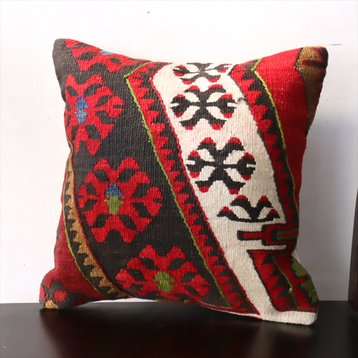 細い糸を使って織られた大型の平織りキリムをカットして作ったクッションカバーです。表面はウールのヴィンテージキリム、裏面は無地のコットン地です。