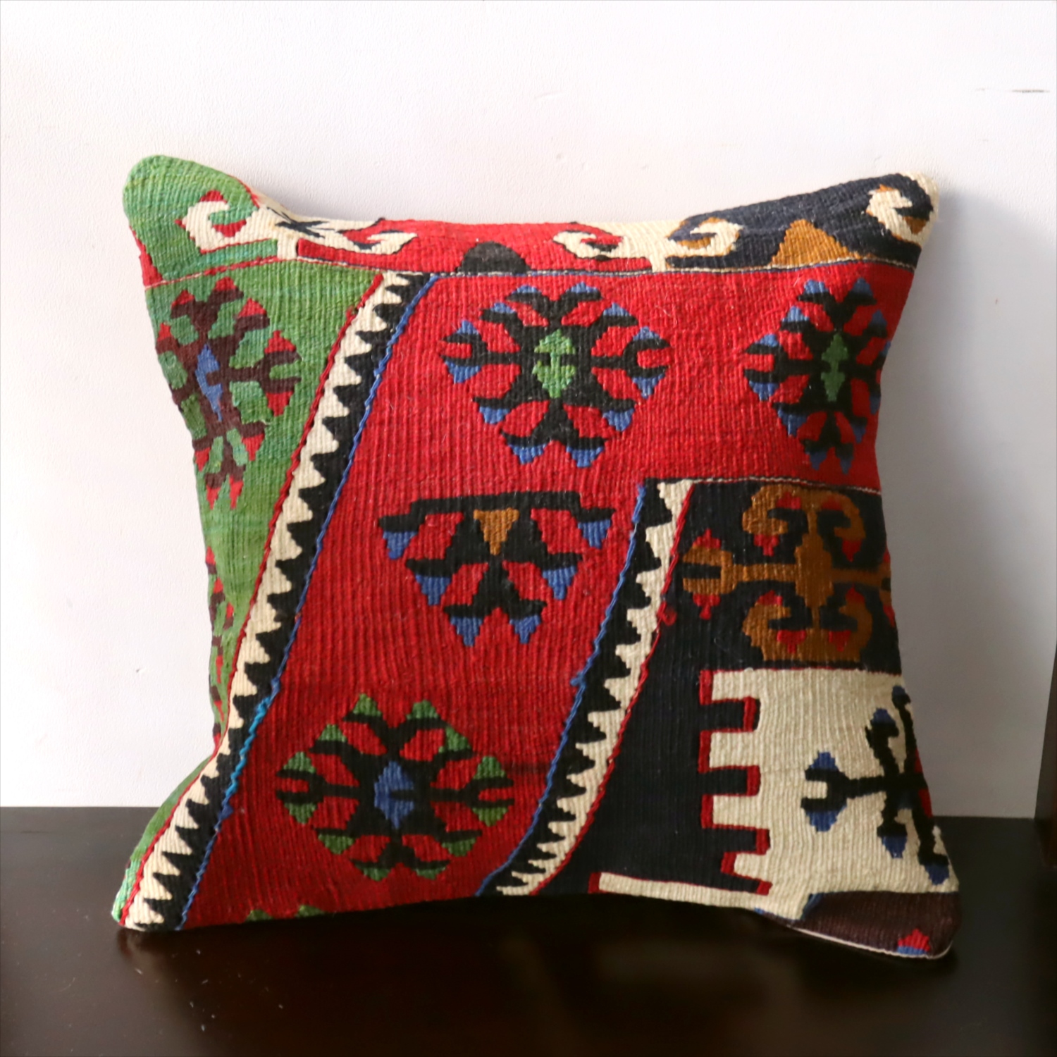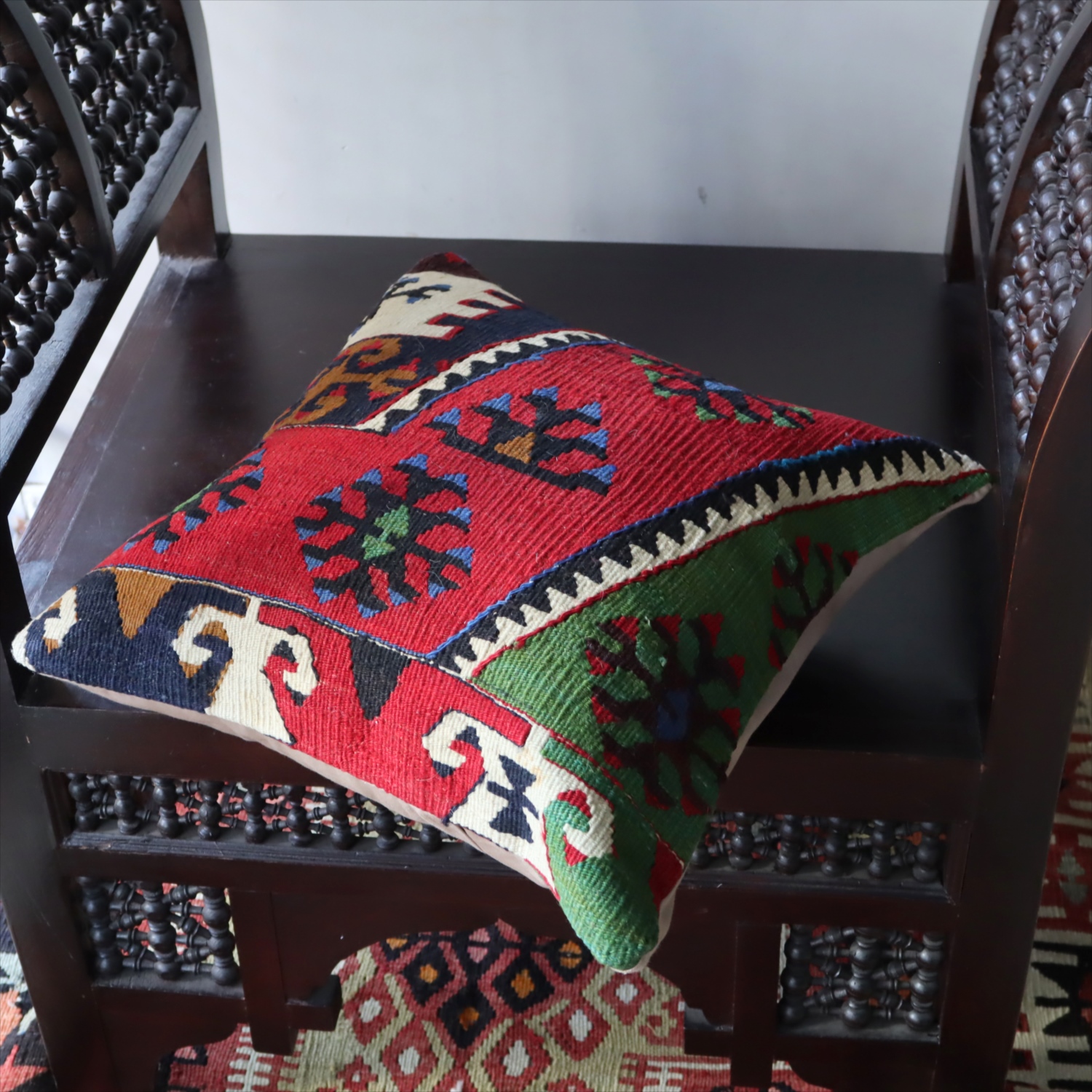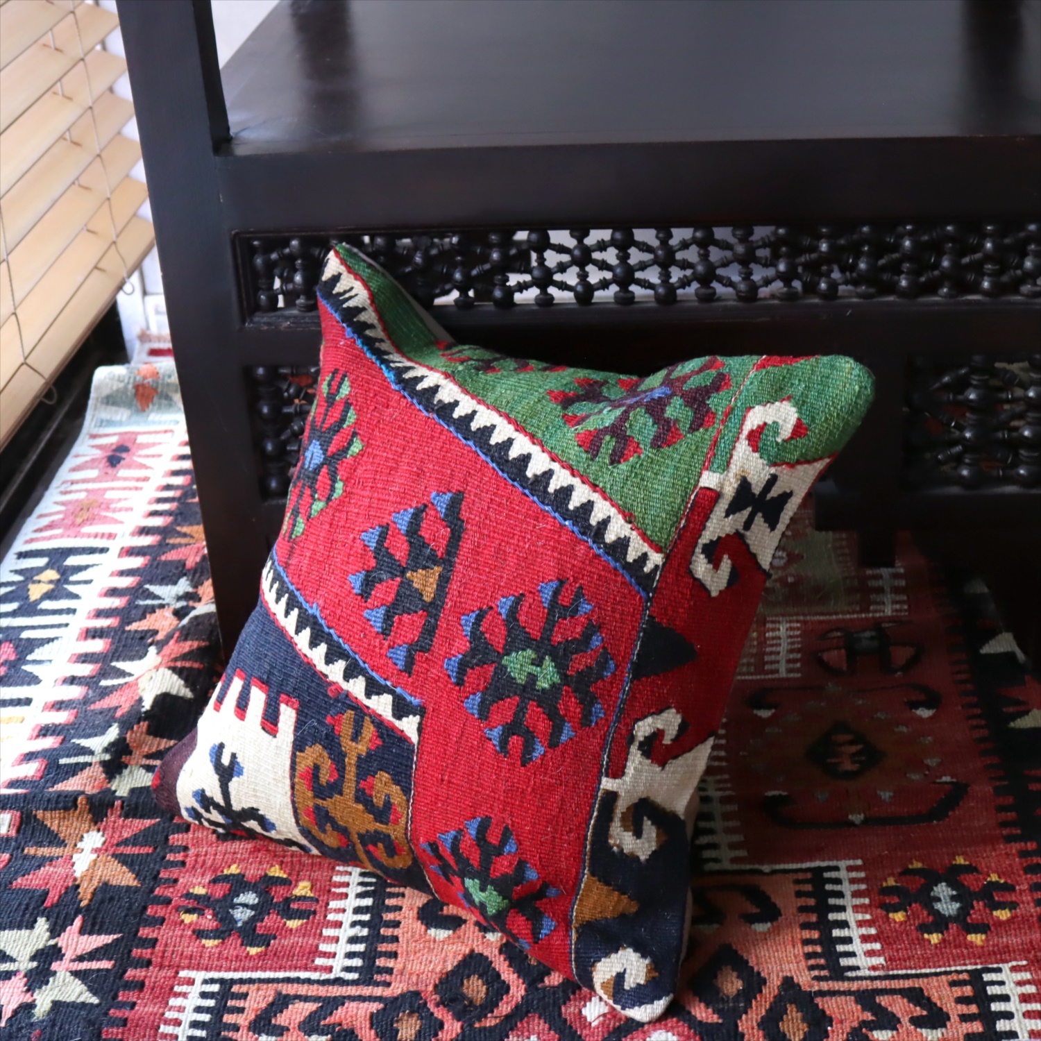 20世紀中頃に、アナトリア(トルコ)東部、マラテヤ地方またはシワス地方で織られたもので、年代は古いものの、大切に保管されており、織られた当時のままの鮮やかな色が残っています。グリーンやブルーはお部屋でクッションとしてお使いいただく間に、少しずつ褪色してやわらかな色に変化すると想像できます。