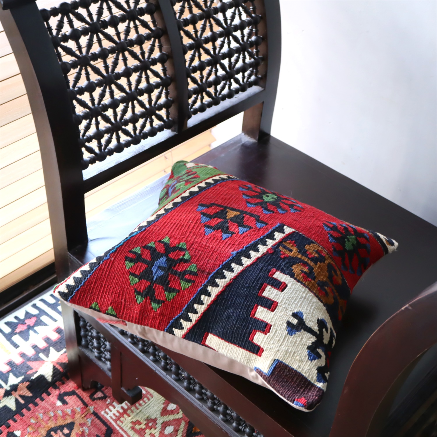 細い糸を使って織られた大型の平織りキリムをカットして作ったクッションカバーです。表面はウールのヴィンテージキリム、裏面は無地のコットン地です。
