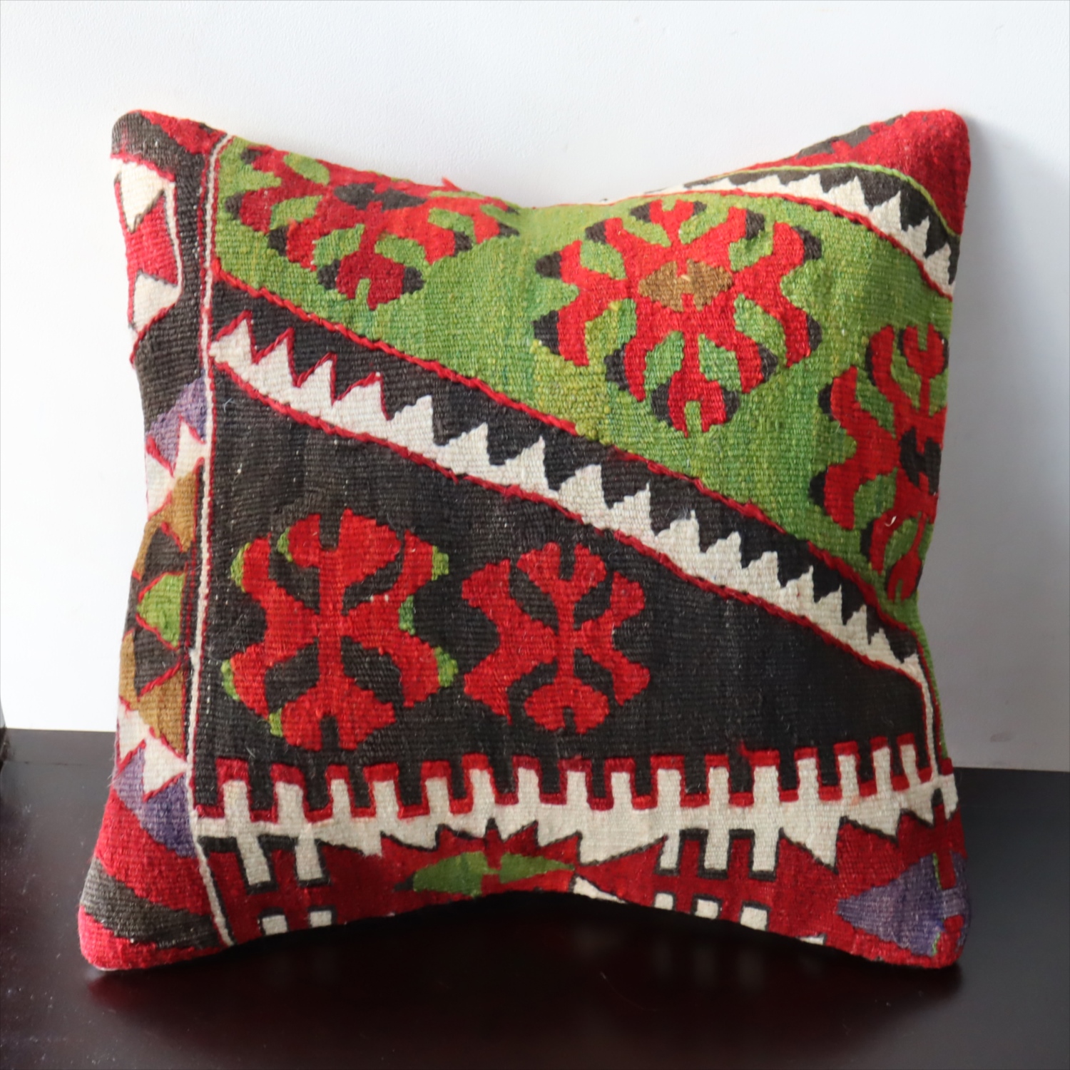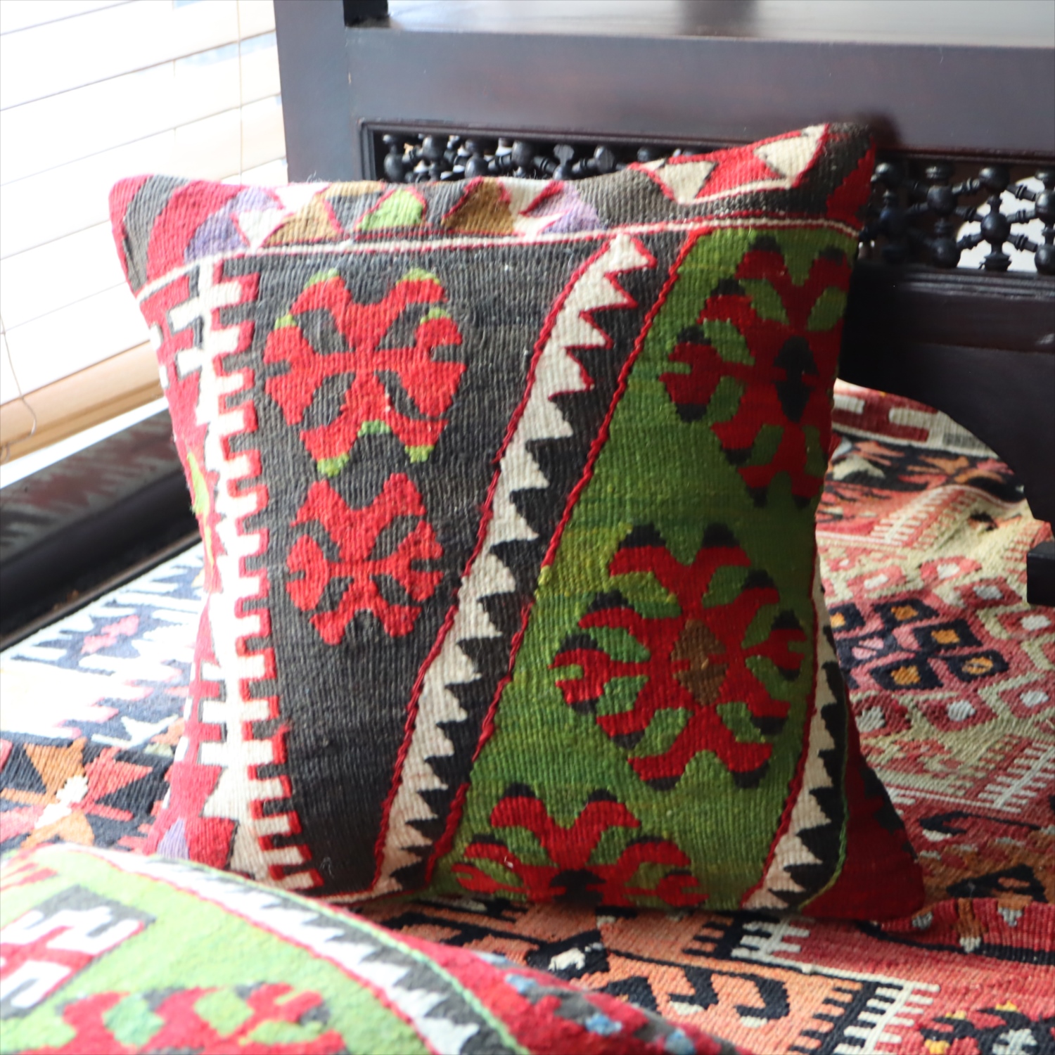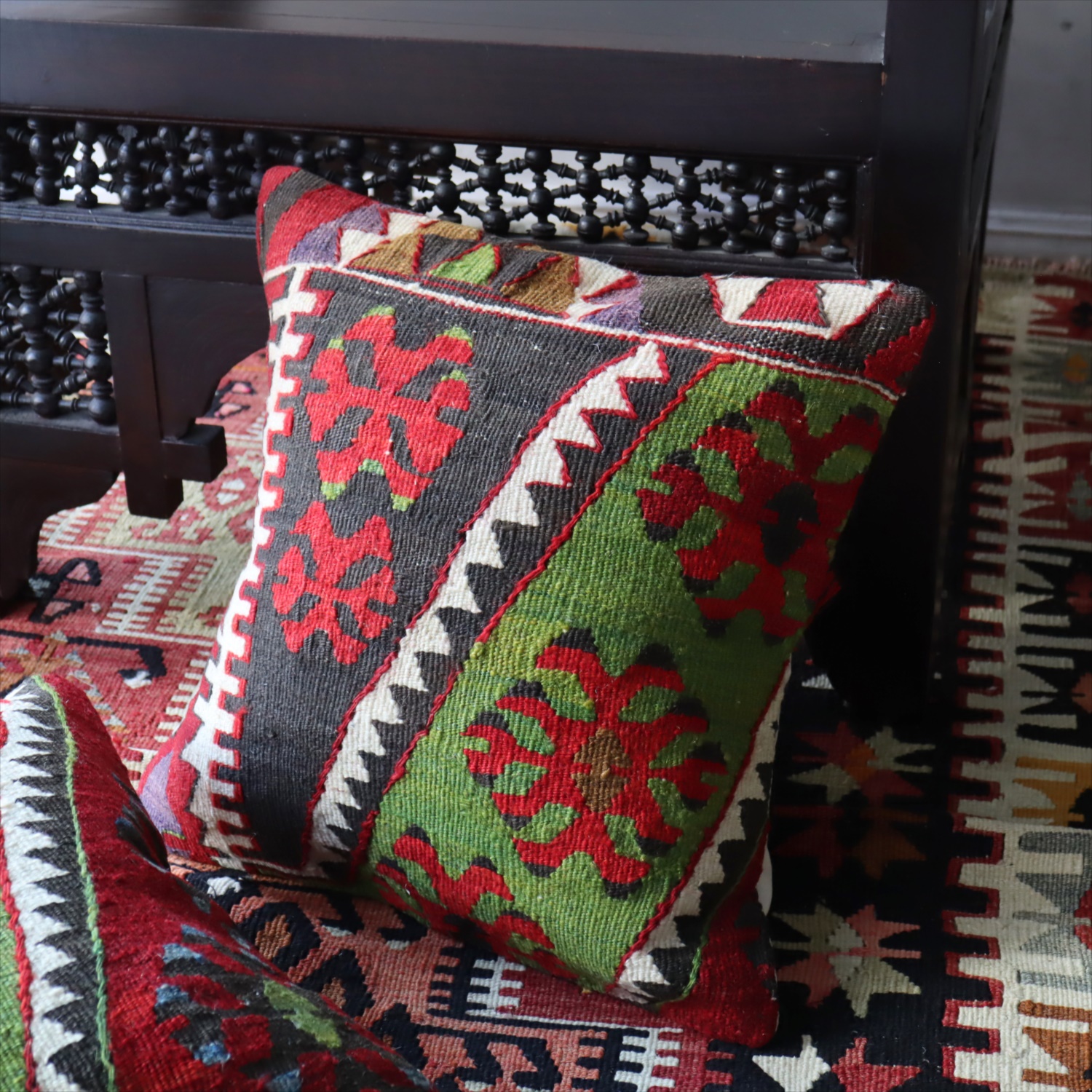 20世紀中頃に、アナトリア(トルコ)東部、マラテヤ地方またはシワス地方で織られたもので、年代は古いものの、大切に保管されており、織られた当時のままの鮮やかな色が残っています。グリーンの色はお部屋でクッションとしてお使いいただく間に、少しずつ褪色してやわらかな色に変化すると想像できます。