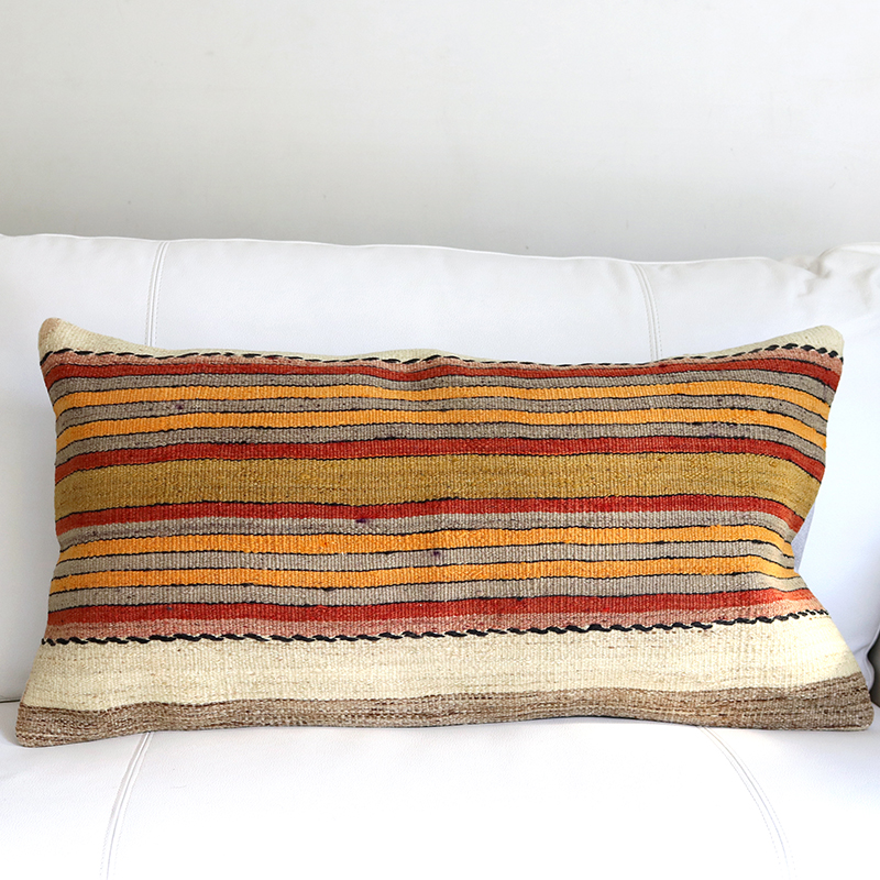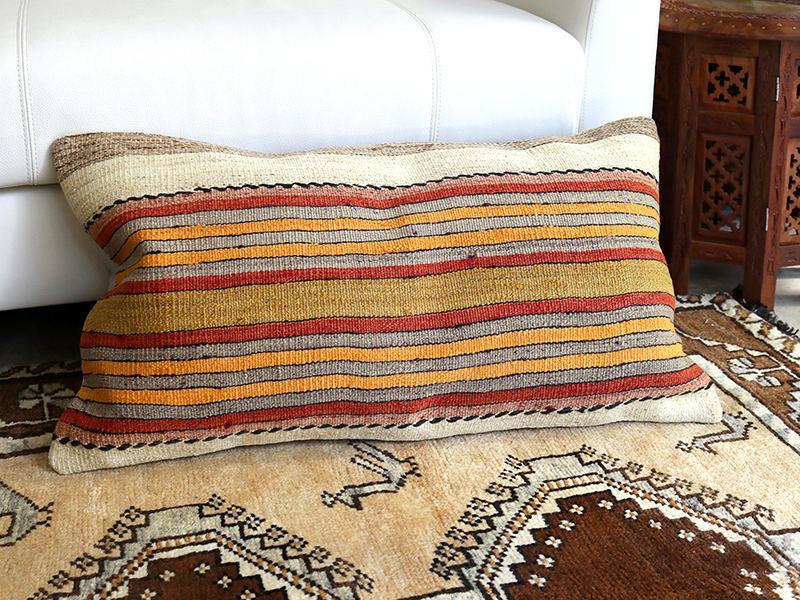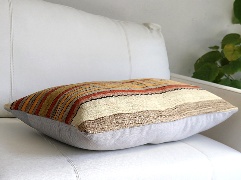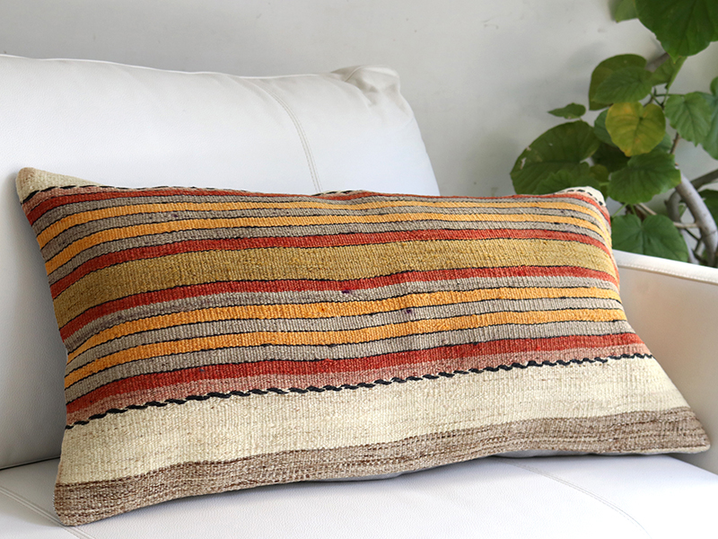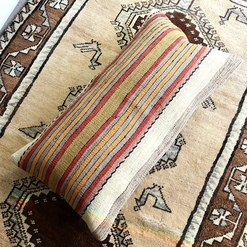 ナチュラルブラウンとアイボリーに、赤と黄色、ブルーグレーのシンプルなストライプデザインのキリム。オールドキリムの質感がありつつも、エスニック感がおさえめで、シンプルなインテリアにもマッチします。